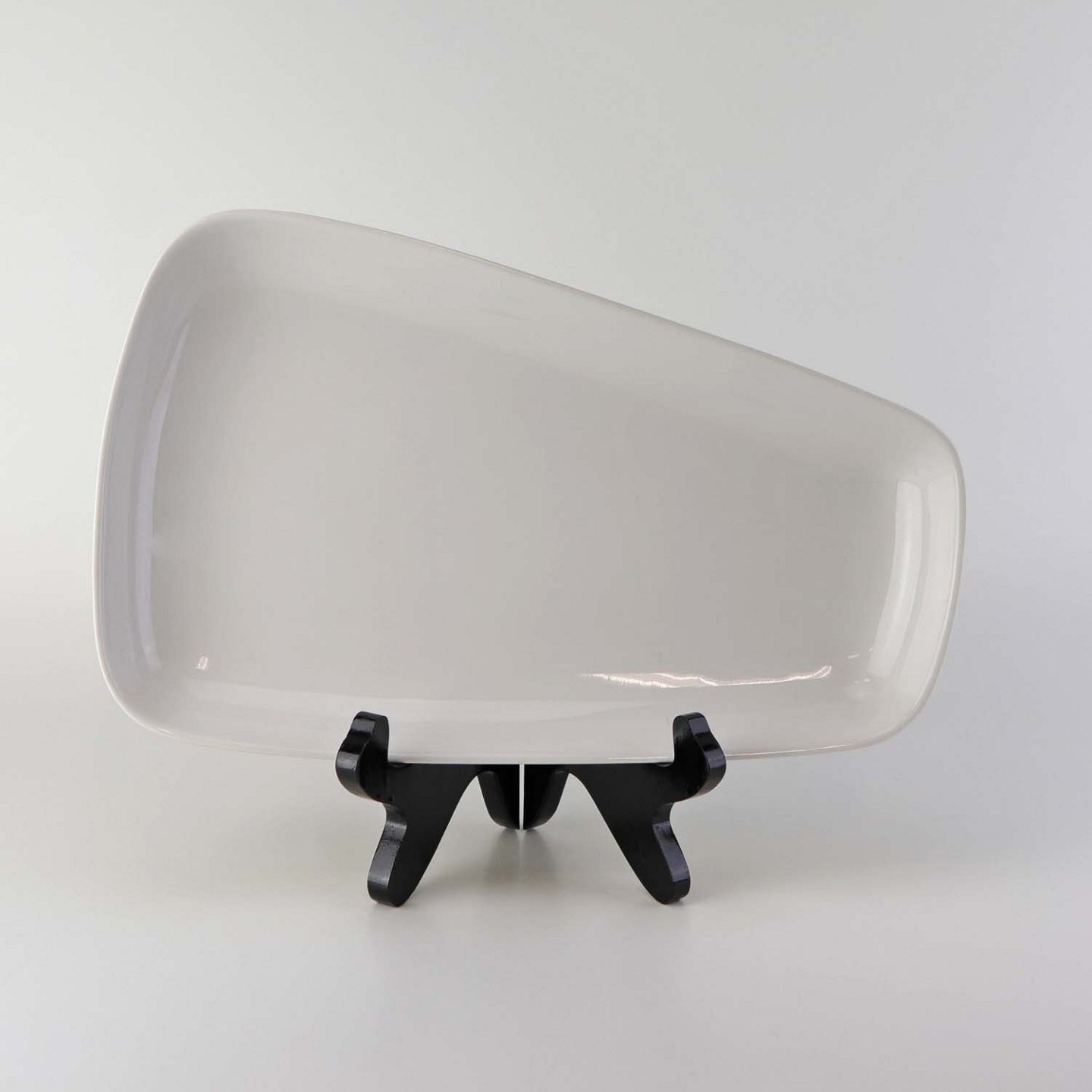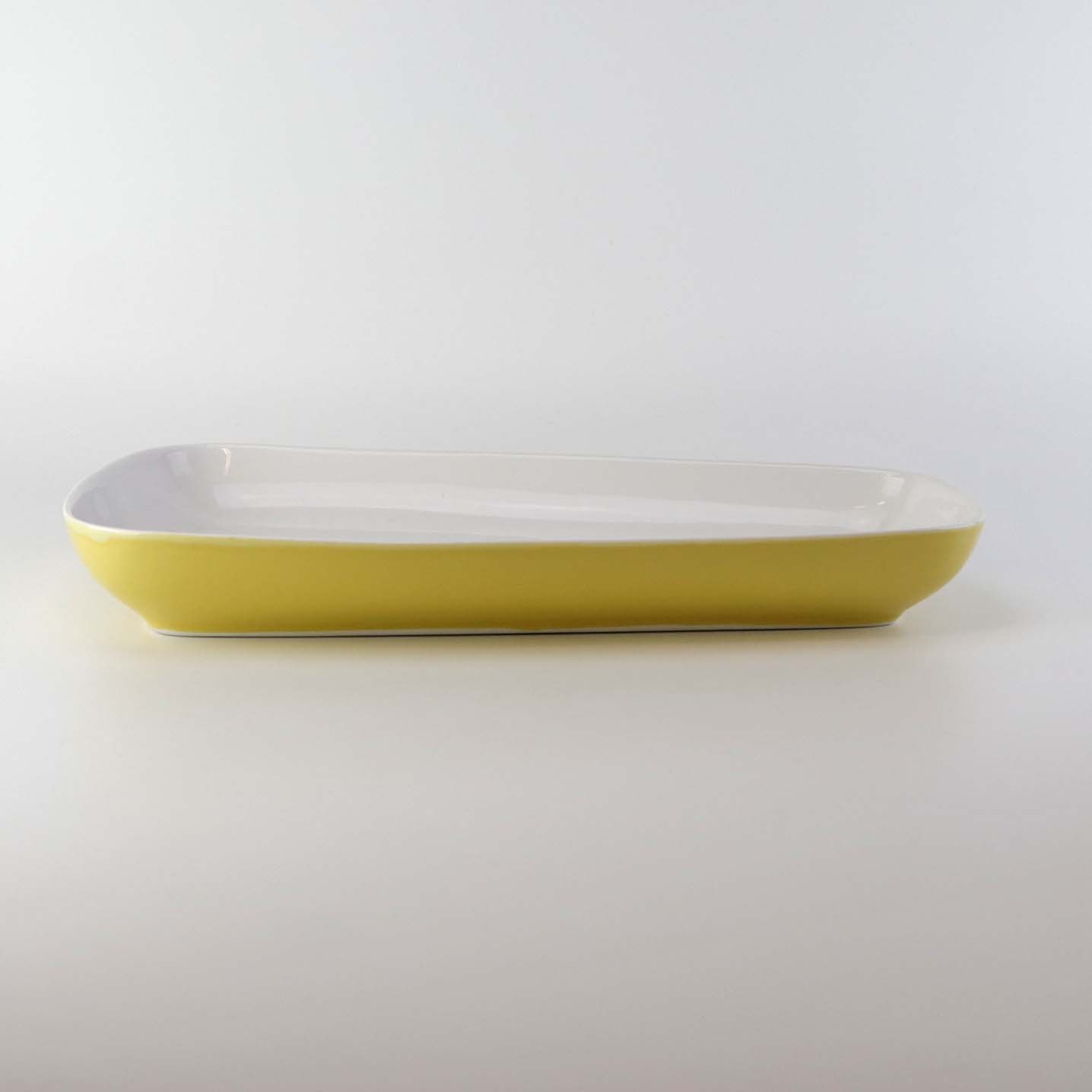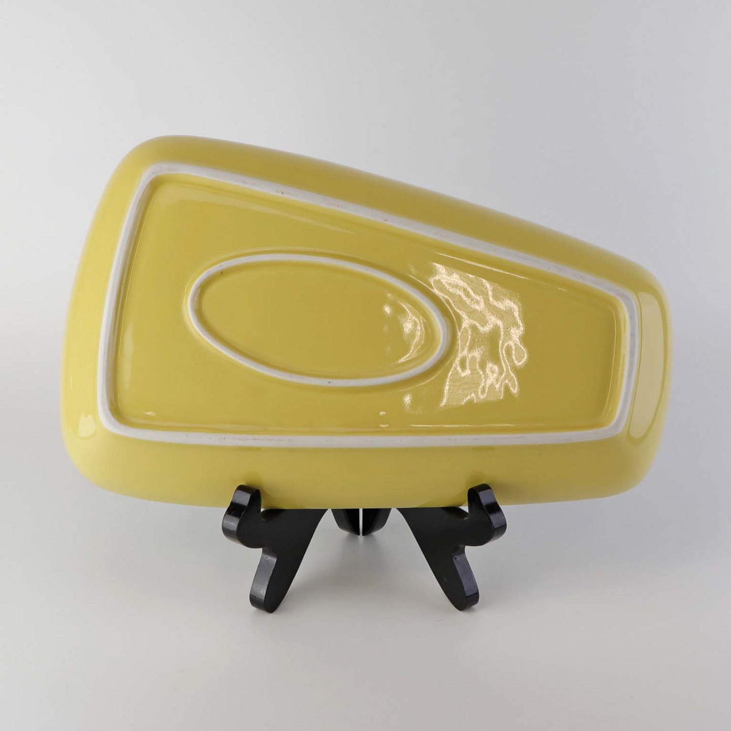Mellemstort trekantet serveringsfad i porcelæn fra stellet Gul glasurfarvet.