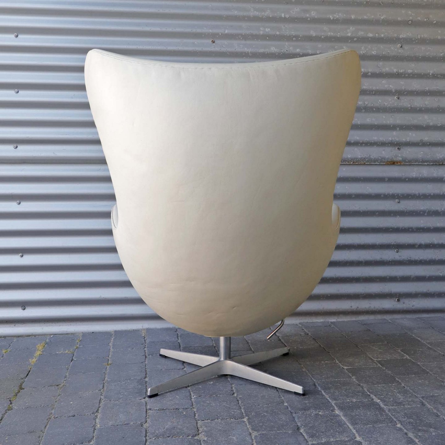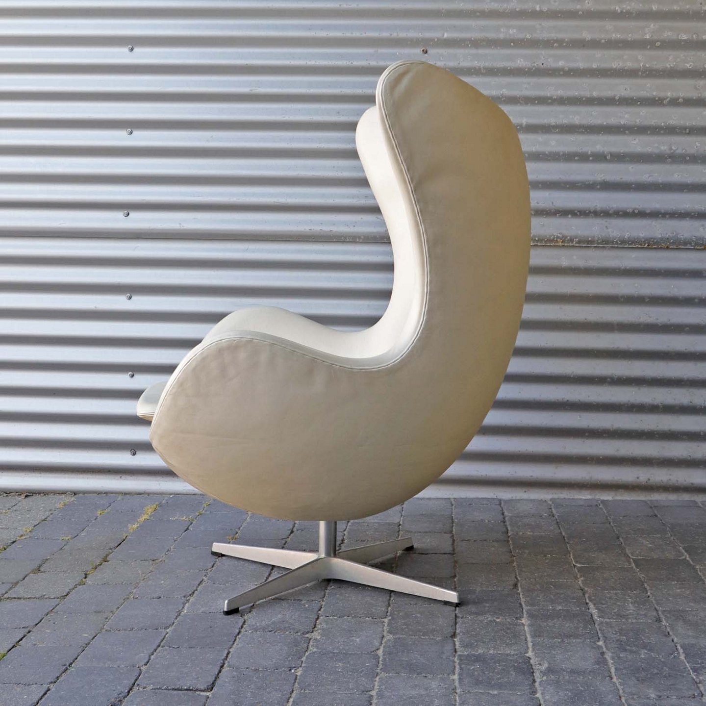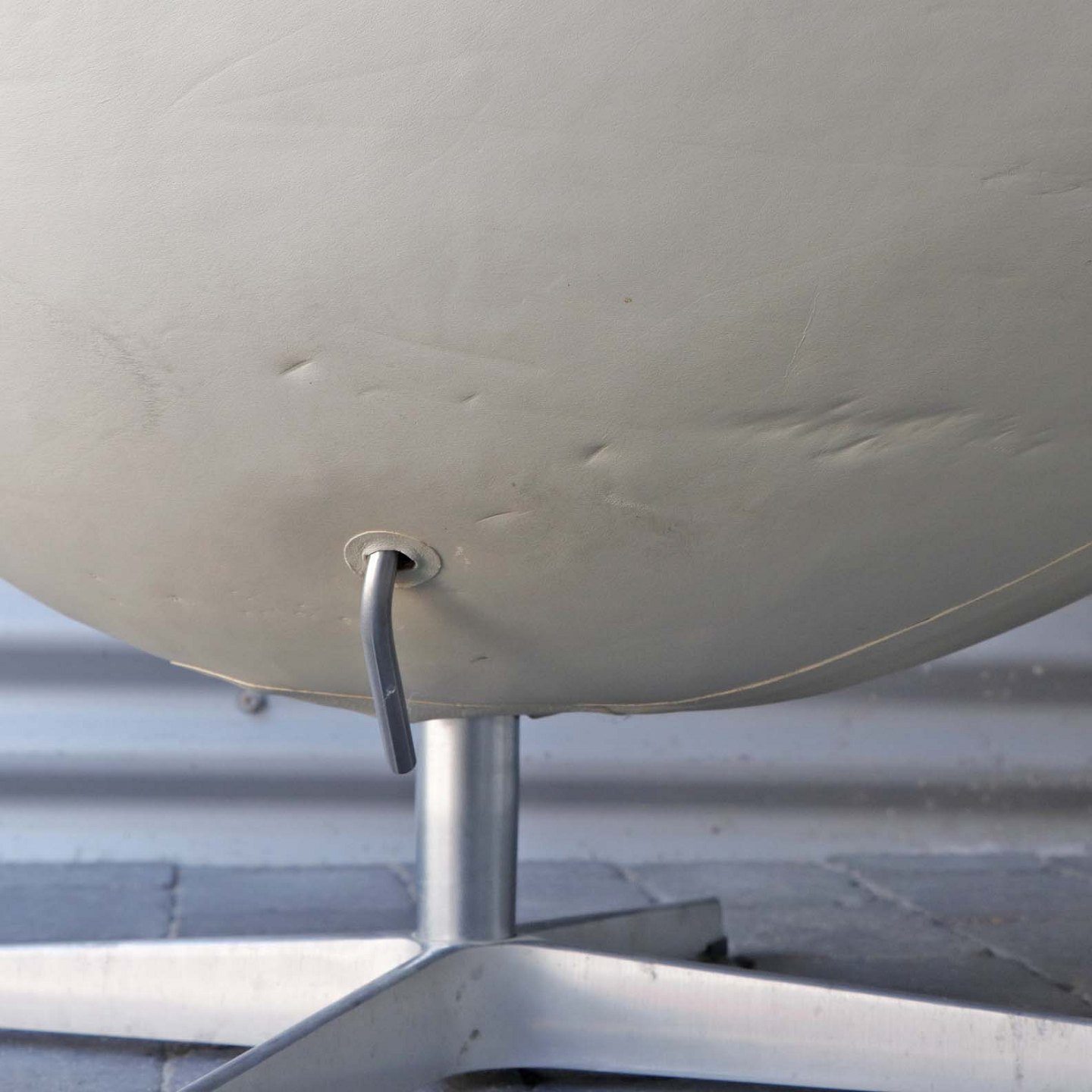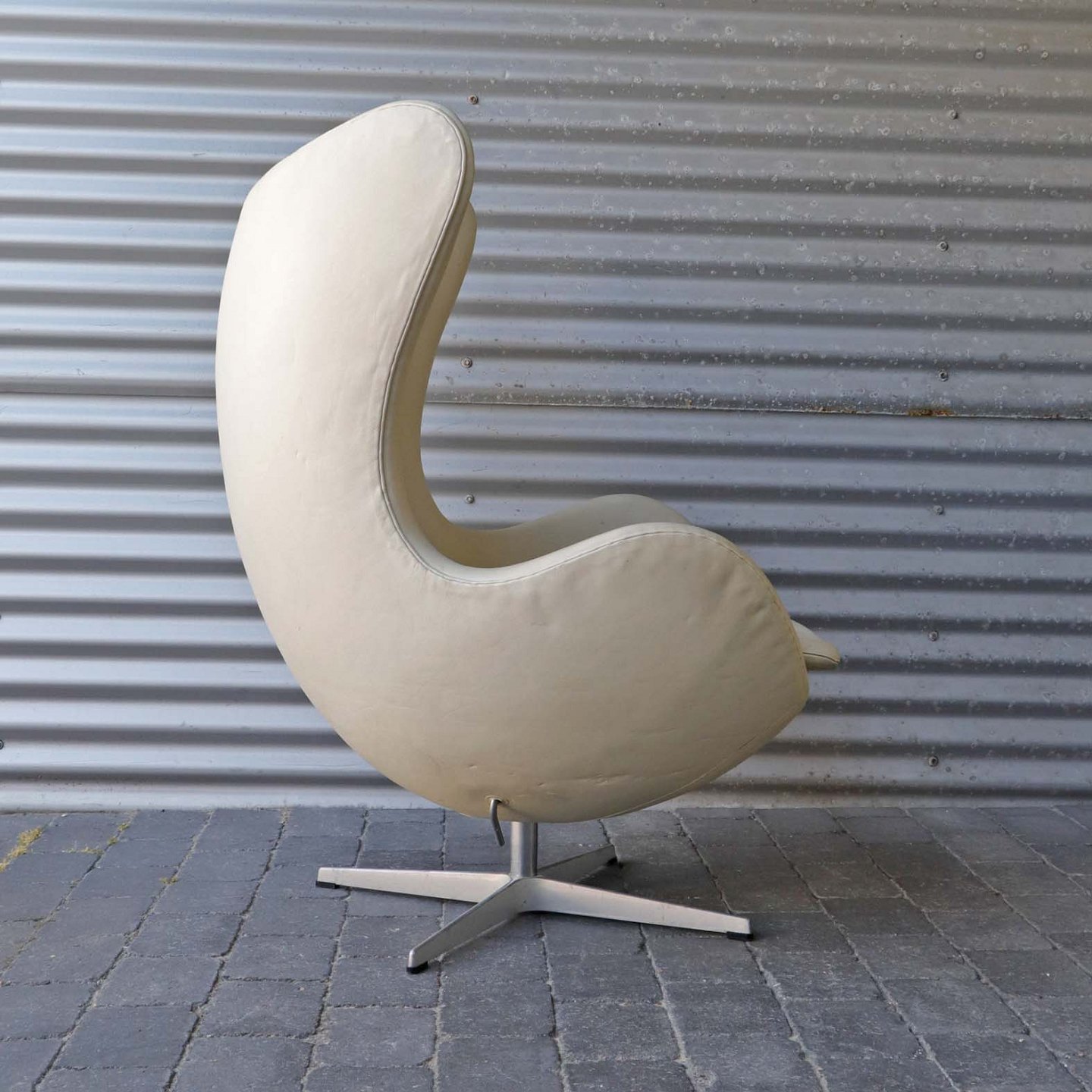 Text available in Danish: Lænestol med siddehynde som er betrukket med klassisk hvidt læder på fod i aluminium med sorte dupper. Stolen er udstyret med returdrej og vip. Model Ægget