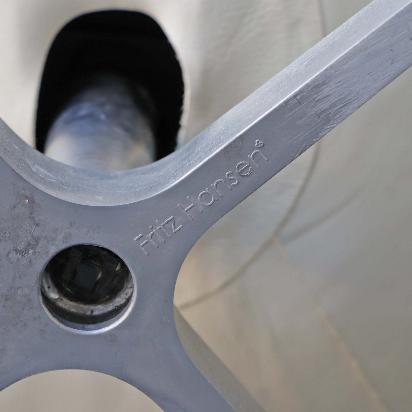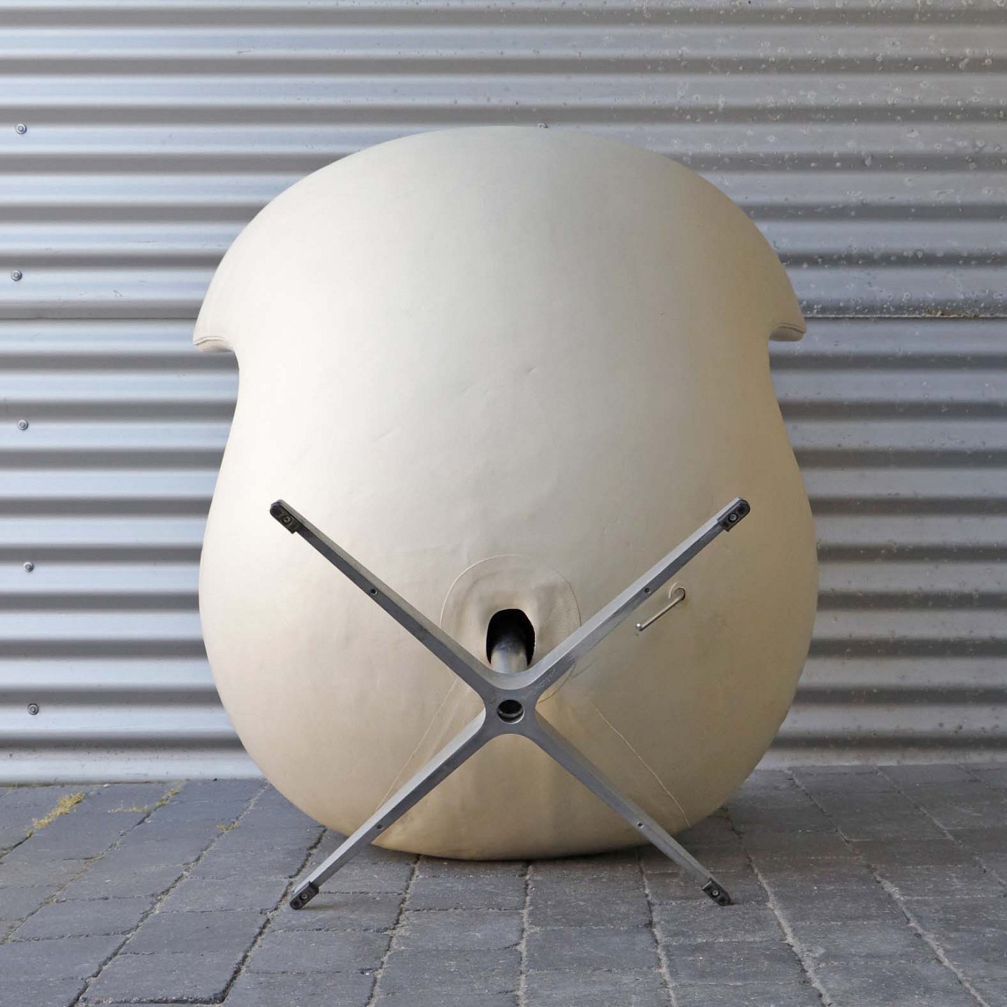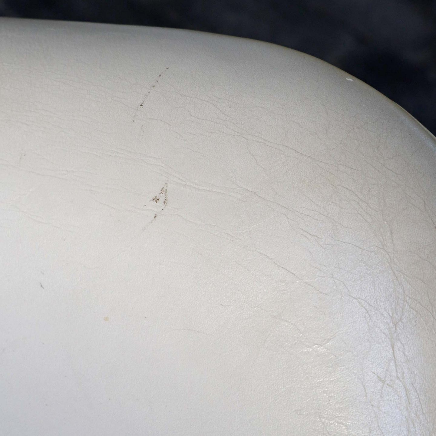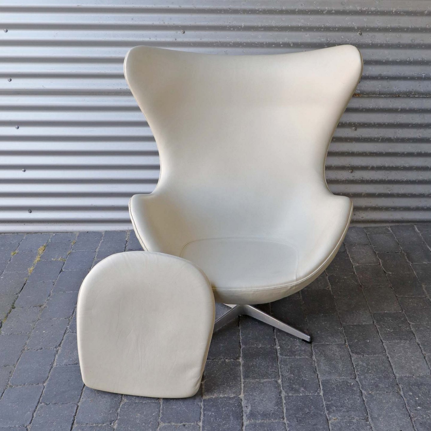 Text available in Danish: Lænestol med siddehynde som er betrukket med klassisk hvidt læder på fod i aluminium med sorte dupper. Stolen er udstyret med returdrej og vip. Model Ægget