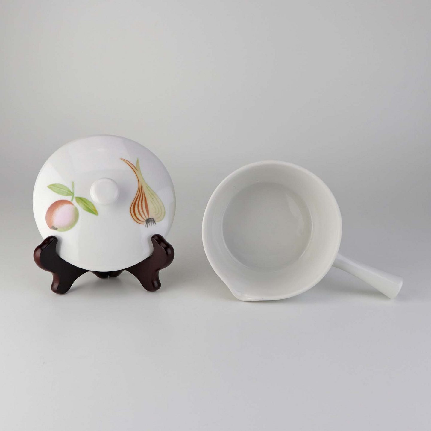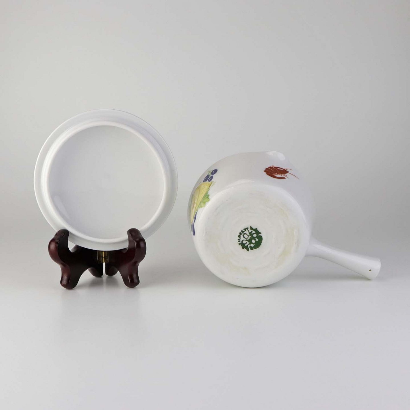 Stellet er i glat hvidt porcelæn med varierende farverige motiver af frugter og grønt.