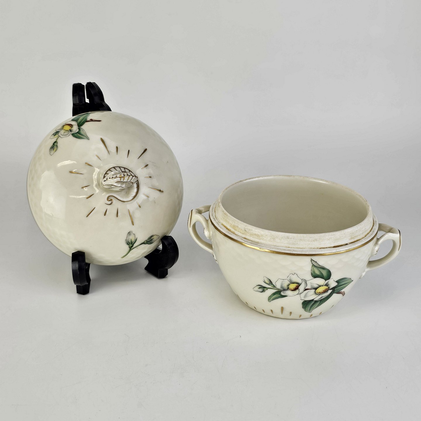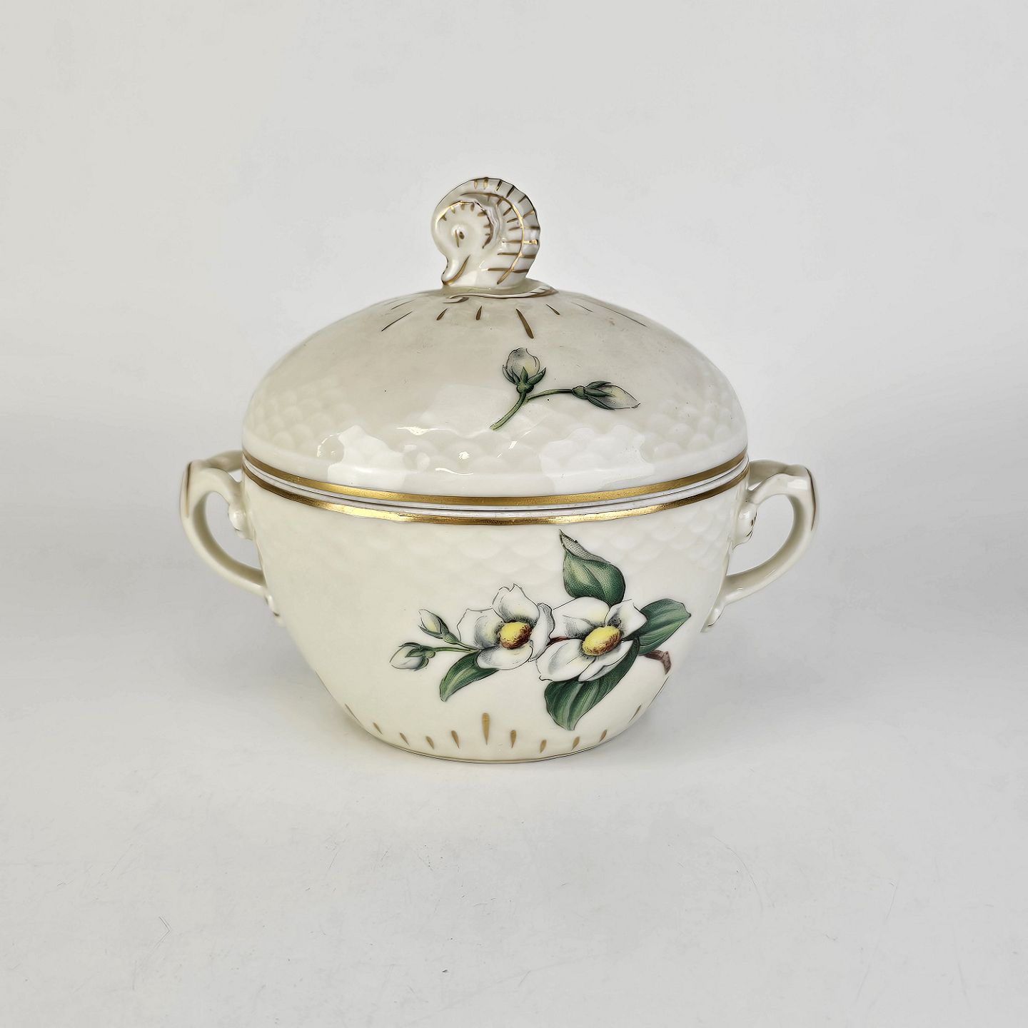 Heimdal er cremefarvet porcelæn i skælform, som dekoreret med jasminblomster, grene og en guldkant.