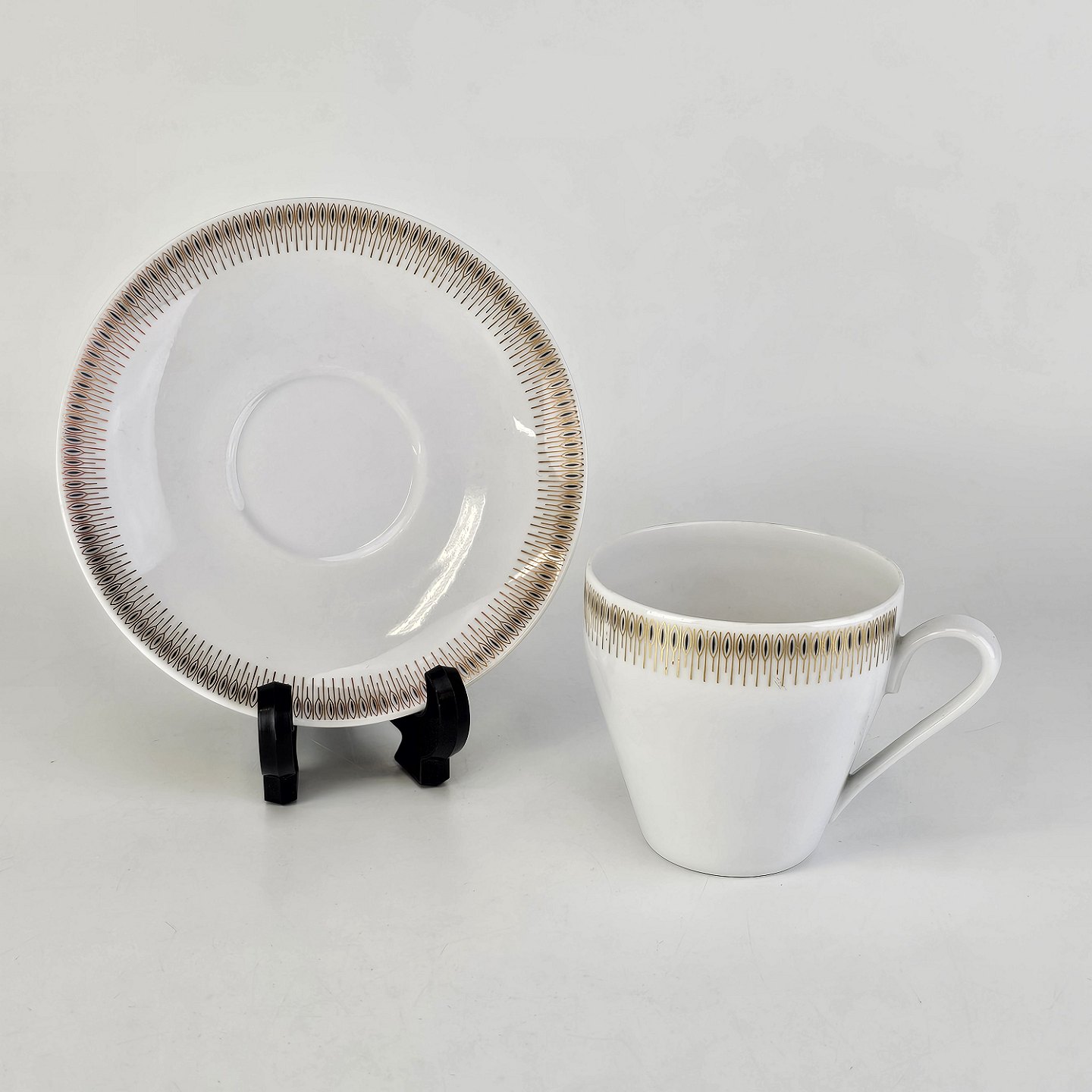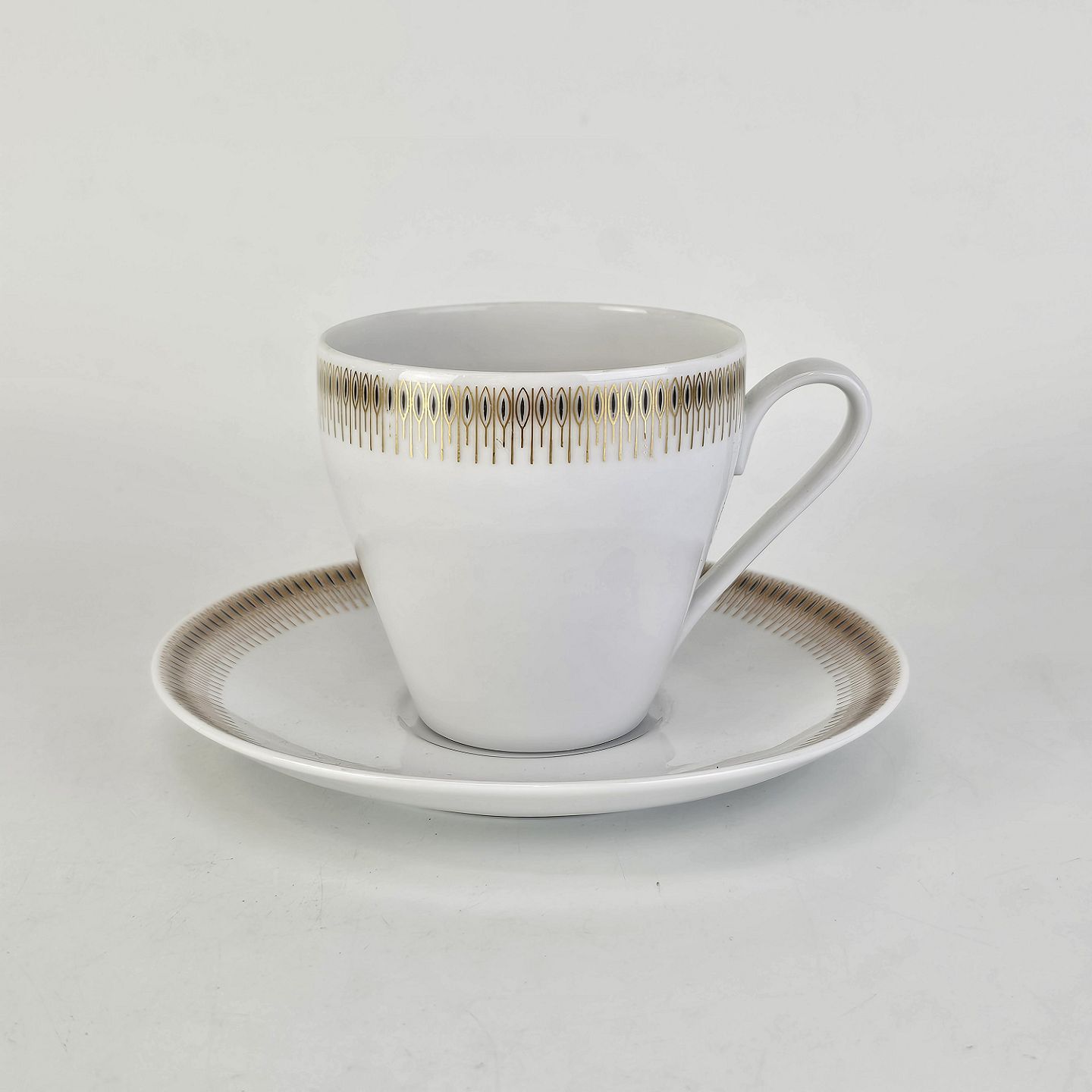 Kop med underkop i hvidt porcelæn med dekoration i guld fra stellet Trend 1220
