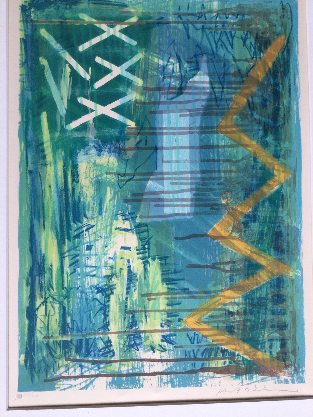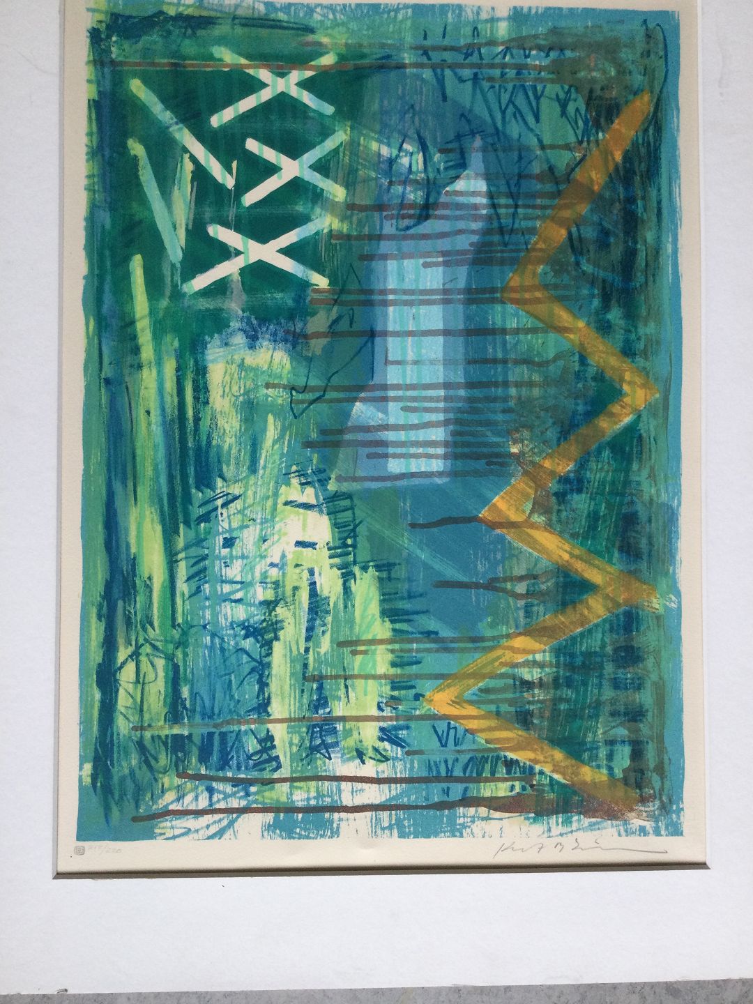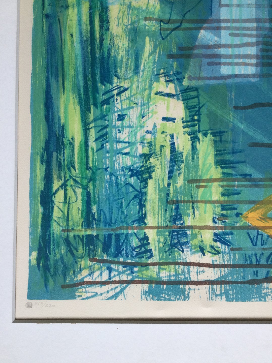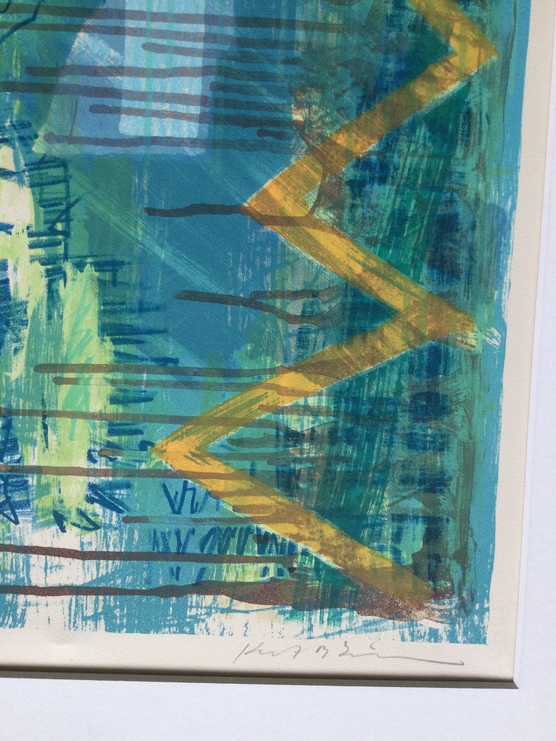 Farvelitografi på papir monteret i passepartout.