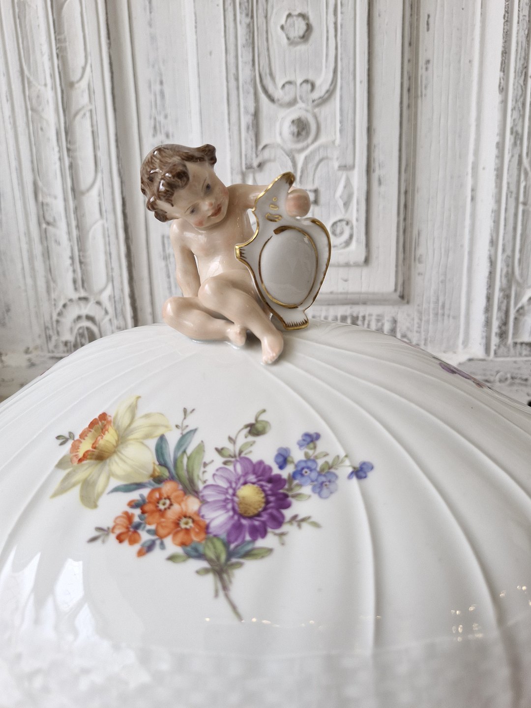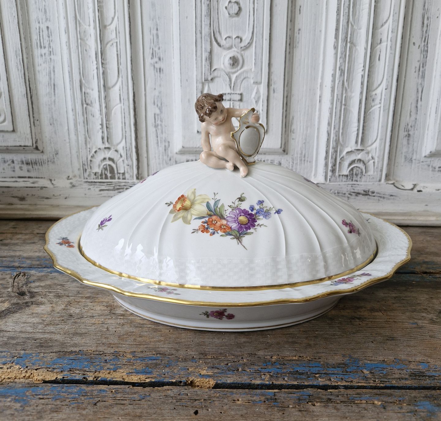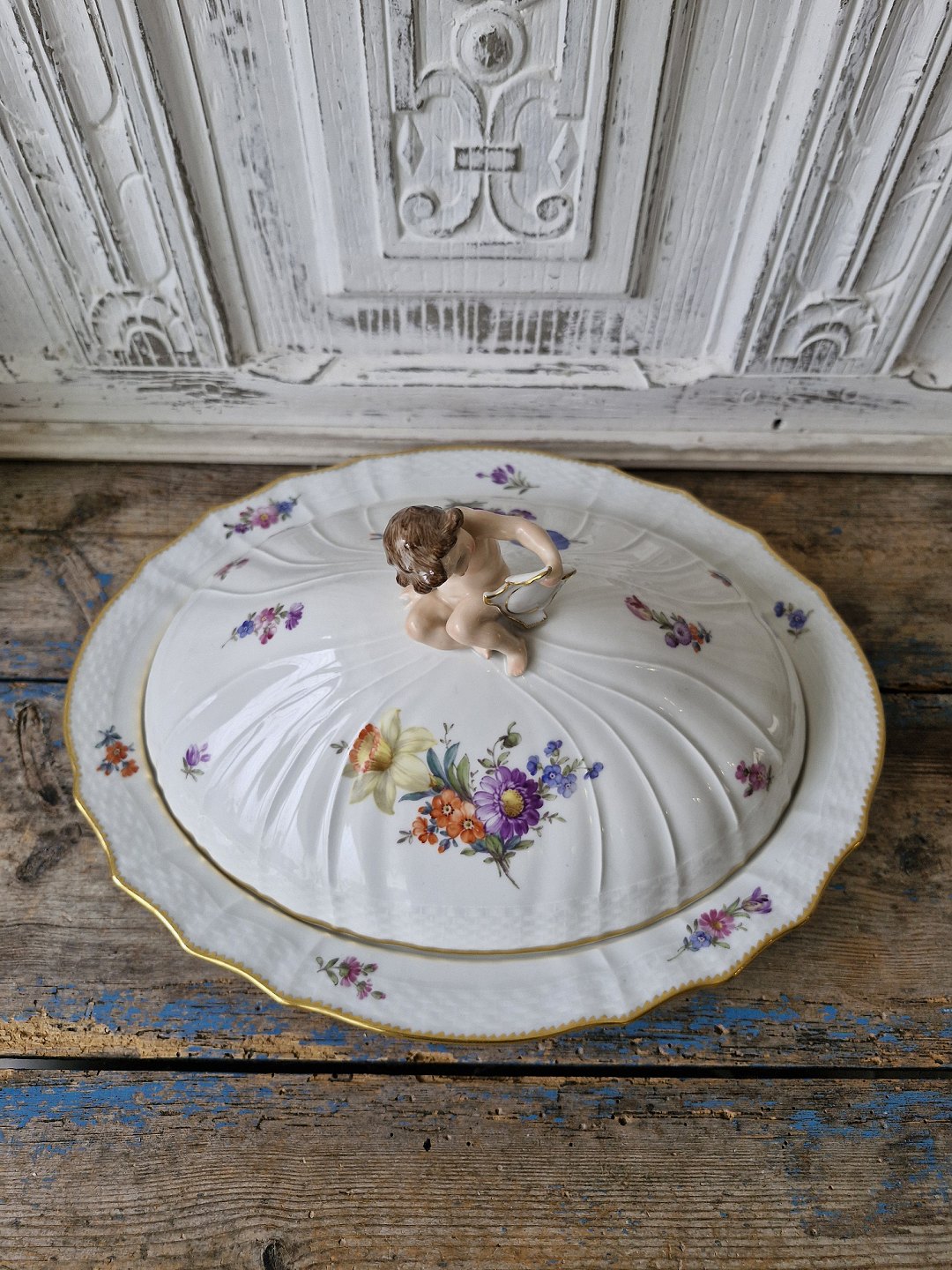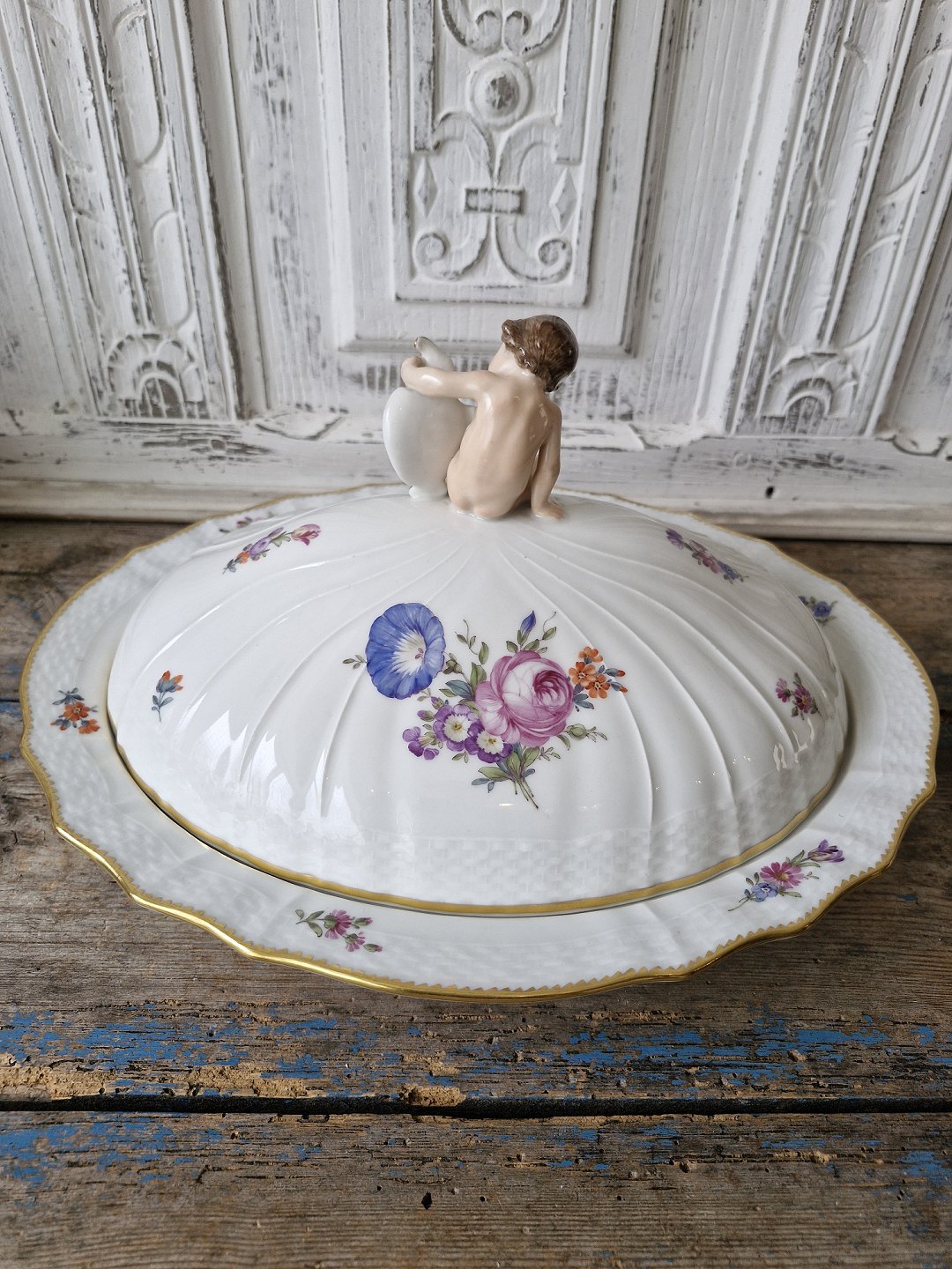 Royal Copenhagen Fuld Saksisk Blomst stort lågfad med figur af putti No. 1733, 1. sortering