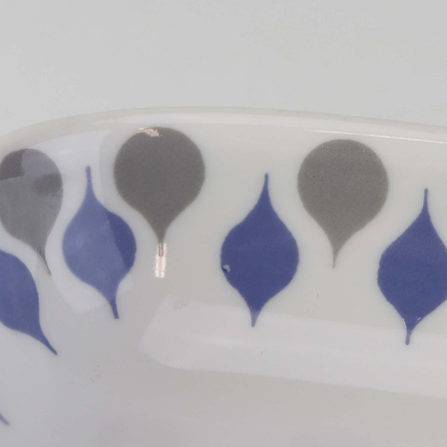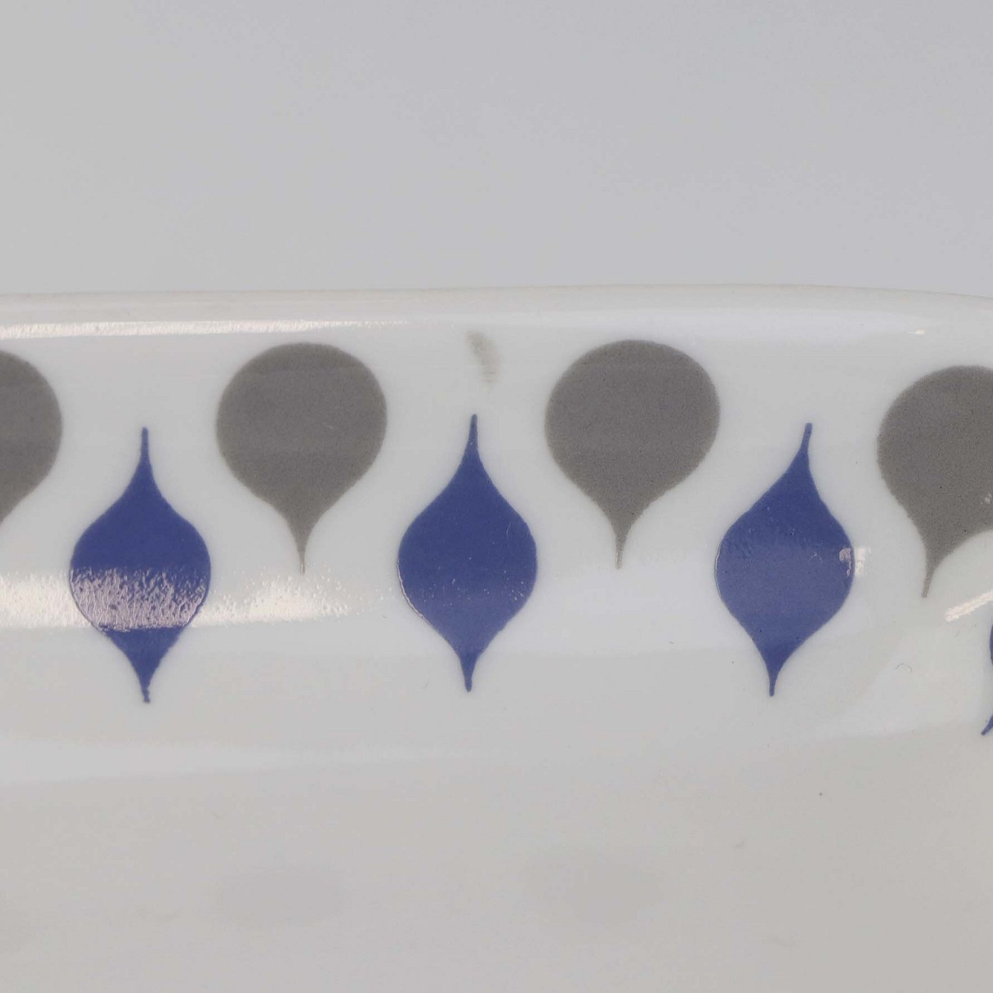Stel produceret i perioden 1961-69 fremstillet i glat hvidt porcelæn dekoreret med blå og grå dråber.