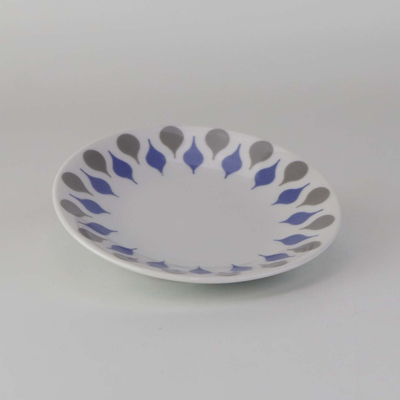 Stel produceret i perioden 1961-69 fremstillet i glat hvidt porcelæn dekoreret med blå og grå dråber.