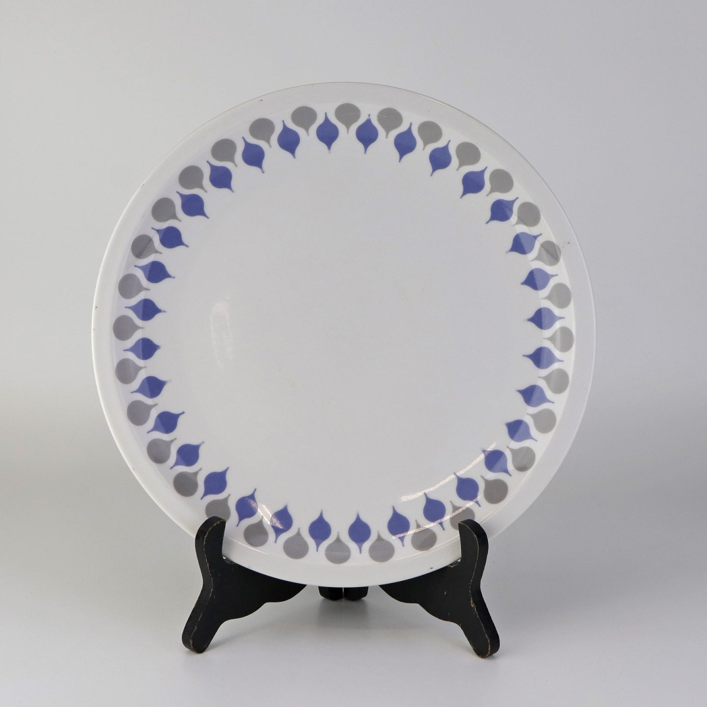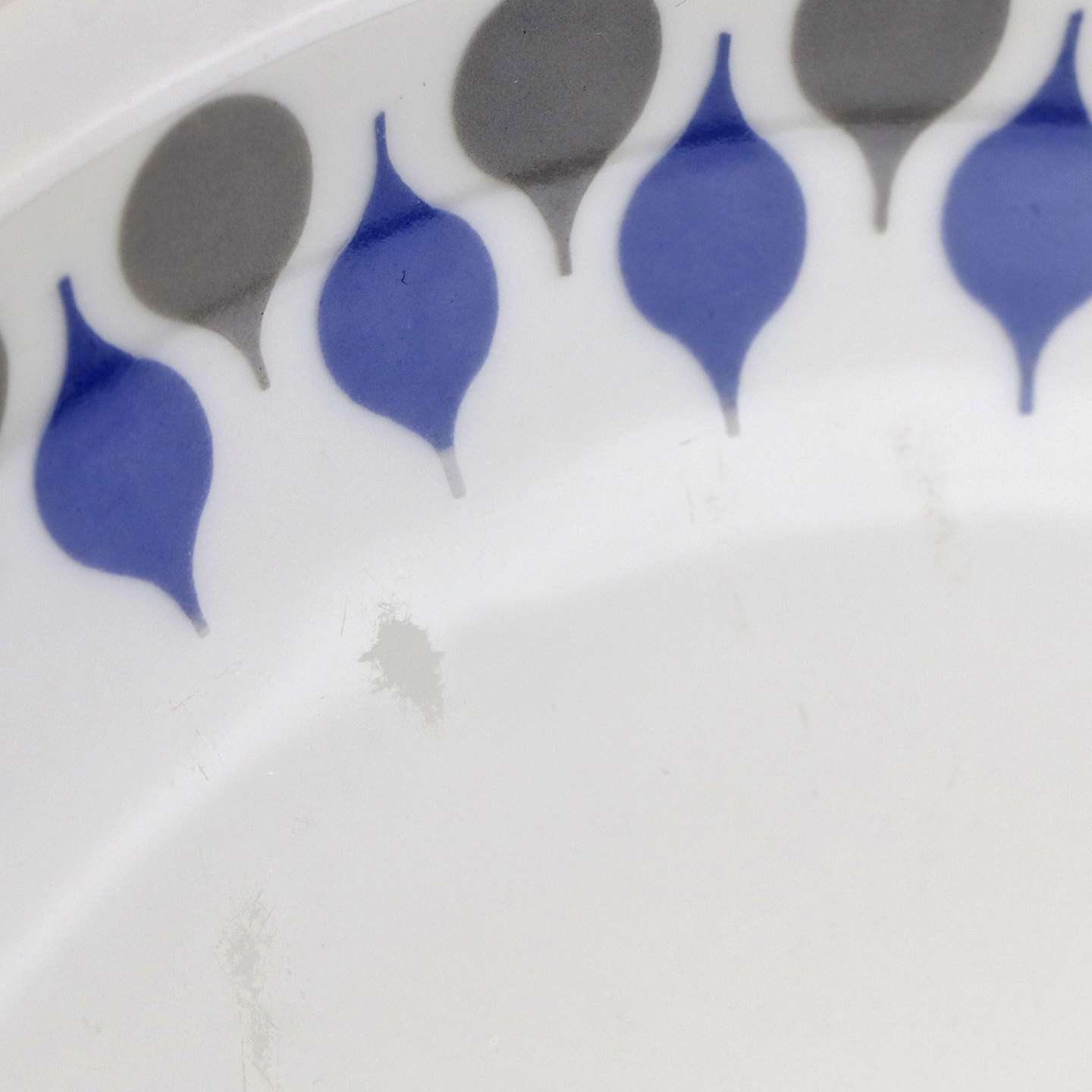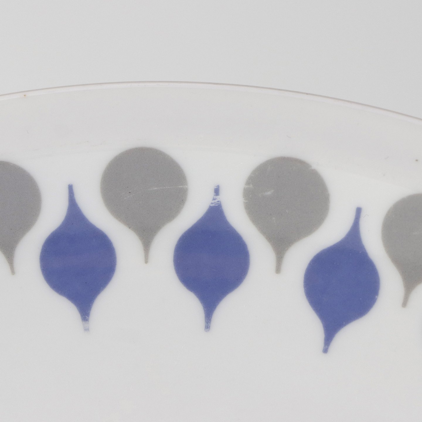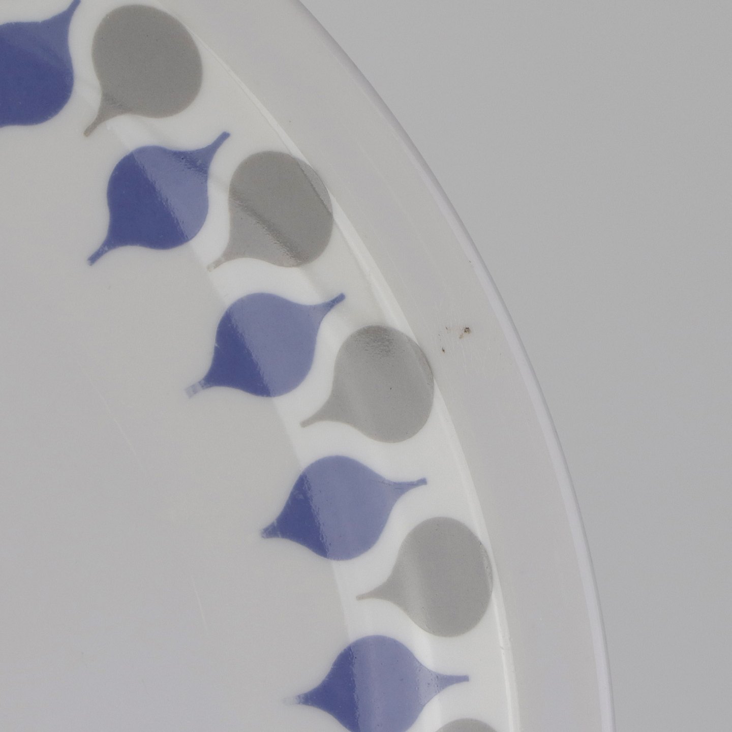 Stel produceret i perioden 1961-69 fremstillet i glat hvidt porcelæn dekoreret med blå og grå dråber.