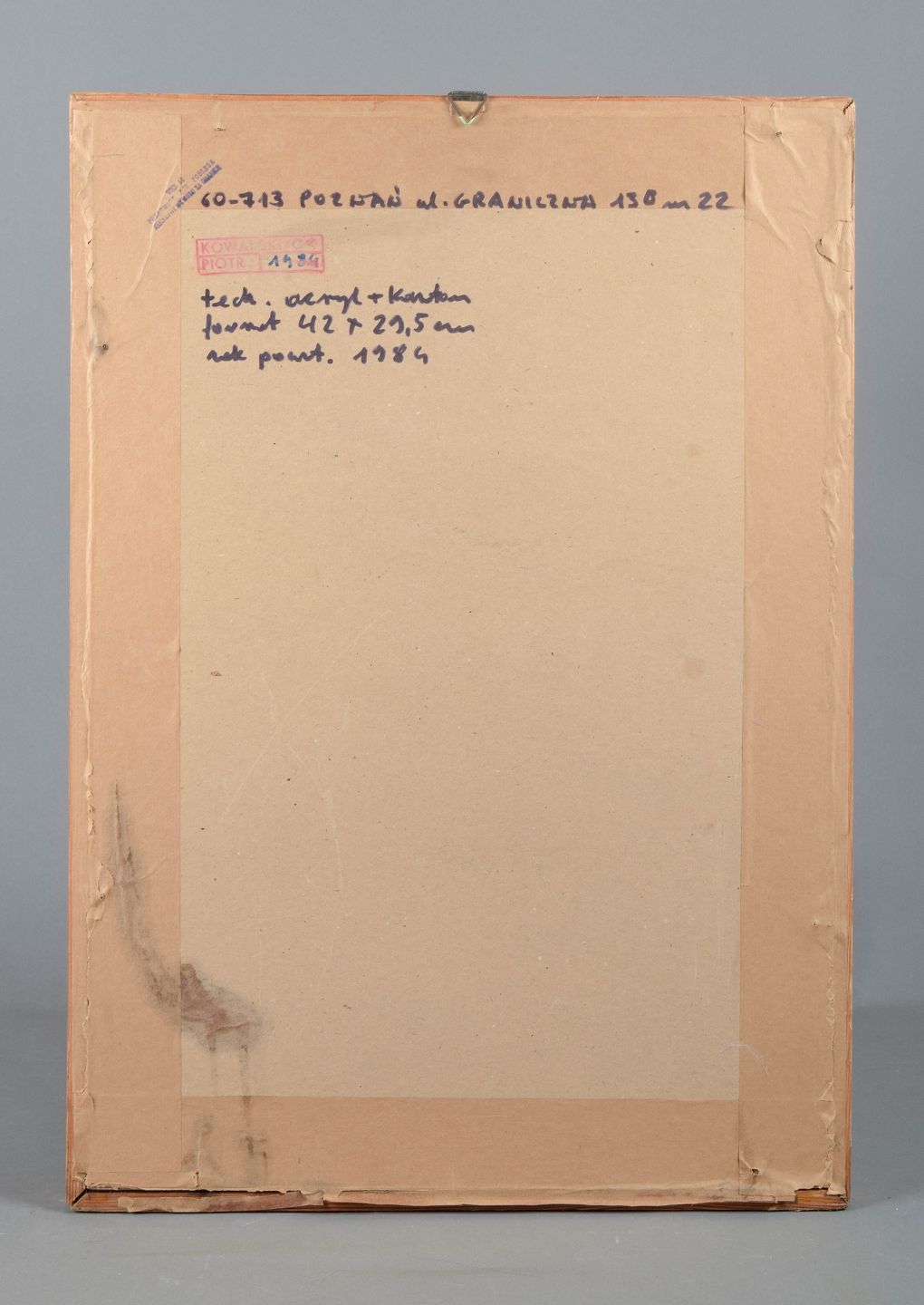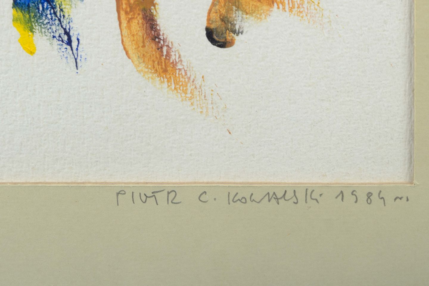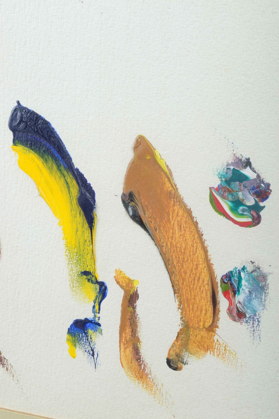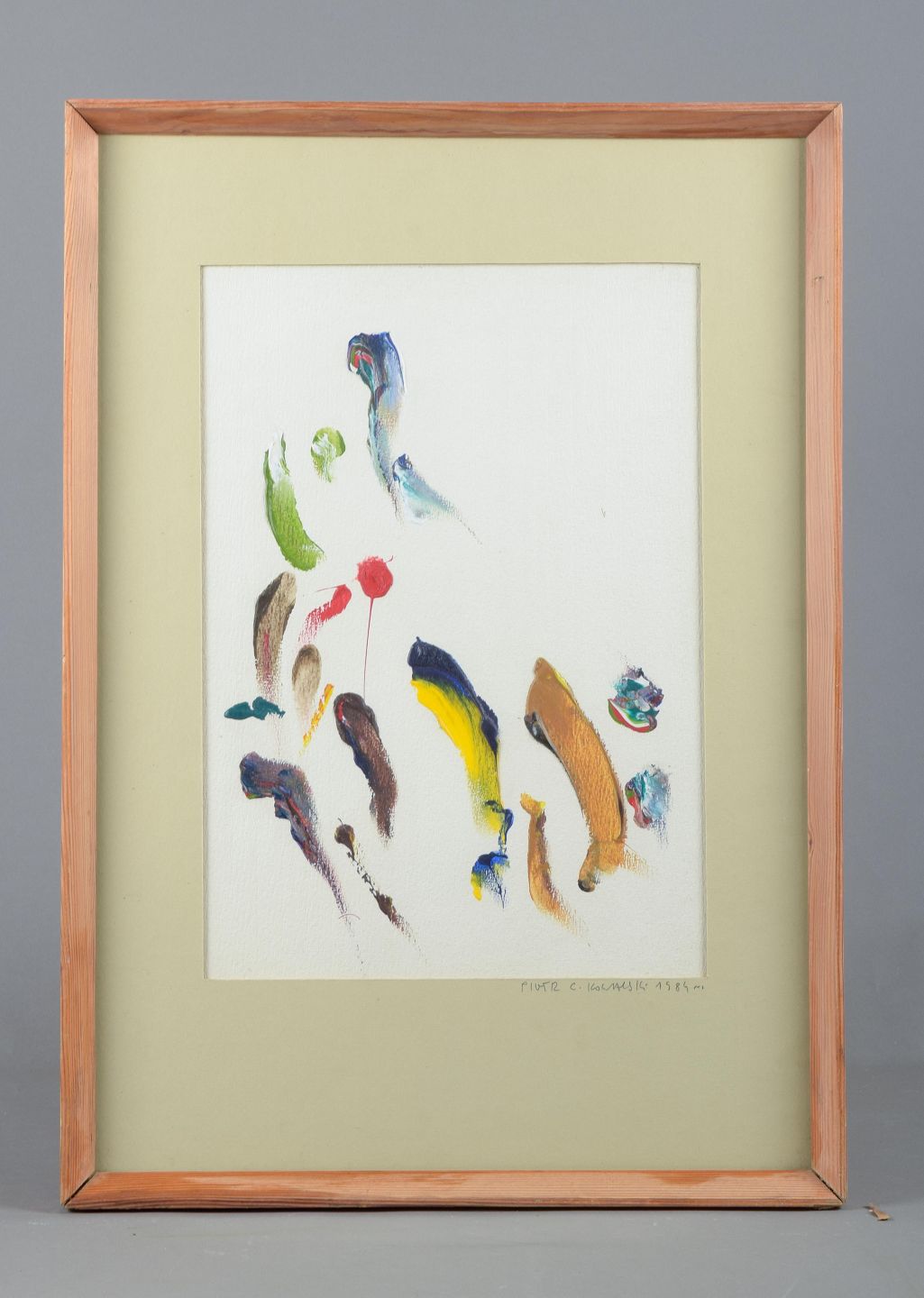 Abstrakt komposition udført i akryl på karton. Dynamiske penselstrøg i stærke farver som blå, grøn, gul og rød, arrangeret i en let og spontan komposition. Signeret og dateret “Piotr C. Kowalski 1984” nederst. Indrammet.