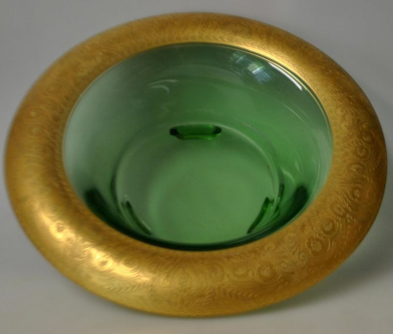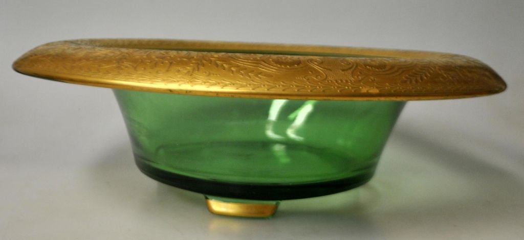 Art deco bordskål, L. Moser & Söhne, Karlsbad, ca. 1920. Frugtskål af grønt glas med forgyldt kant. Kantdekoration i form af blomster. Forgyldning på de tre ben. H.: 9 cm. Dia.: 28 cm.