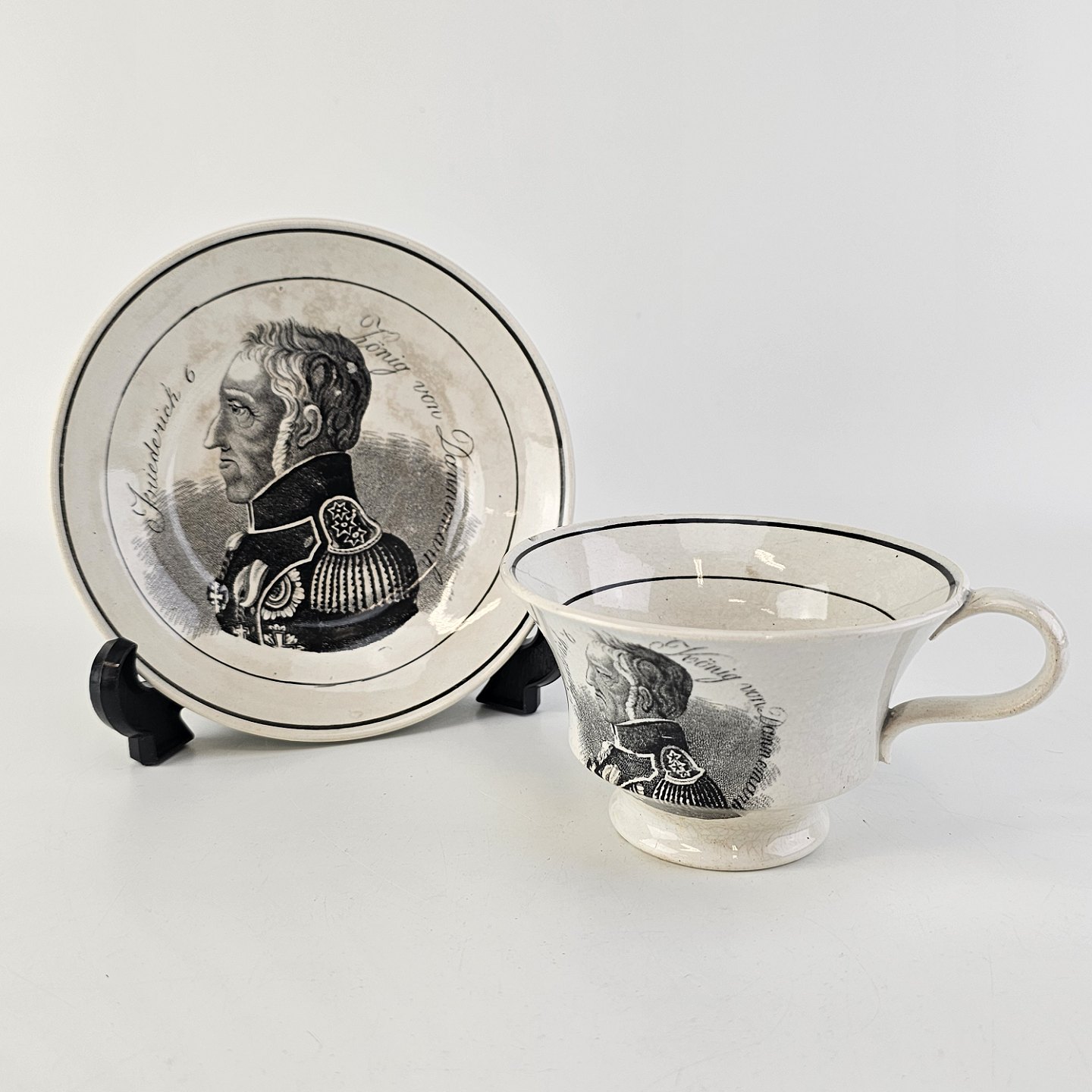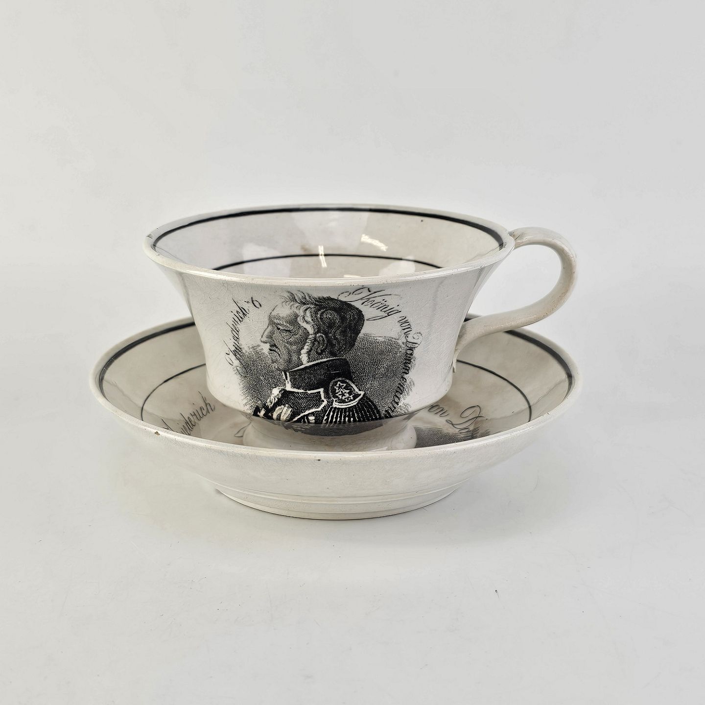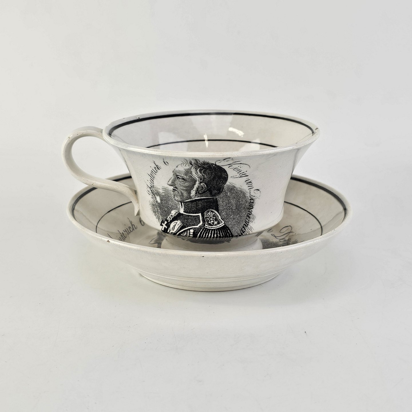 Text available in Danish: Kop og underkop af fajance med motiv af kong Frederik d. 6. af Danmark og tysk tekst. Formentlig tysk produceret til danske marked før der var en produktion i Danmark