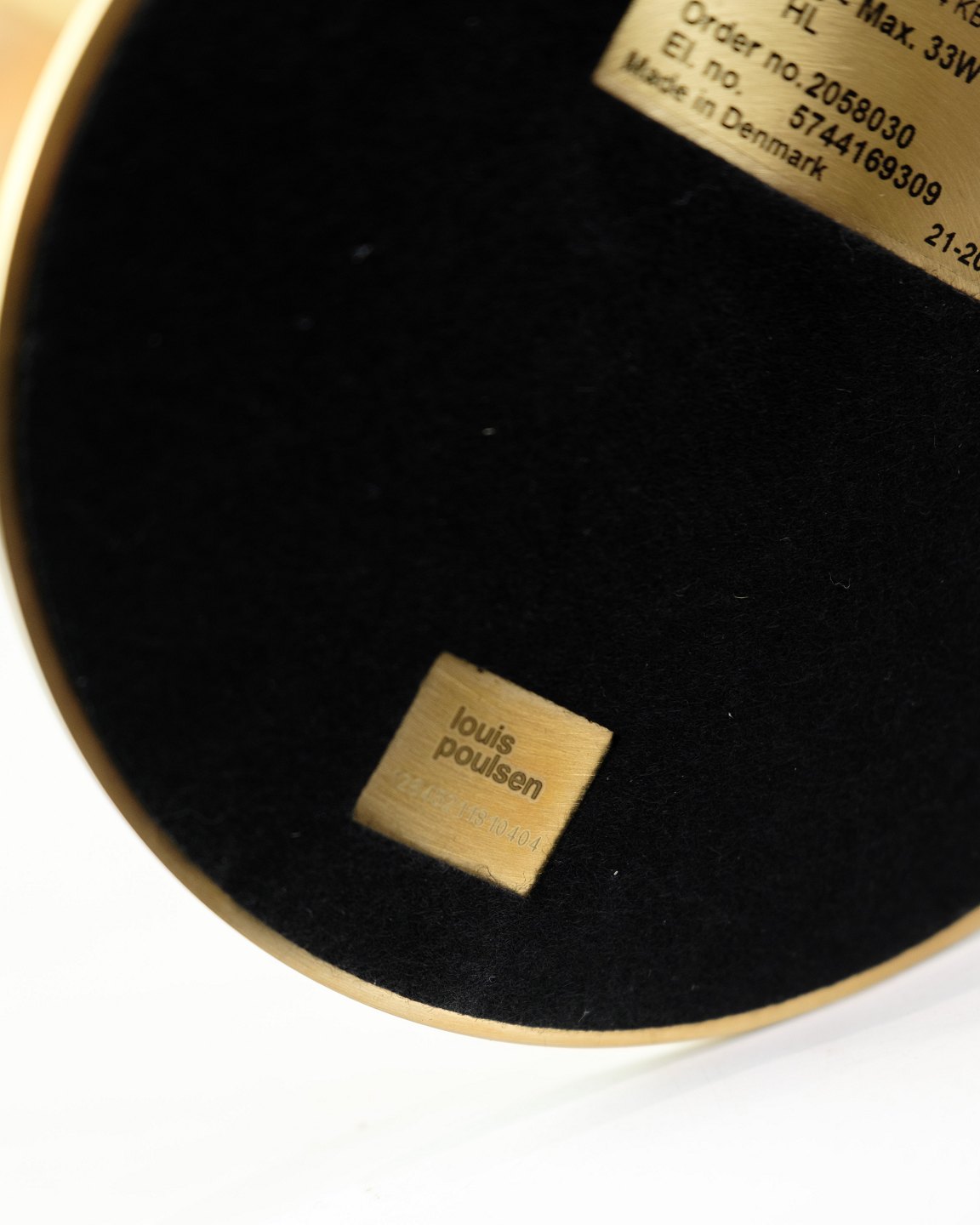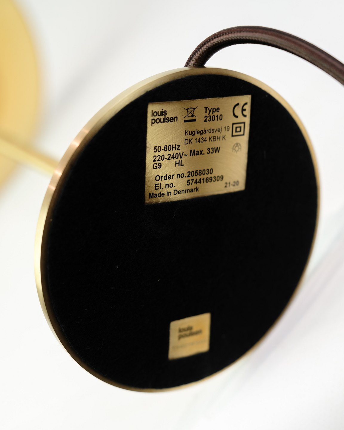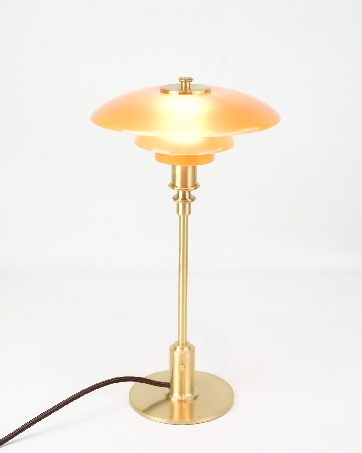 PH bordlampe, model PH 2/1, designet af Poul Henningsen og produceret af Louis Poulsen som en limited edition. Lampen er udført i messing med mundblæste ravfarvede glas-skærme, der giver et varmt og behageligt lys.