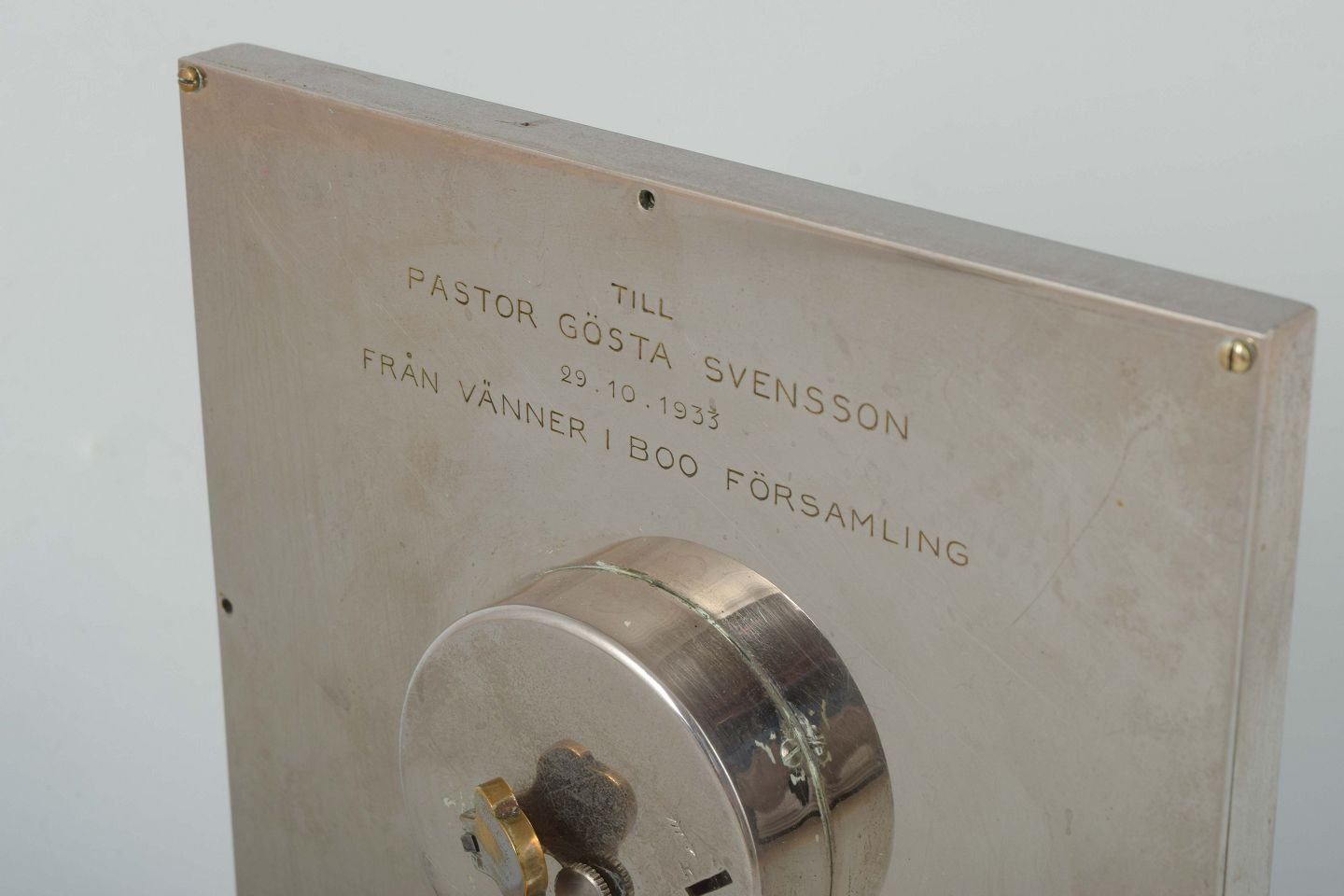 Elegant square-shaped manuel clock on a rectangular base with geometric Art Deco design. Dial with painted black stylised numerals and blued steel hands. Reverse engraved inscription: “Till Pastor Gösta Svensson 29.10.1933 från vänner i Boo församling.”