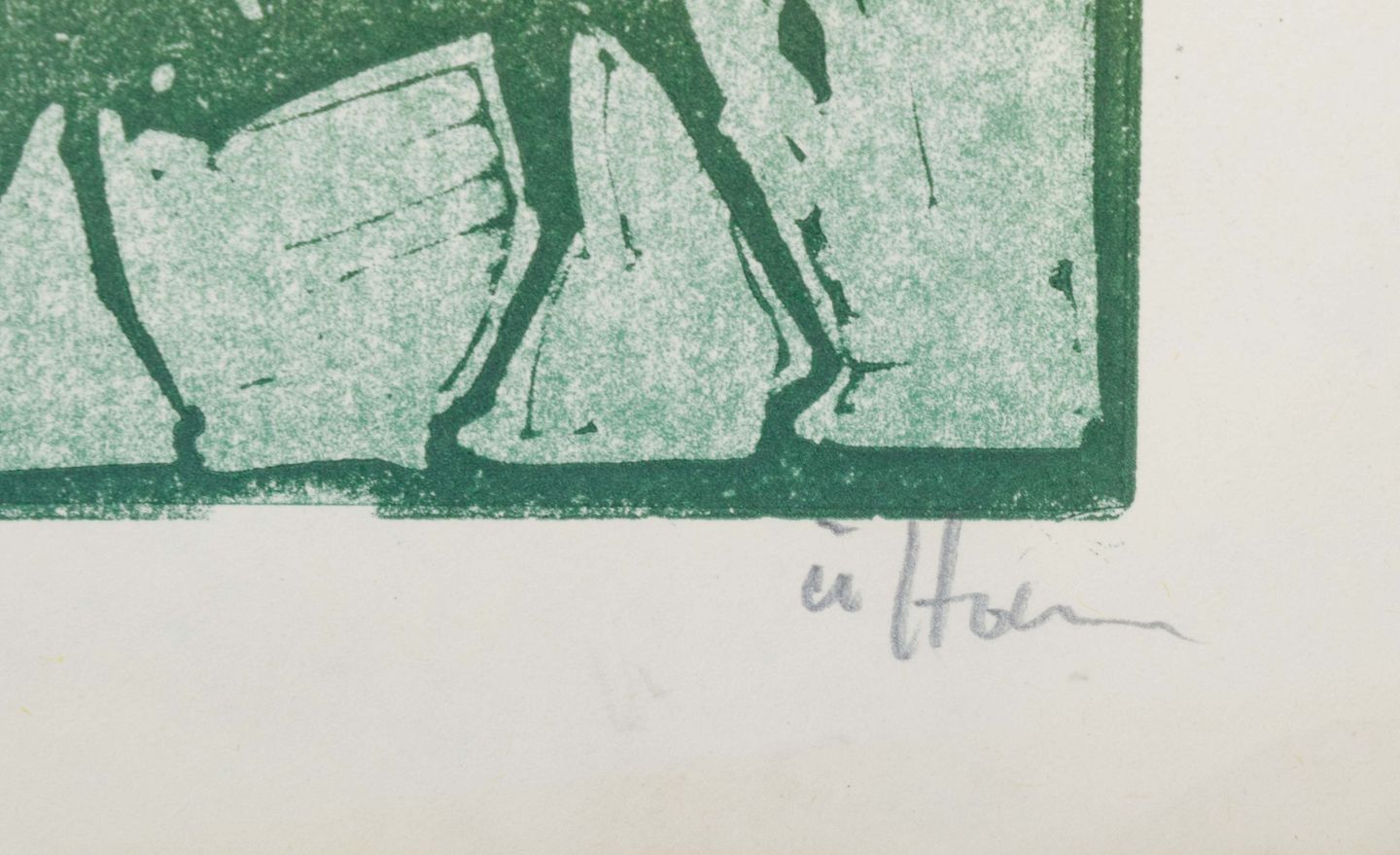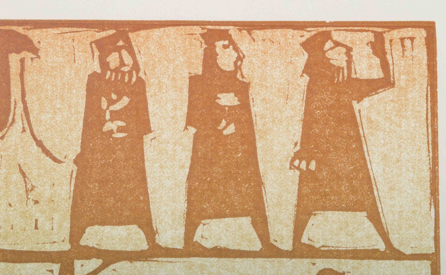 Et stemningsfuldt træsnit af Åke Holm, hvor religiøse motiver gengives i en monumental og stiliseret form, forstærket af den farverige trykteknik.