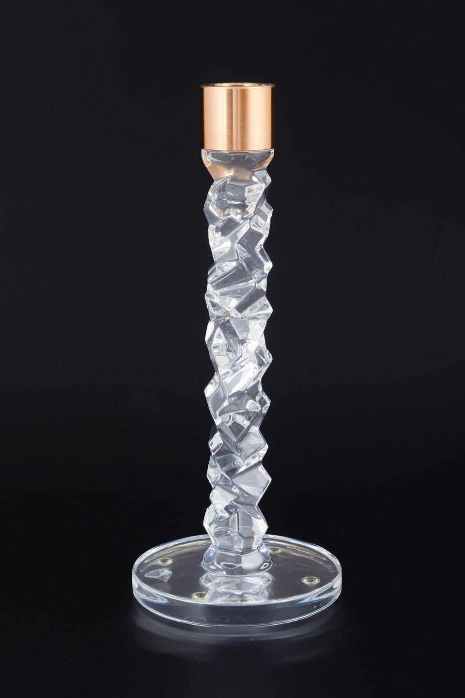 Krystalstage i presset og slebet glas med kobberindsats til lys. Stagens skaft er udformet i et skulpturelt, krystallinsk mønster, der reflekterer lyset smukt.