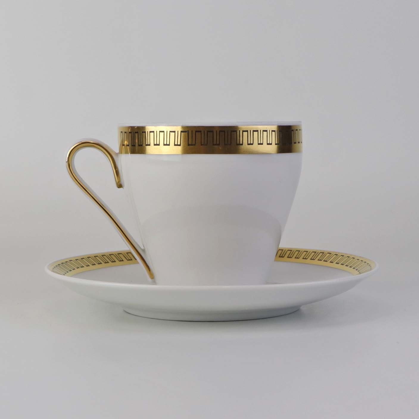 Stel i glat hvidt porcelæn dekoreret med sort streg i guldbort.