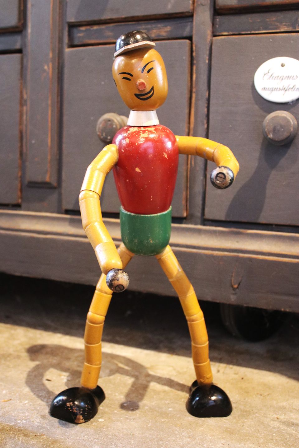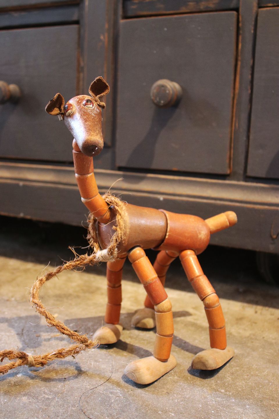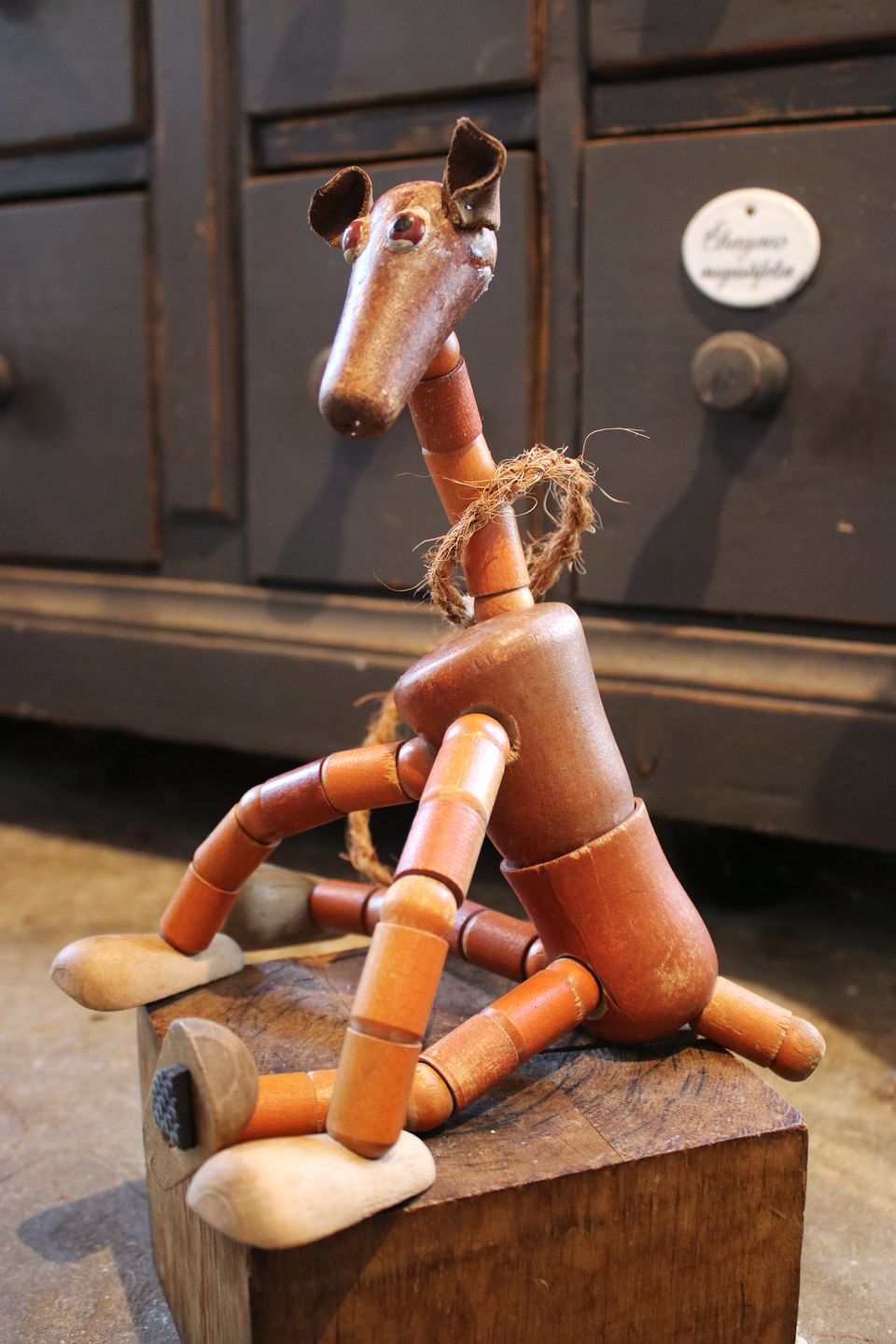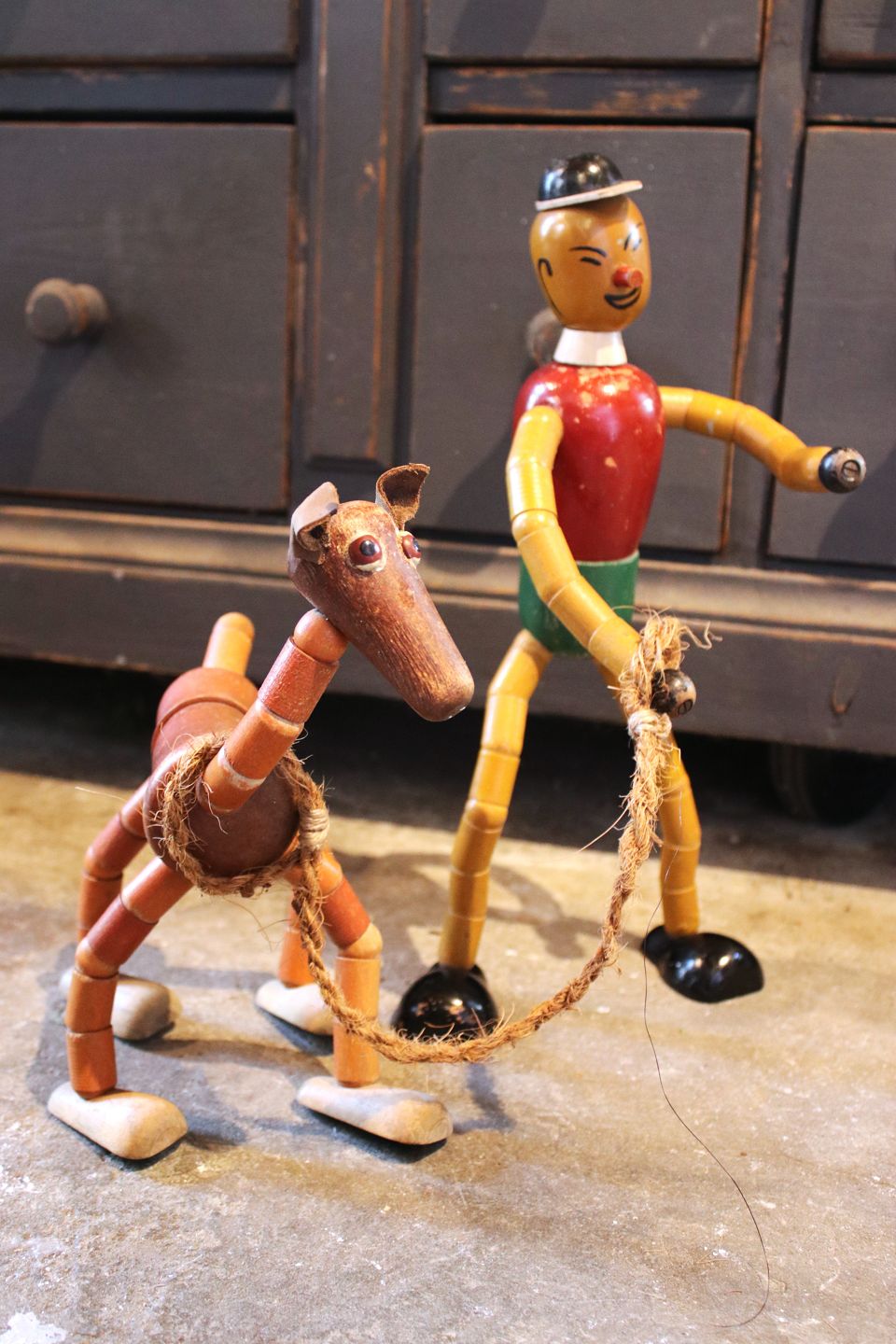 Decorative old wooden doll and dog from the 50s with bendable arms and legs. Wooden doll height: 36cm. Wooden dog H: 28cm. L: 22cm. They are sold individually.