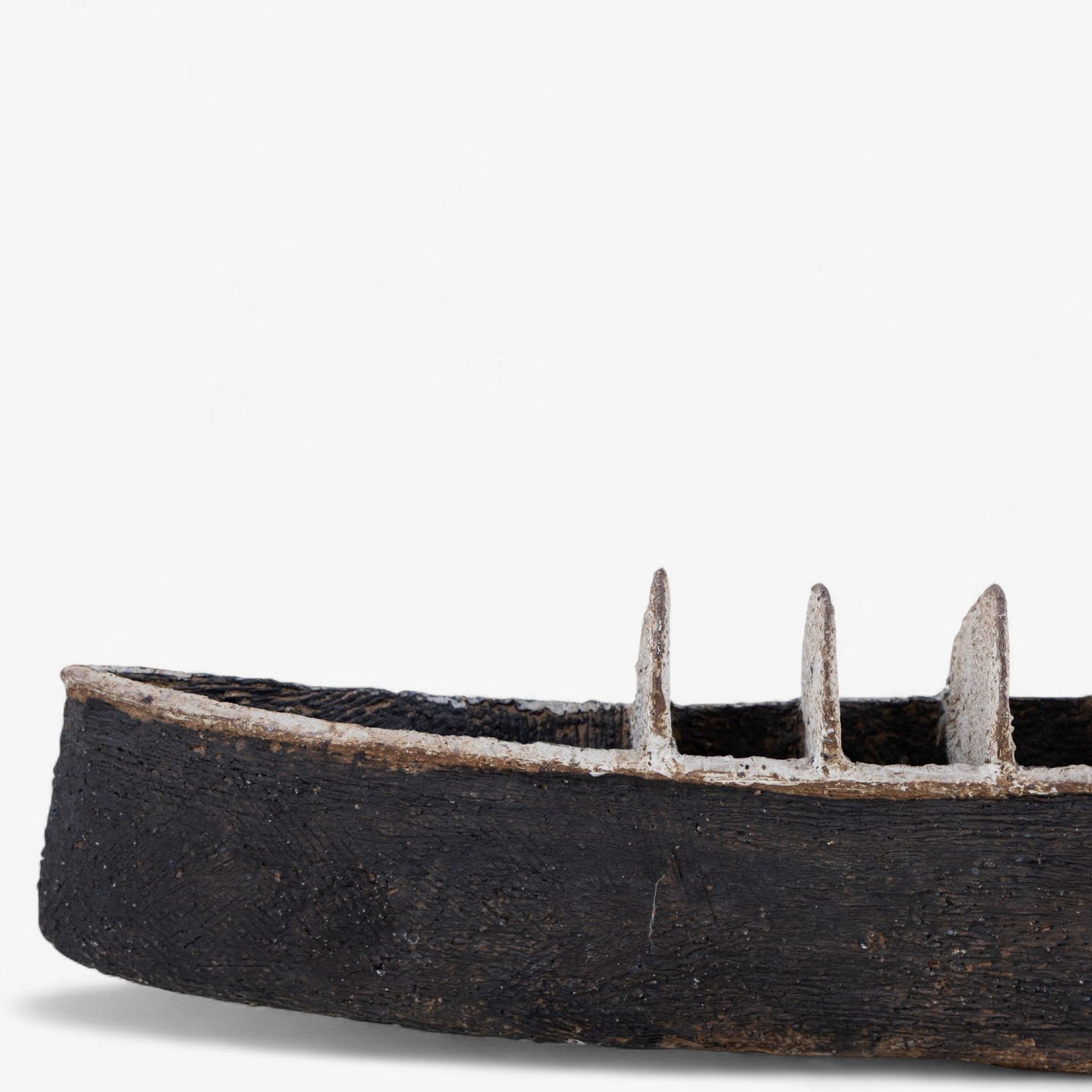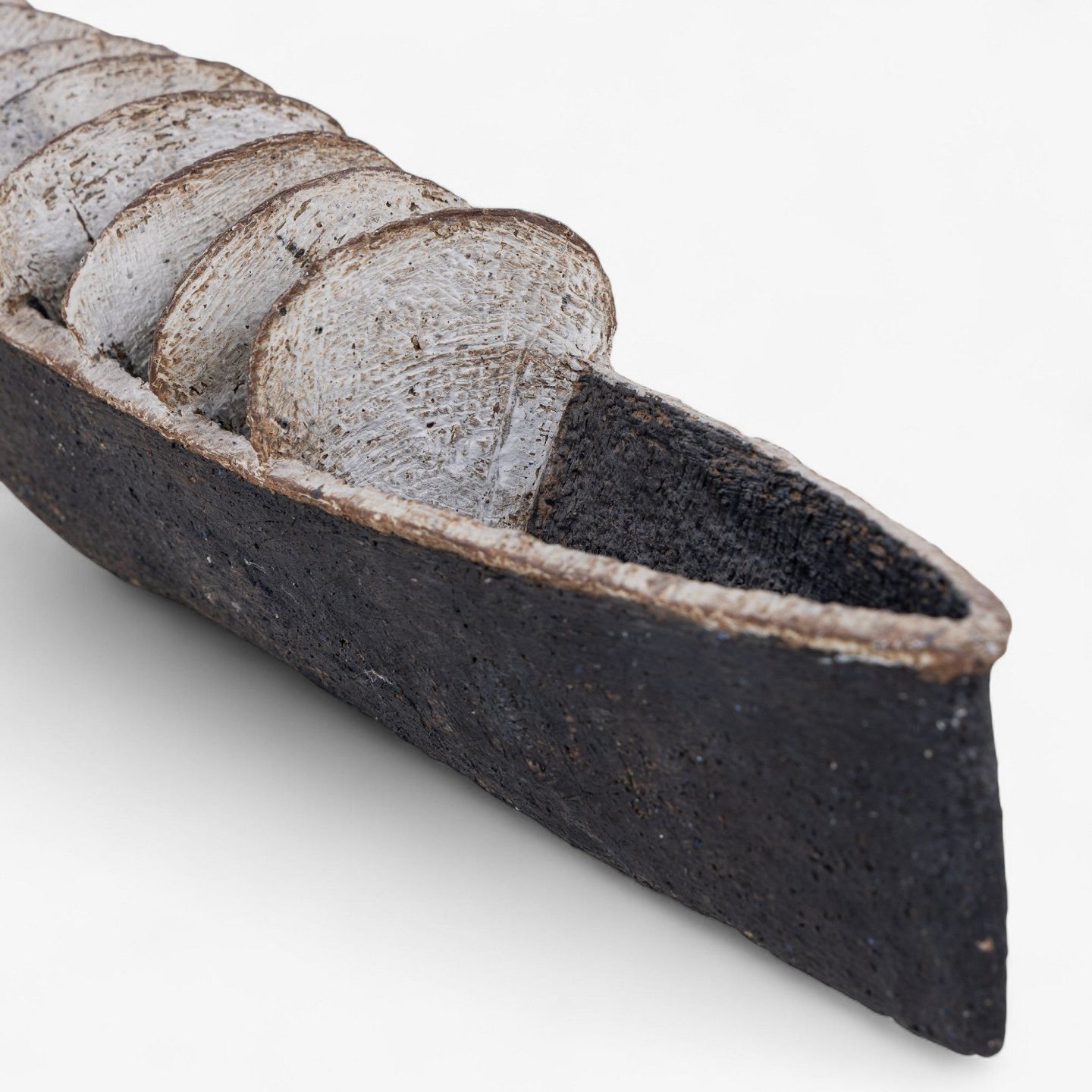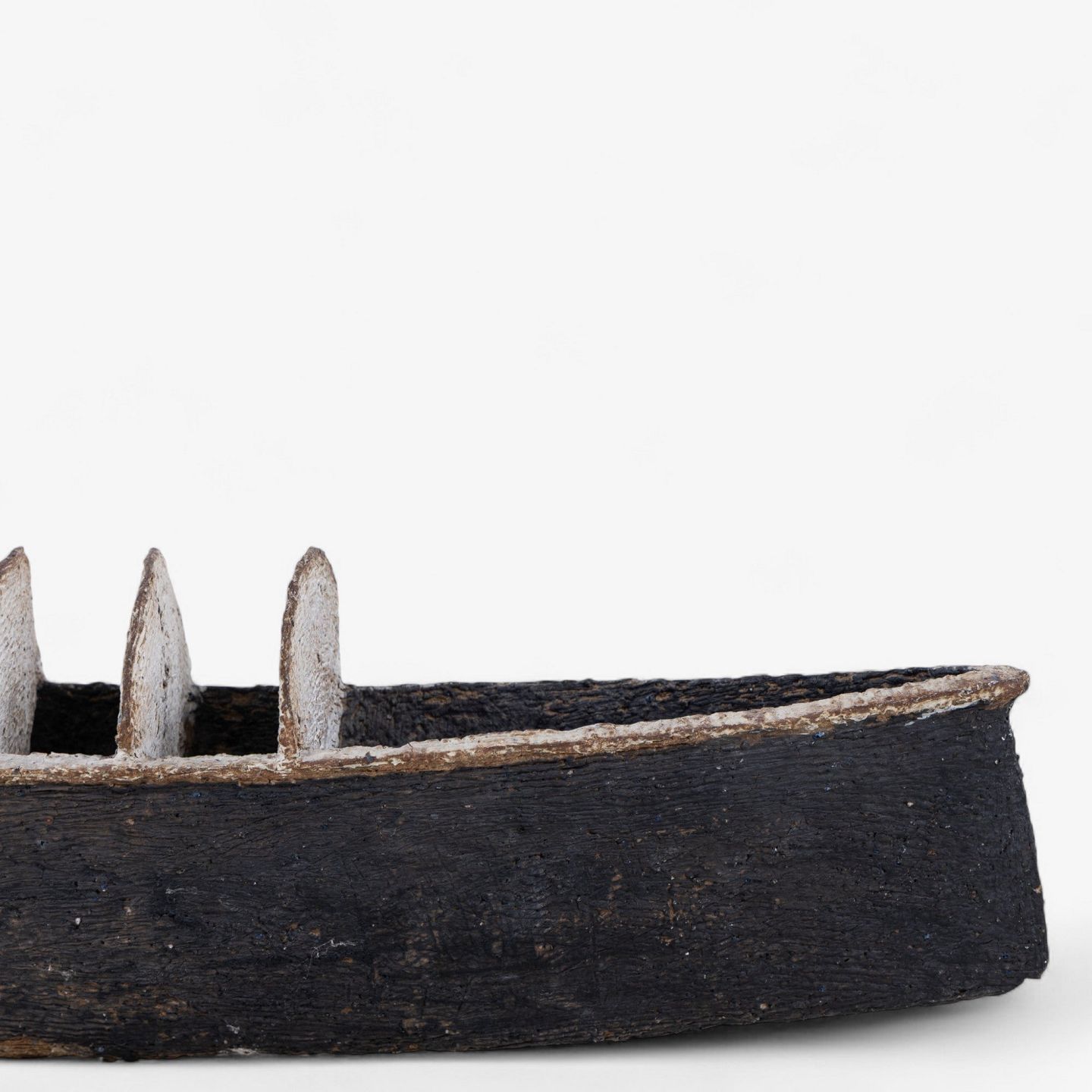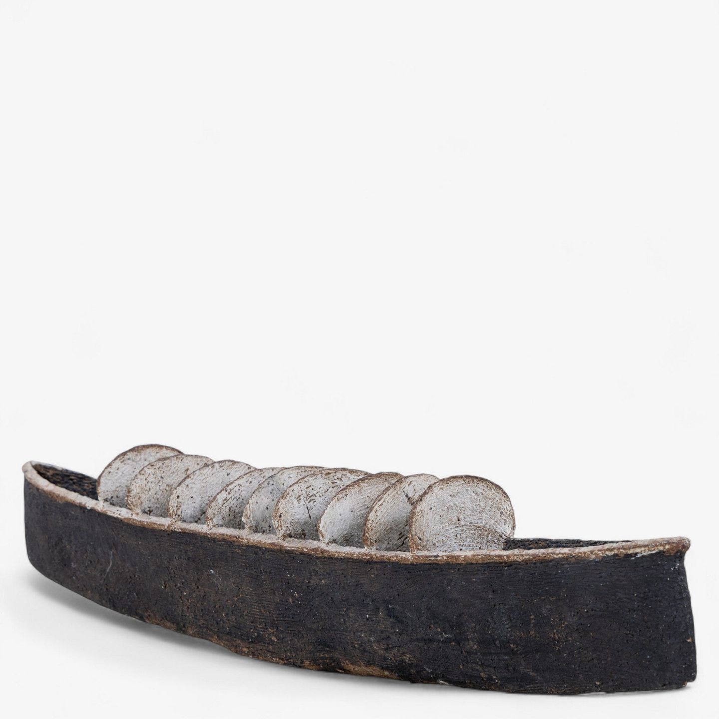 Bådformet skulptur i stentøj med brunsort og gråhvid glasur. Unik.