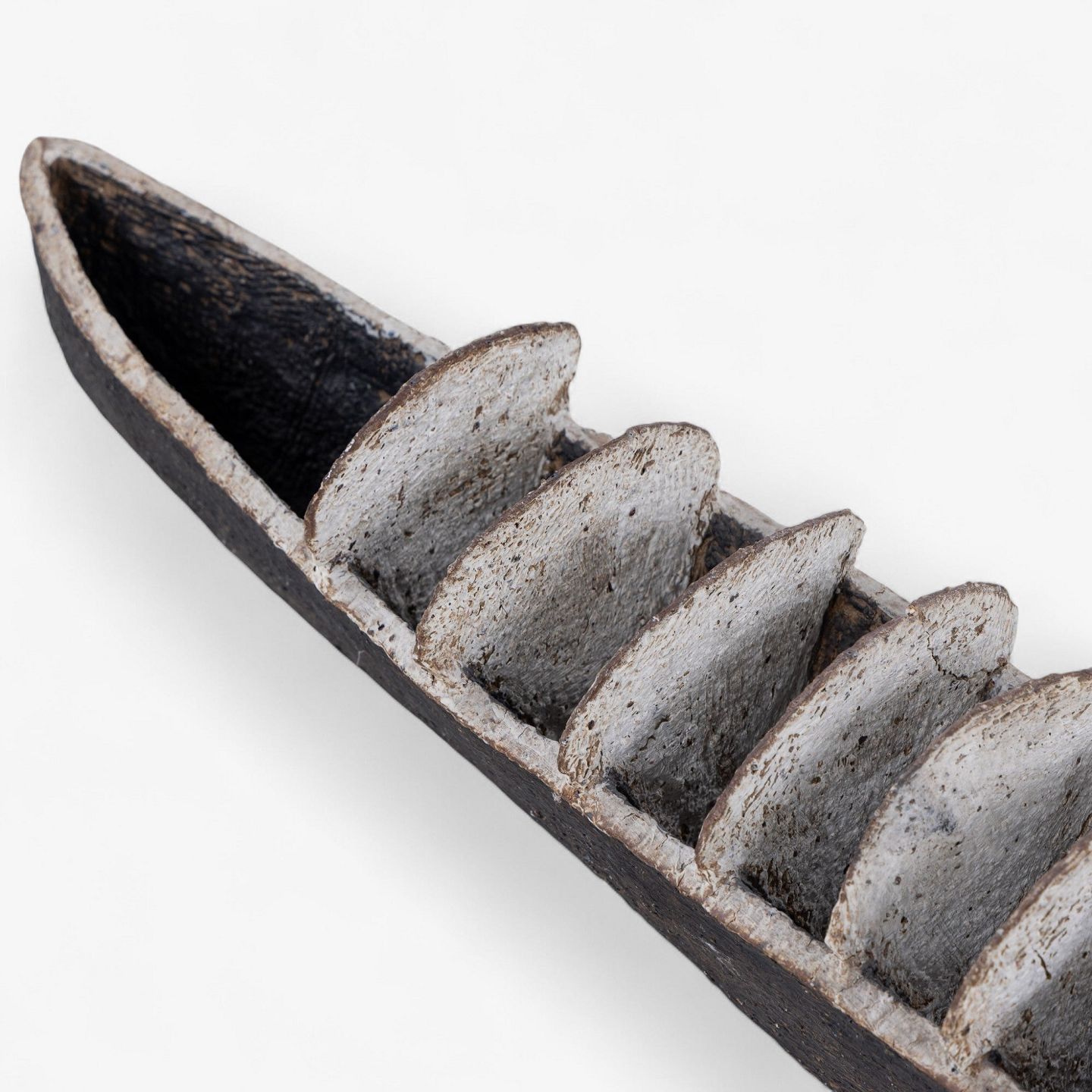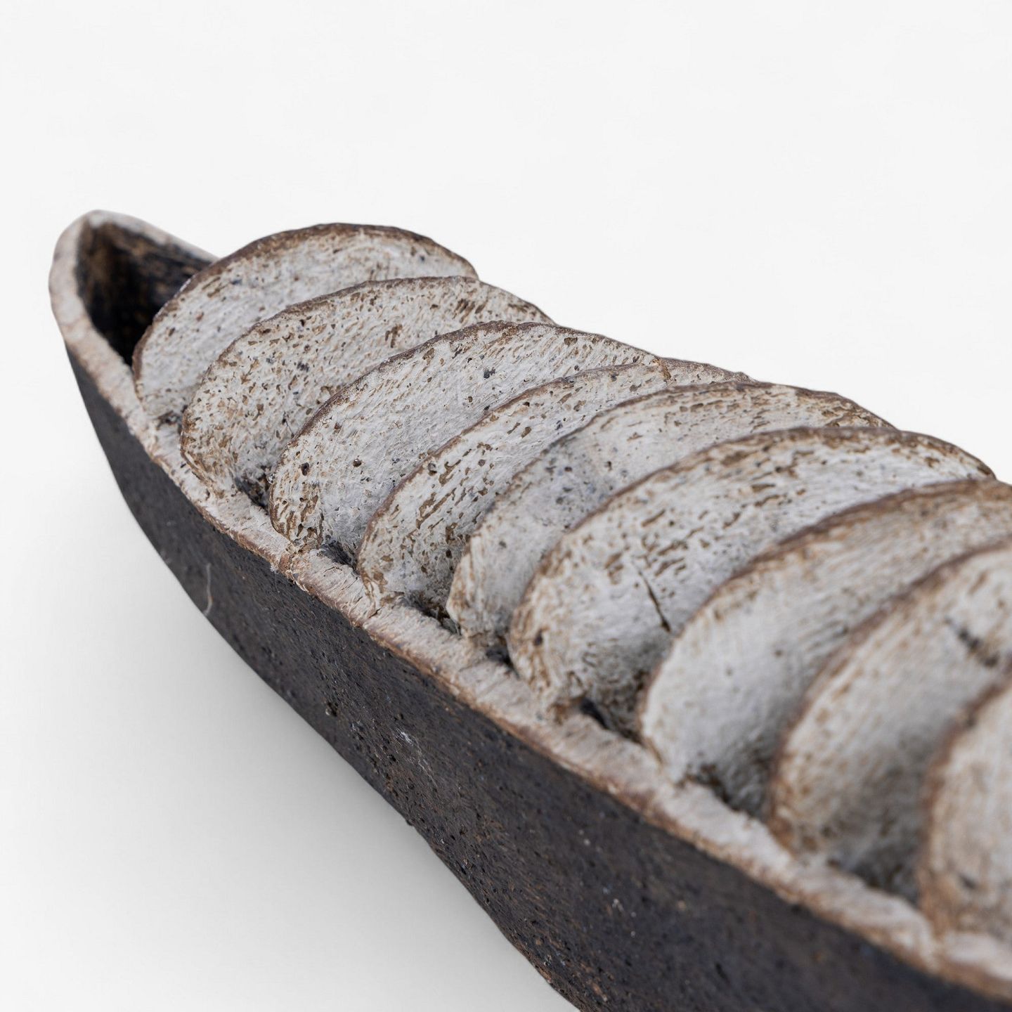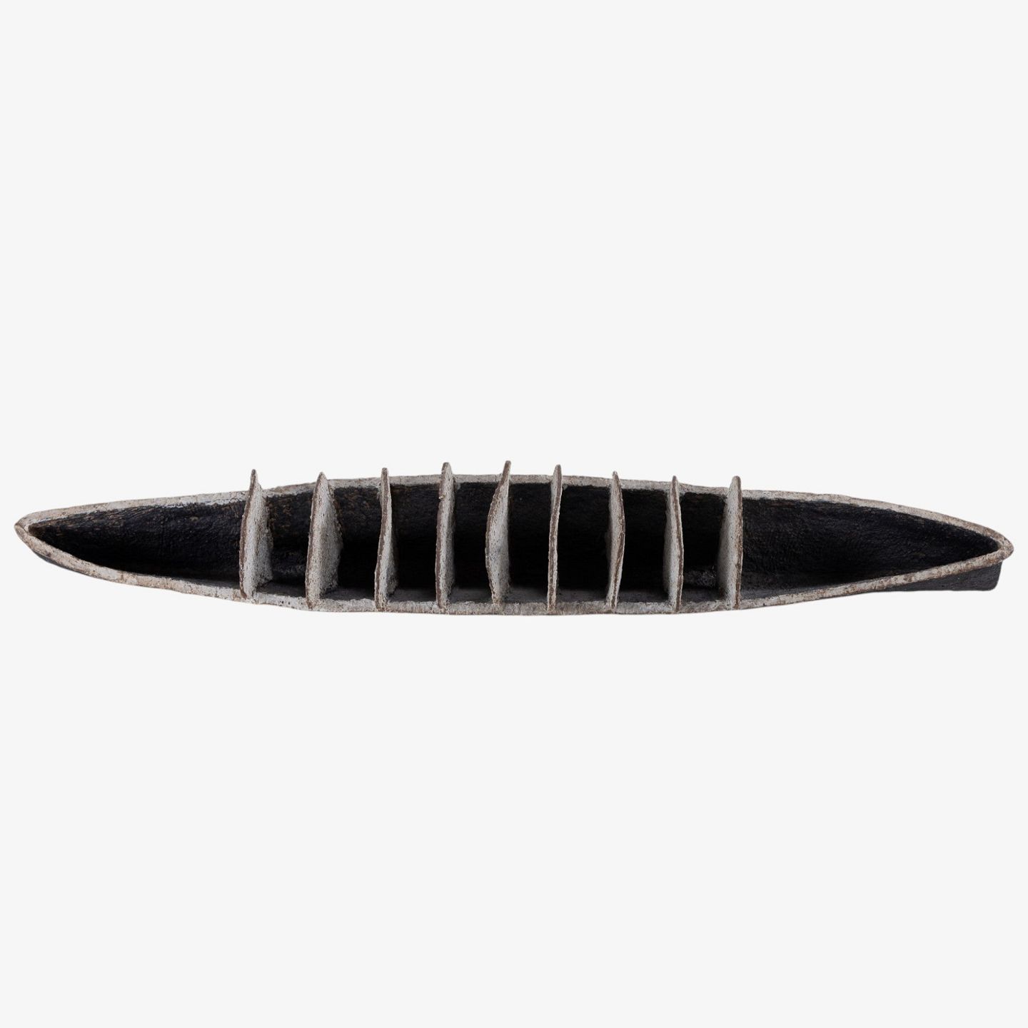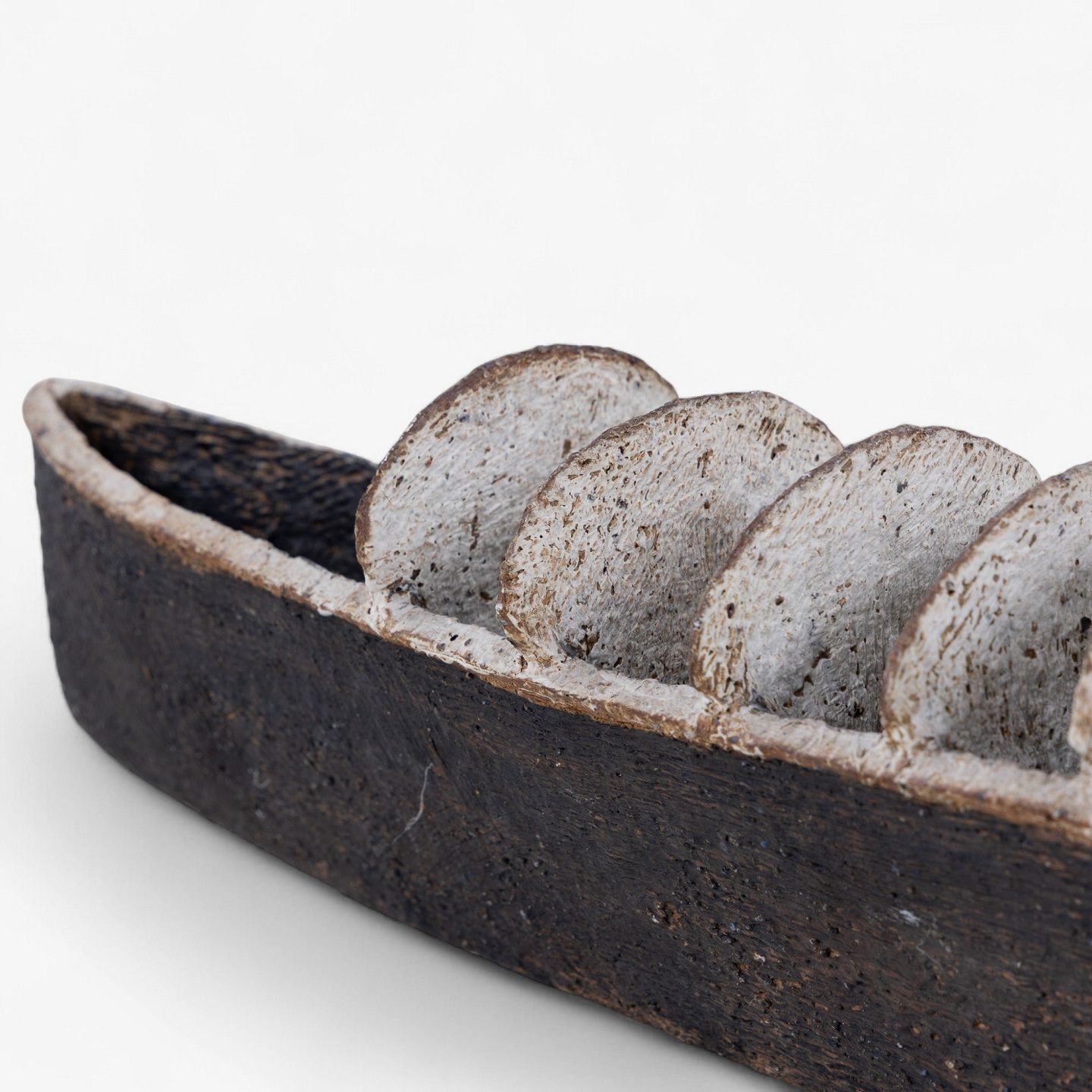 Bådformet skulptur i stentøj med brunsort og gråhvid glasur. Unik.