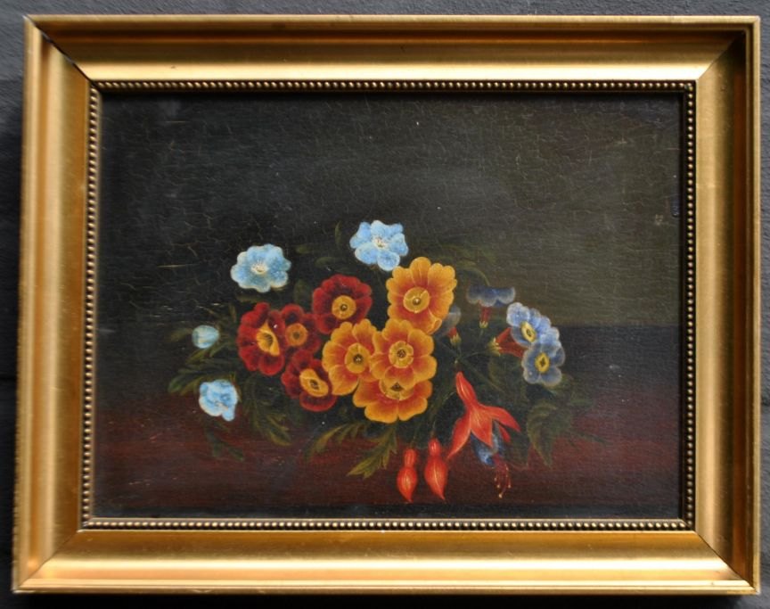 Dansk kunstner (19. årh.) Opstilling med blomsterbuket på et bord. Olie på mahogni plade. Usigneret. 18 x 24,5 cm.
