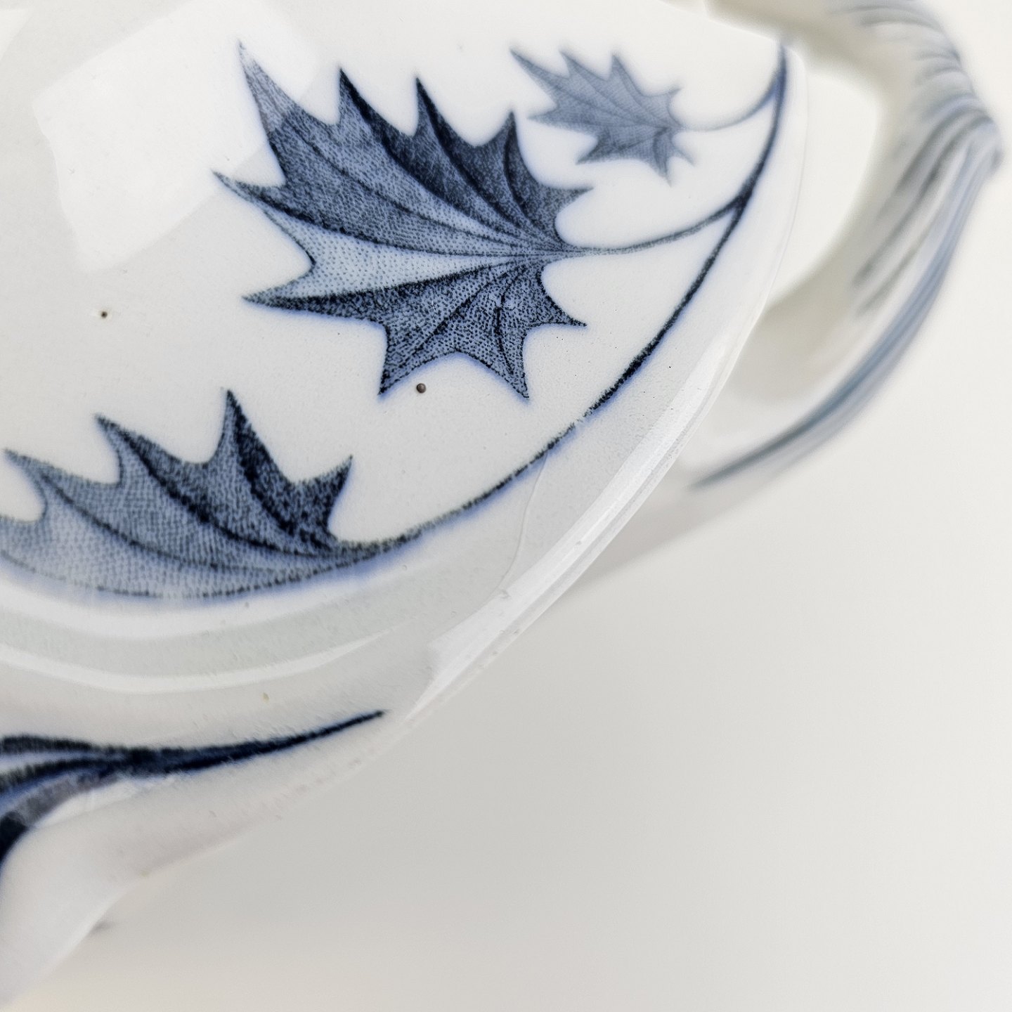 Stellet Tidsel er tysk og er lavet i fajance. Stellet er hvidt og dekoreret med en ranke af blade og tidsler i grå blå farver