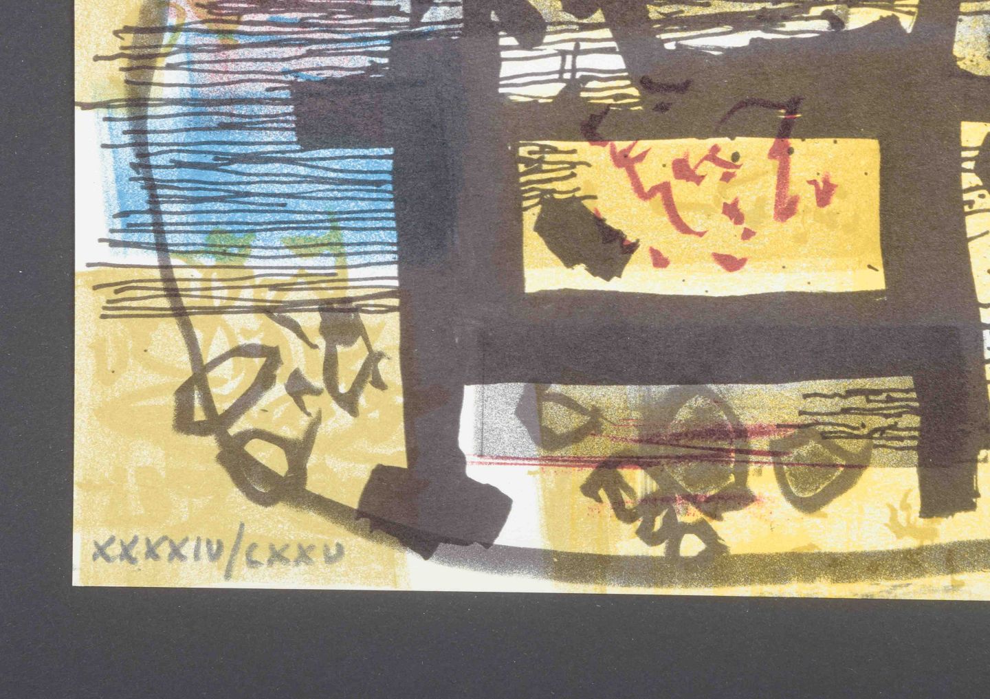 Et karakteristisk abstrakt værk af den svenske kunstner og designer Bengt Orup, kendt for sine modernistiske glasarbejder hos Johansfors Glasbruk samt grafiske kompositioner.