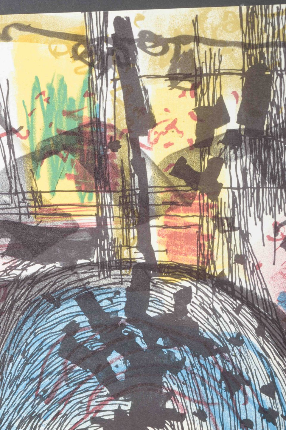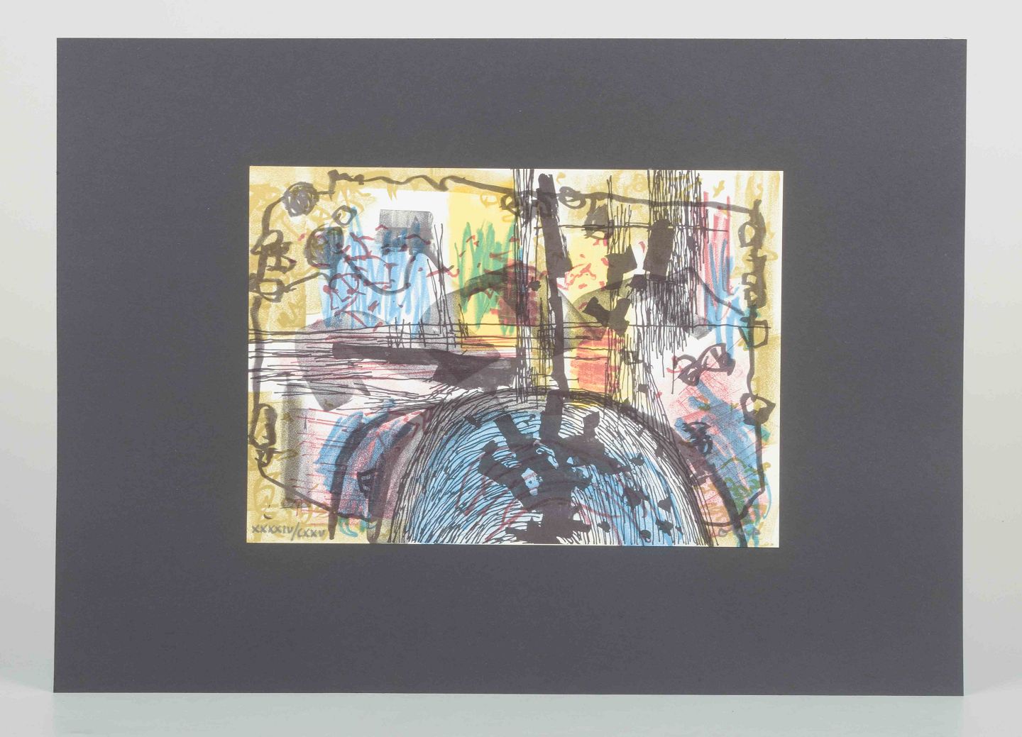 Et karakteristisk abstrakt værk af den svenske kunstner og designer Bengt Orup, kendt for sine modernistiske glasarbejder hos Johansfors Glasbruk samt grafiske kompositioner.