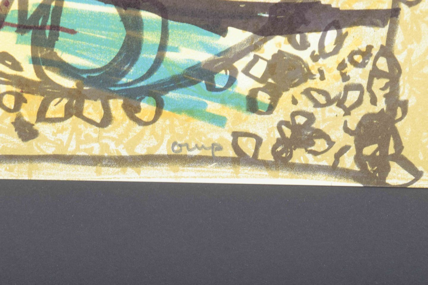 Et karakteristisk abstrakt værk af den svenske kunstner og designer Bengt Orup, kendt for sine modernistiske glasarbejder hos Johansfors Glasbruk samt grafiske kompositioner.