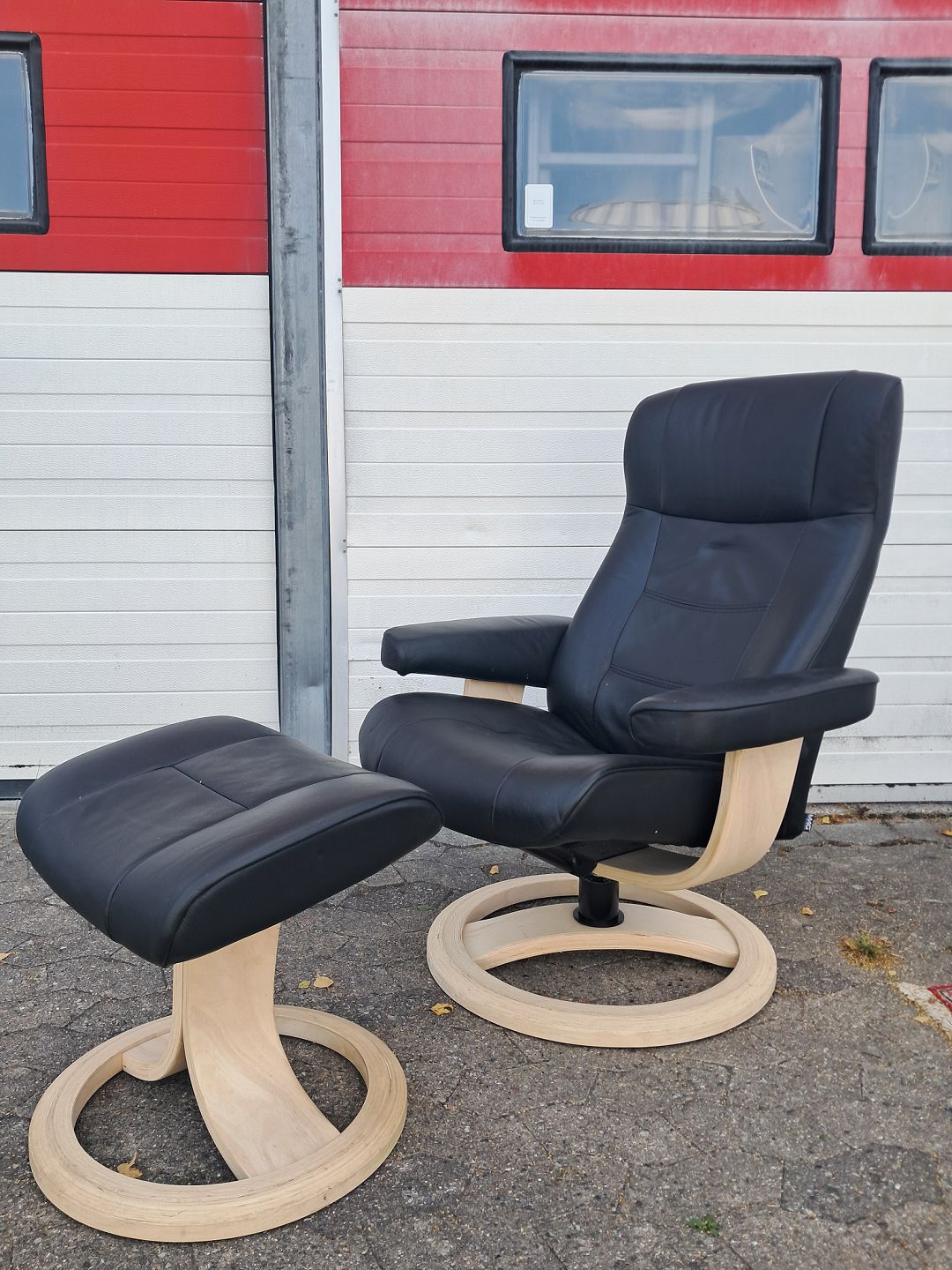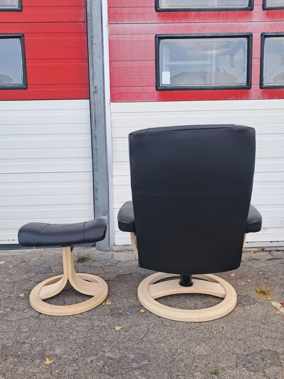 Lænestol og skammel i bøgetræ med læderbetræk, fra 2000erne.