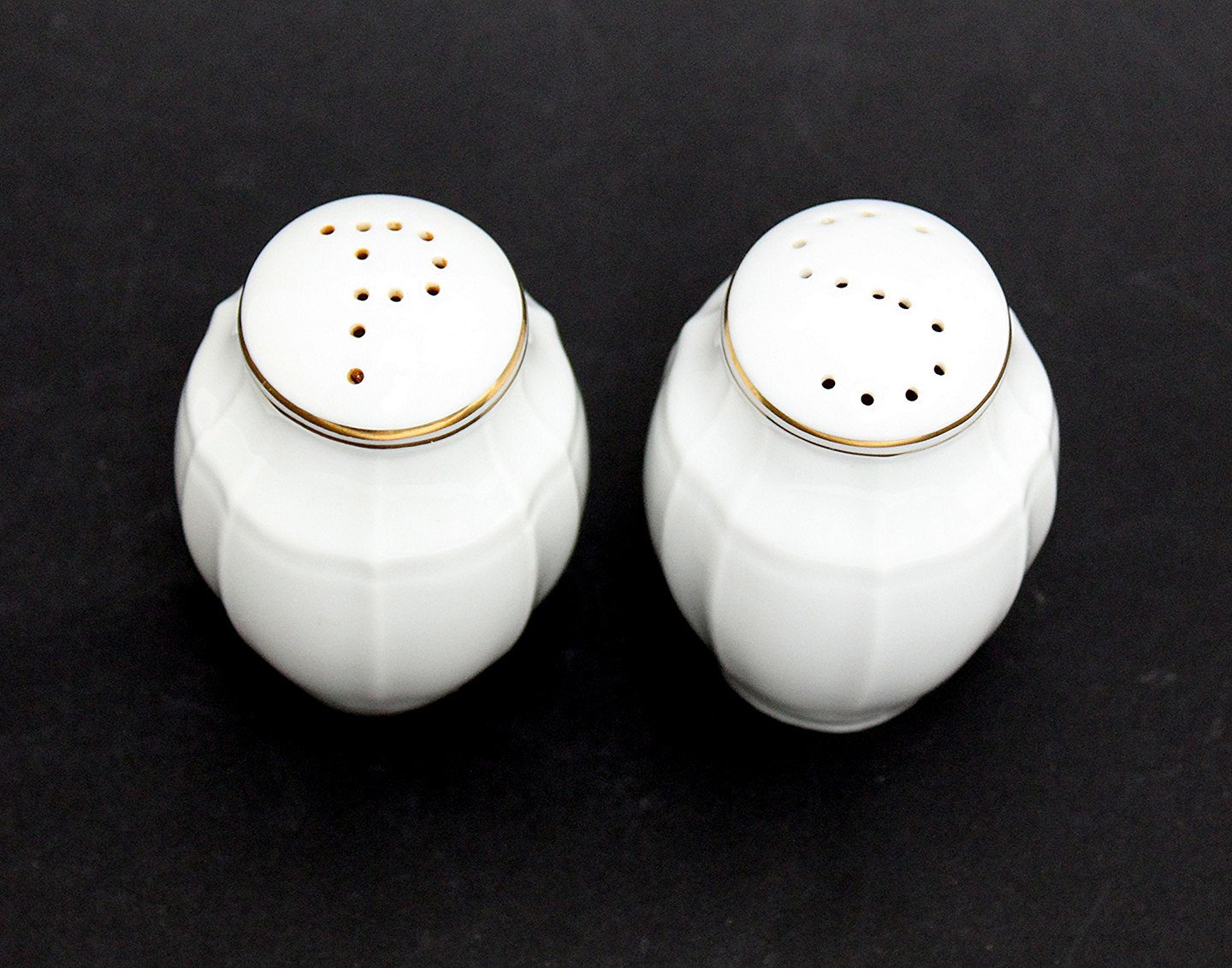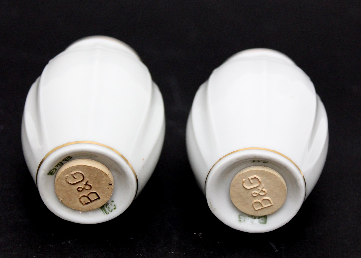 Text available in Danish: Bing & Grøndahl, Offenbach, Salt og Peber sæt. Hvidt kantet porcelæn med guld. Højde 7,5 cm. Salt og peber med original B&G propper. Pris: 375 kr. for sættet.