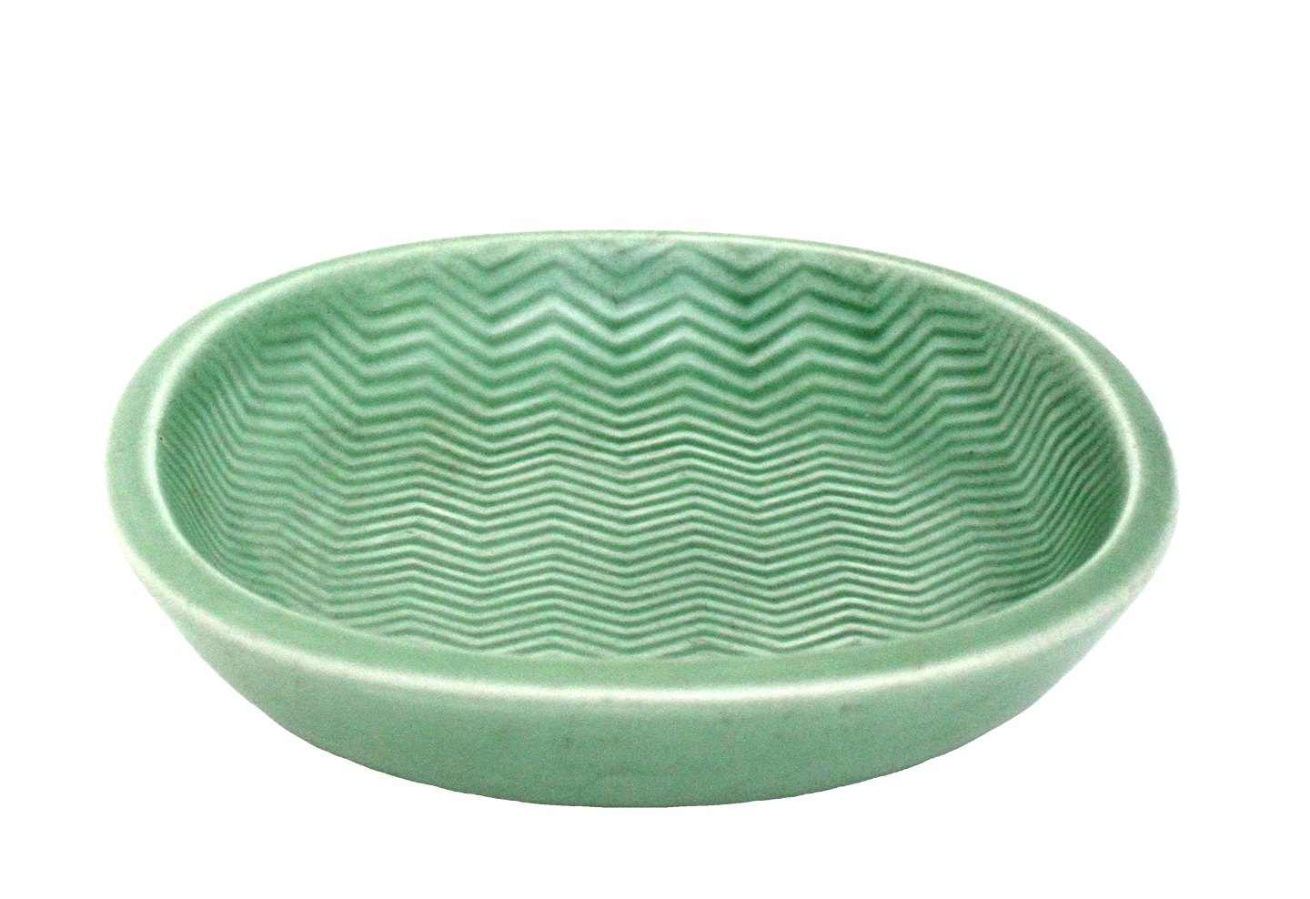 Text available in Danish: Aluminia, Marselis, kunststengods, Mintgrøn fad med siksakmønster. Designet af Nils Thorsson i perioden 1953-1960. Nr. 2635. Højde 4,5 cm. 18 x 18 cm. Rimelig stand med brugsspor og enkelte overfladekrakeleringer. Pris: 300 kr. stk. Lager: 1