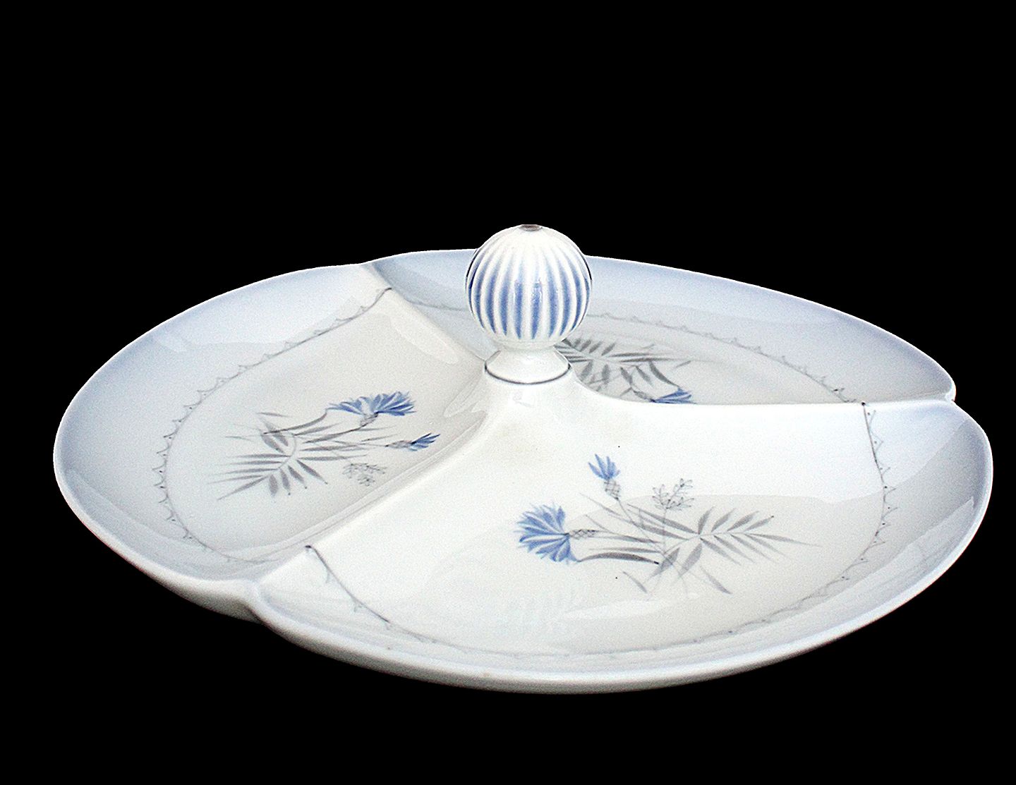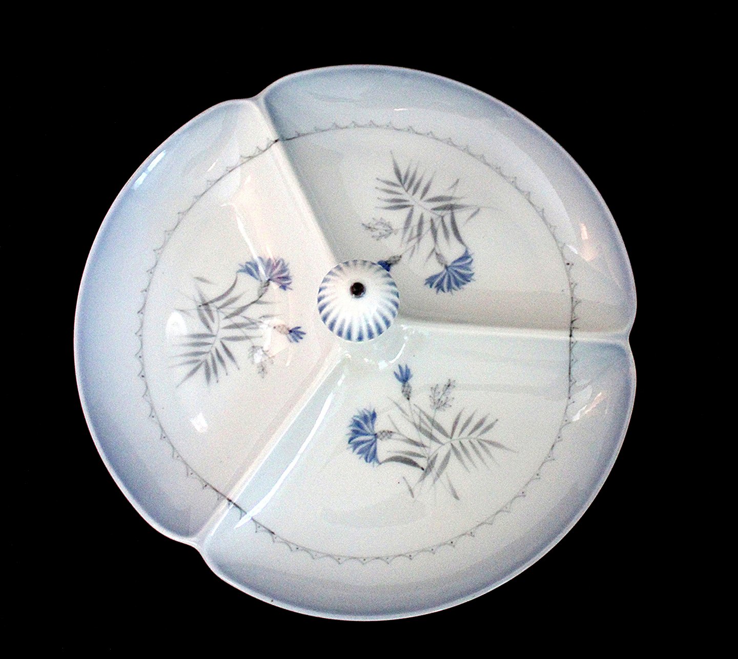 Bing & Grøndahl, Demeter, blå tone. Cabaretfad, Kabaretfad, meget sjælden. Inddelt med 3 rum og knop som håndtag. Nr. 234. Højde 10cm. Diameter 27 cm. Pris: 1150 kr. stk. Lager: 1