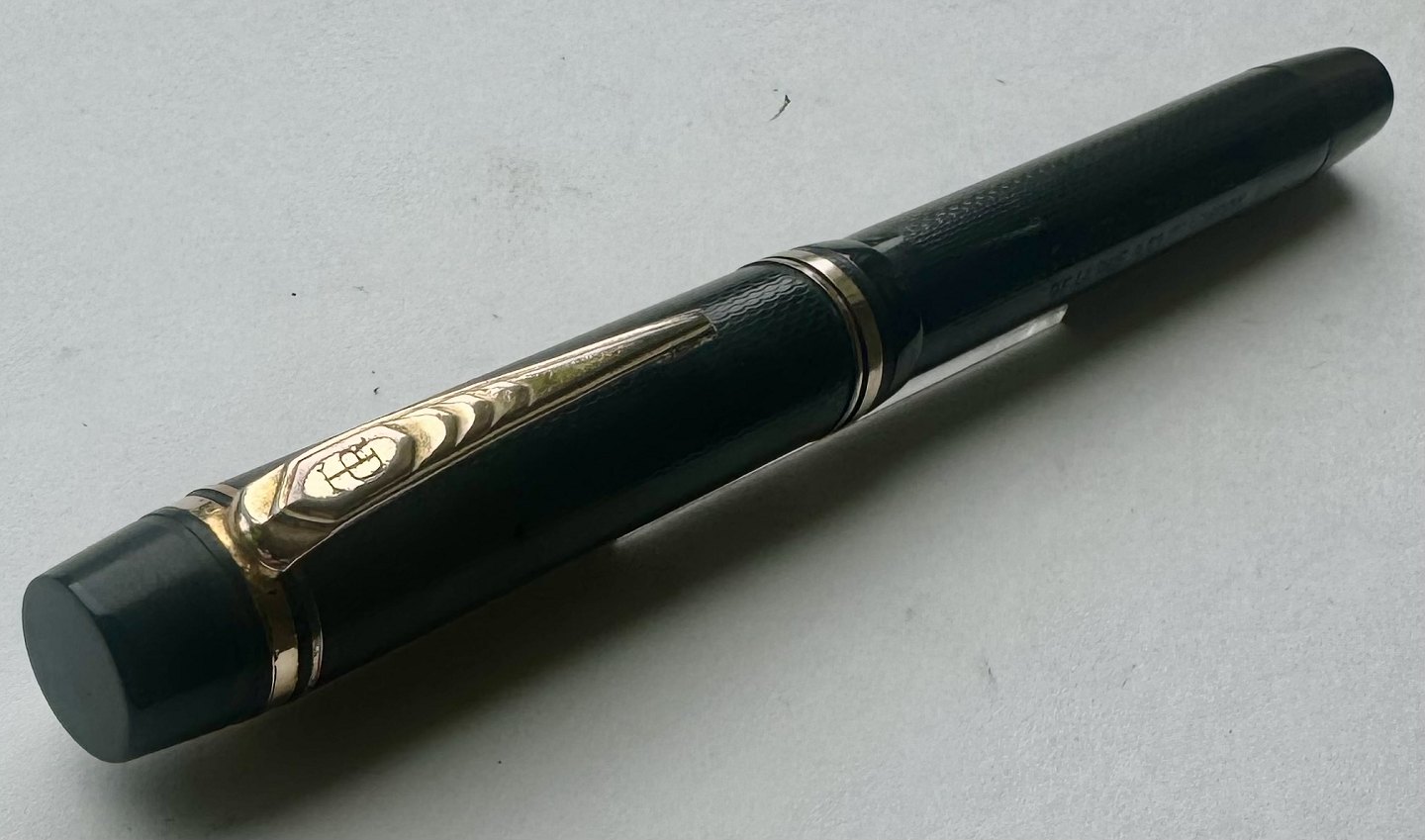 Black Onoto “The Pen” fountain pen. In good condition with no damage or repairs. All parts original Onoto including a beautiful De la Rue Onoto 14 carat London no. 5 gold nib. A new rubber cap must be inserted before it will work again. A new rubber cap can be inserted for an additional charge of DKK 200.