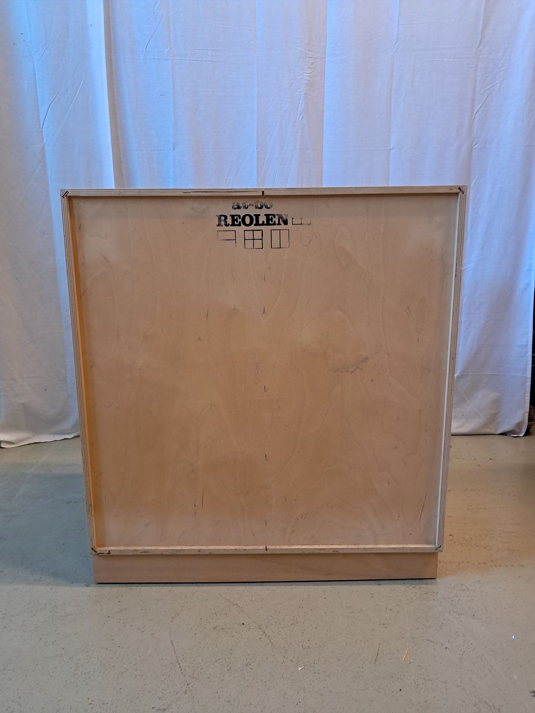 At-bo reolkasse i krydsfiner med malede låger, fra 2000erne.