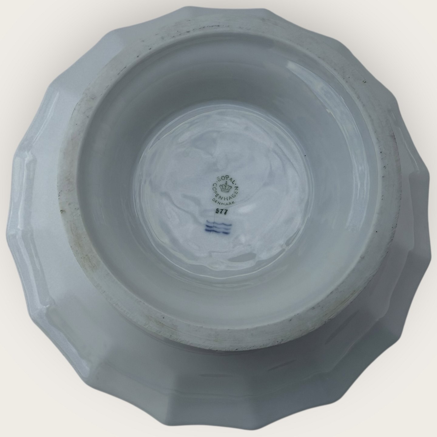 Royal Copenhagen, Hvidt kantet uden dekoration, Rund skål på fod #577, 23,5cm i diameter, højde 9cm, 3. sortering, En plet i bunden og lille fejl på foden(se foto).
