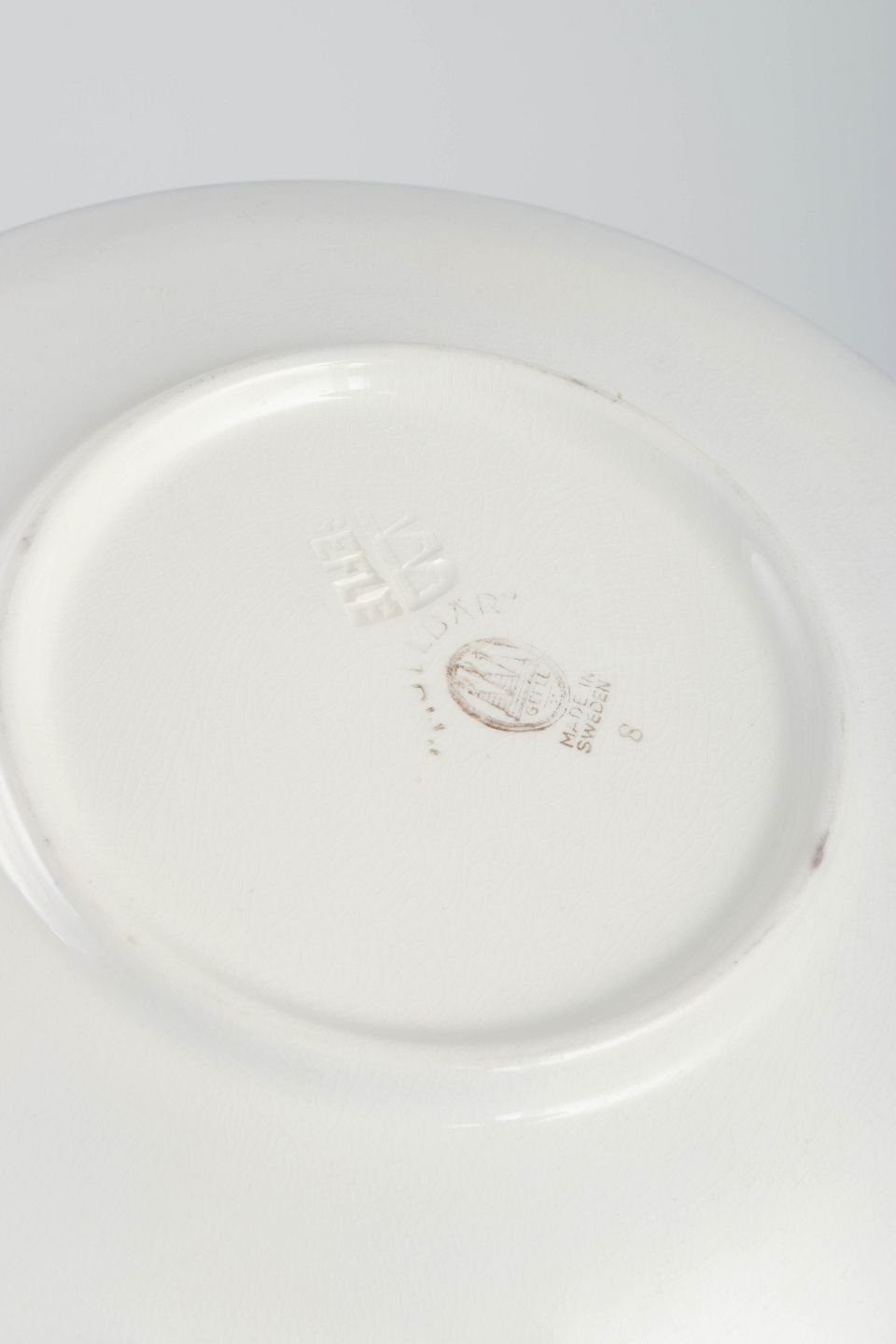 Bio: Gefle Porcelain Factory was founded in 1910 in Gävle and became one of Sweden’s most important porcelain and faience producers. In the 1930s, the factory continued the tradition of making transfer-printed and relief-decorated tableware for both household use and export. The “Mullbär” pattern is a fine example of the period’s naturalistic ornamentation, featuring grapevine motifs inspired by classical and historical styles.