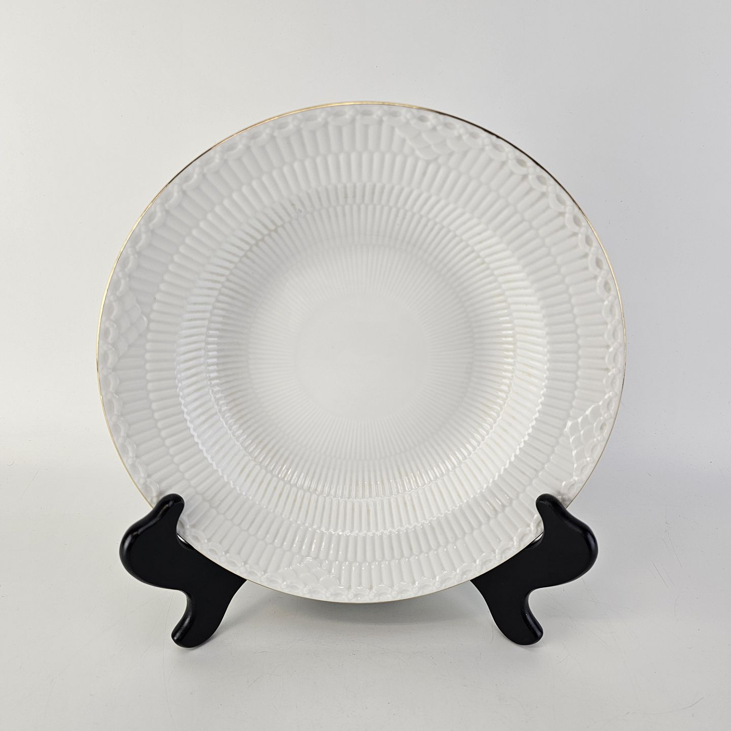 Stellet er i hvidt porcelæn med halvblonde dekoration og guldkant