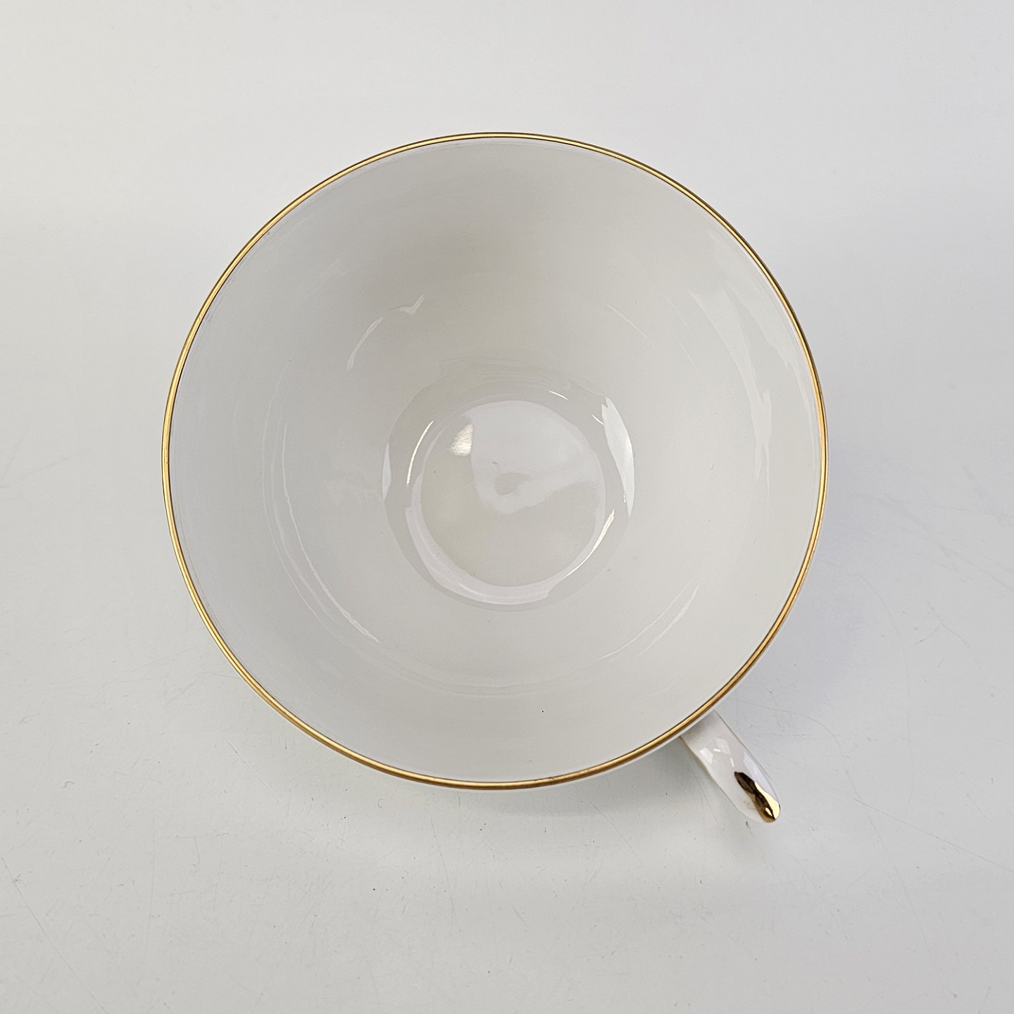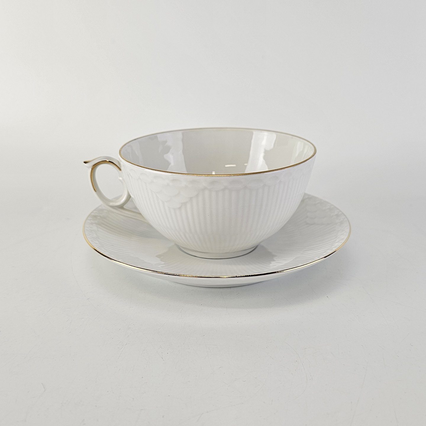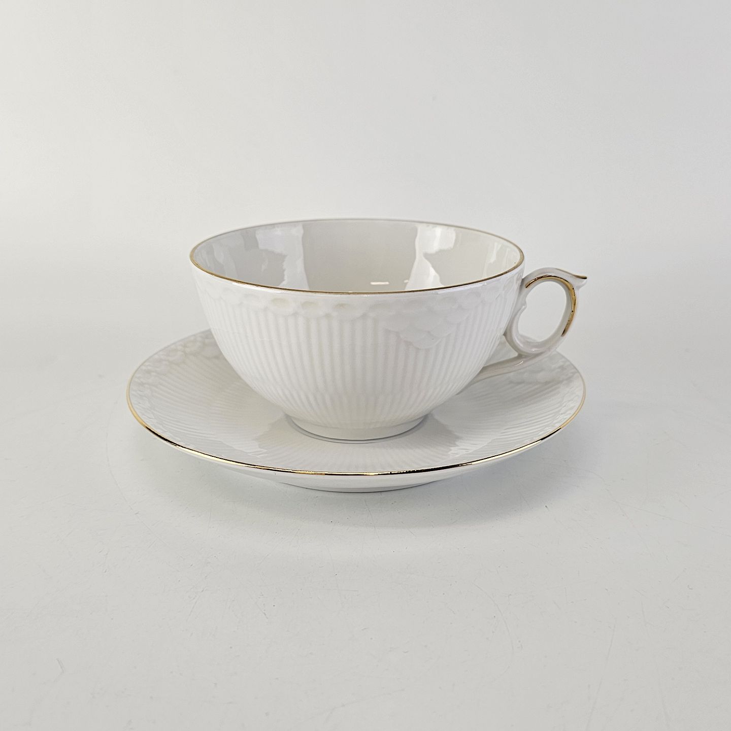 Stellet er i hvidt porcelæn med halvblonde dekoration og guldkant