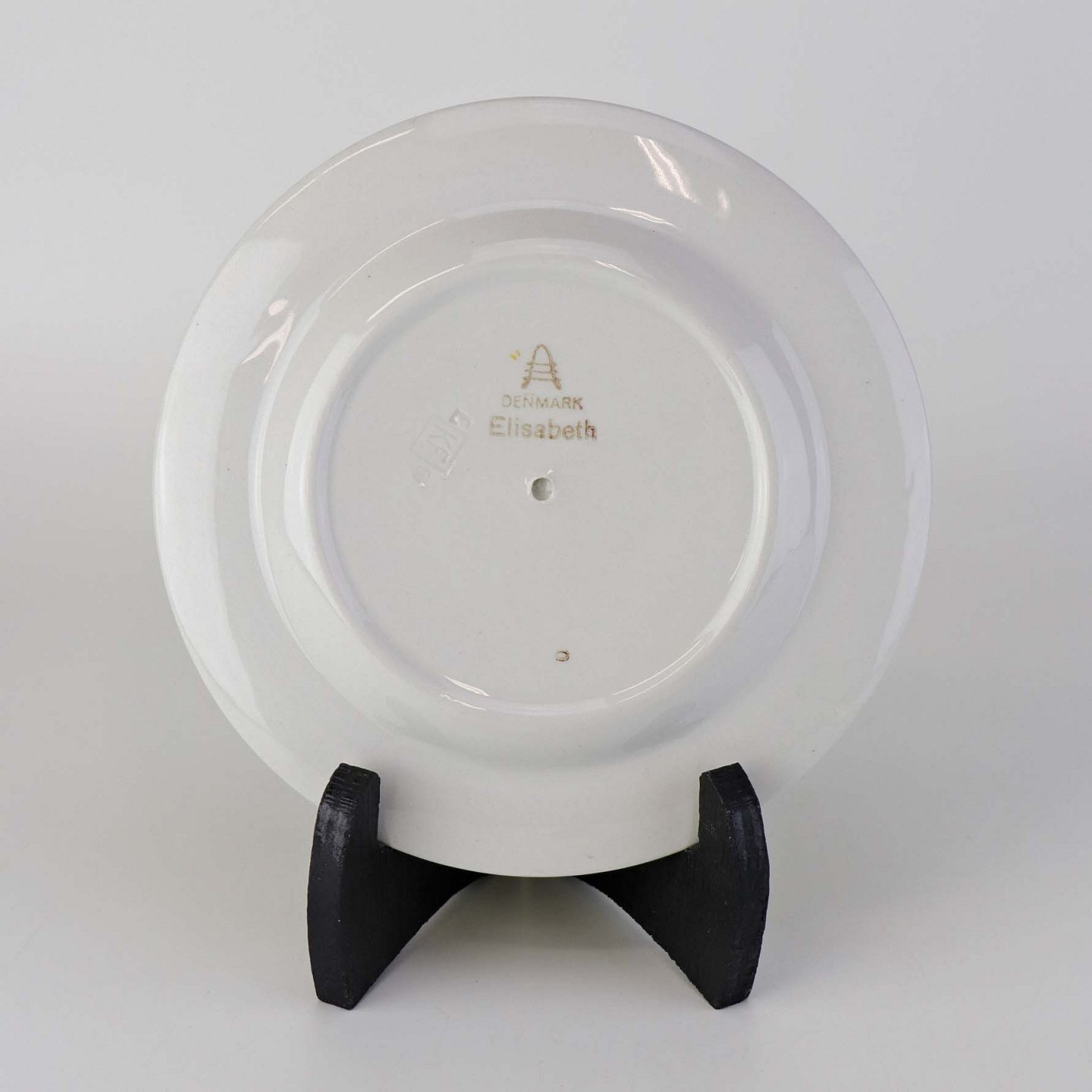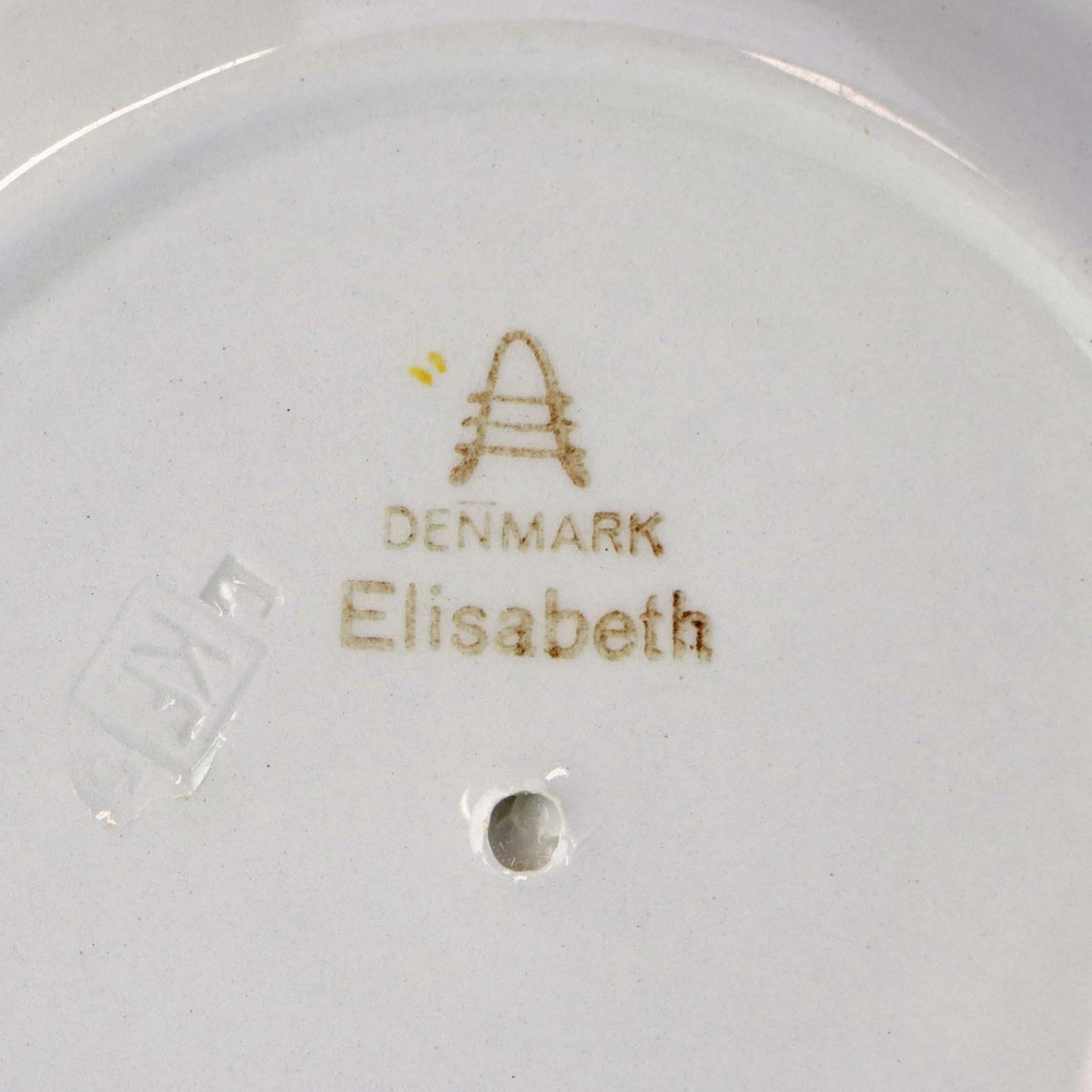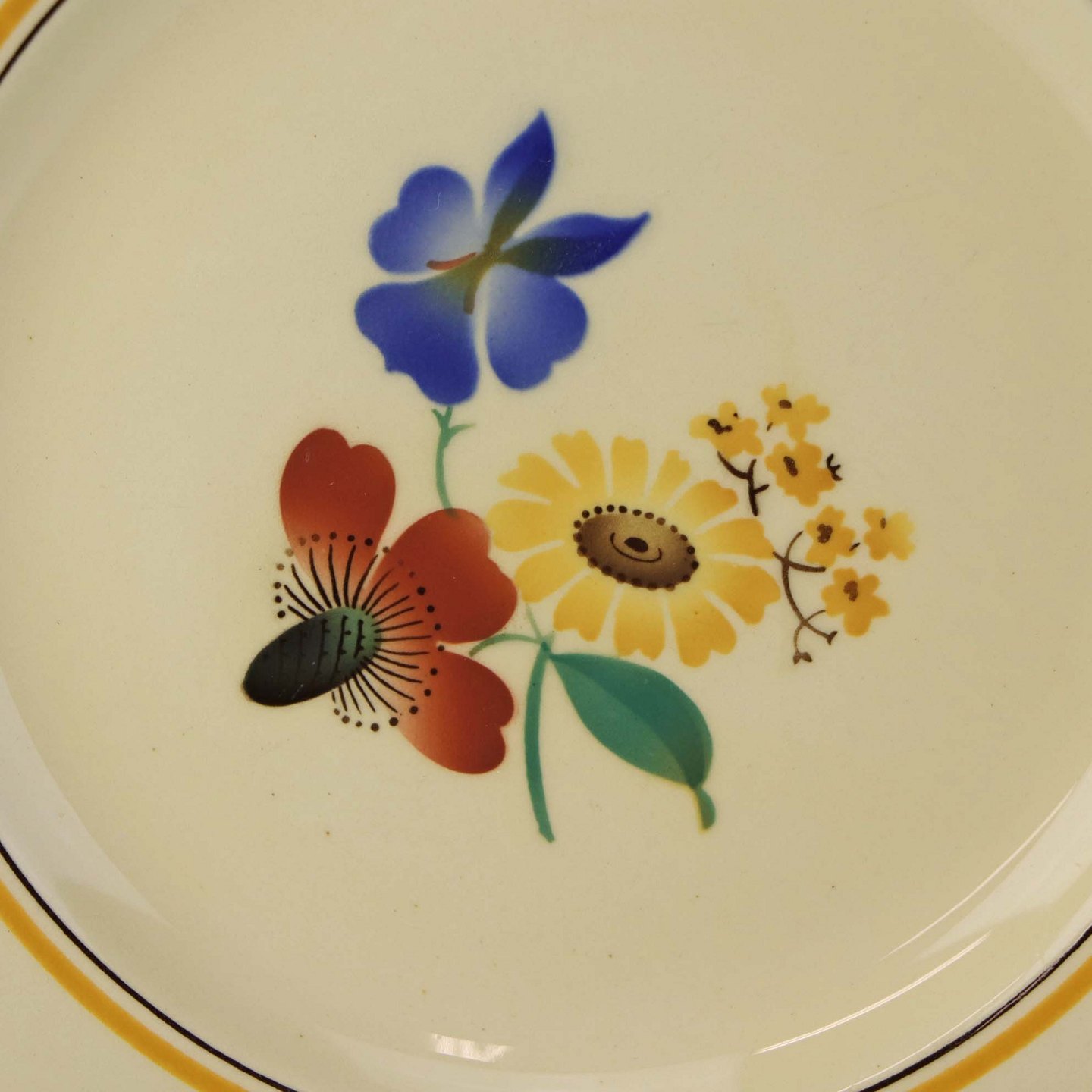 Stel i glat gul fajance med dekoration af farverige og forskelligartede blomster samt med gul og sort kantstreg.