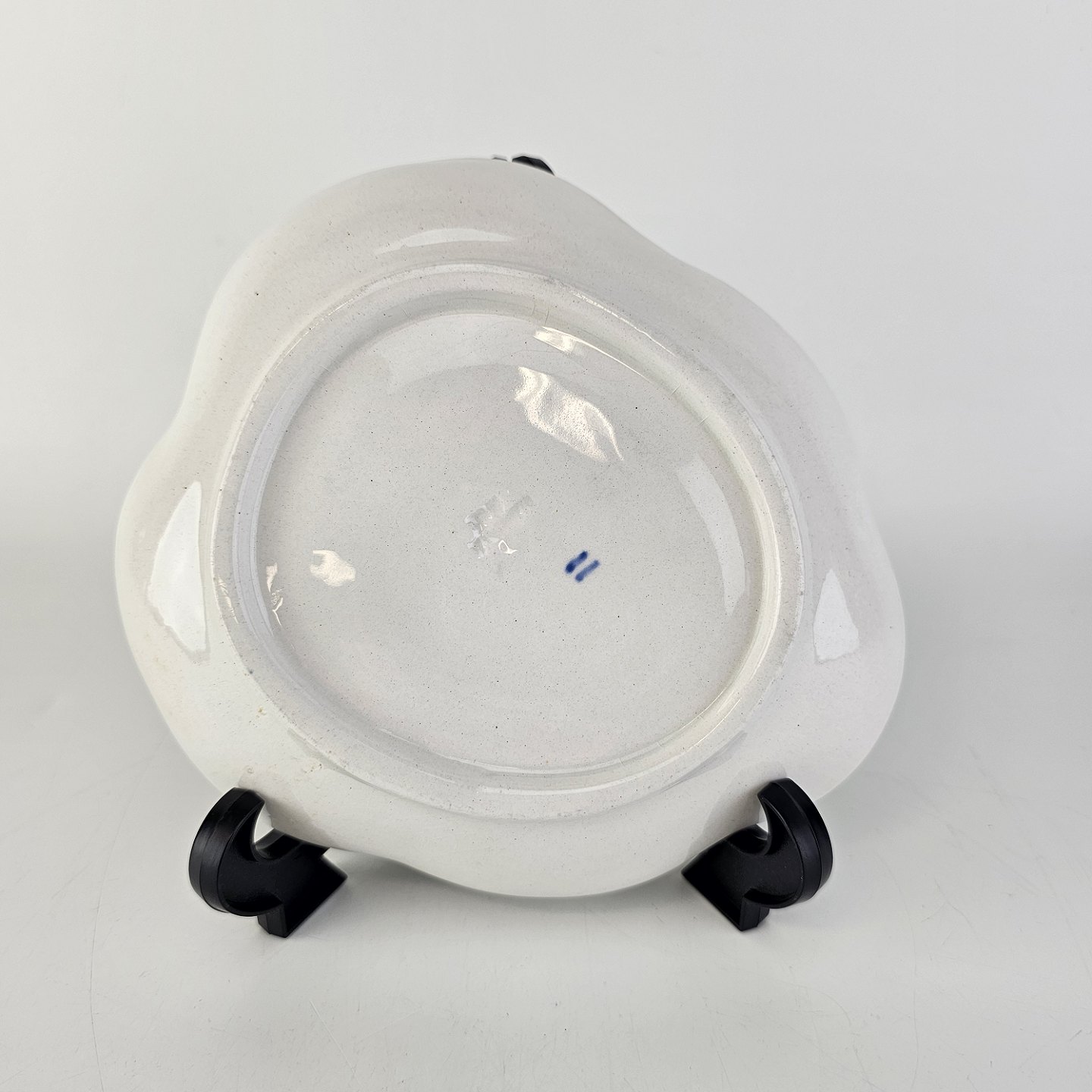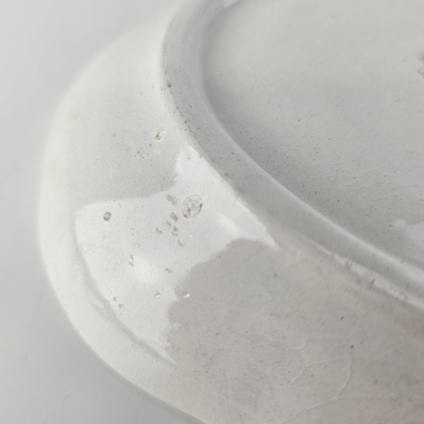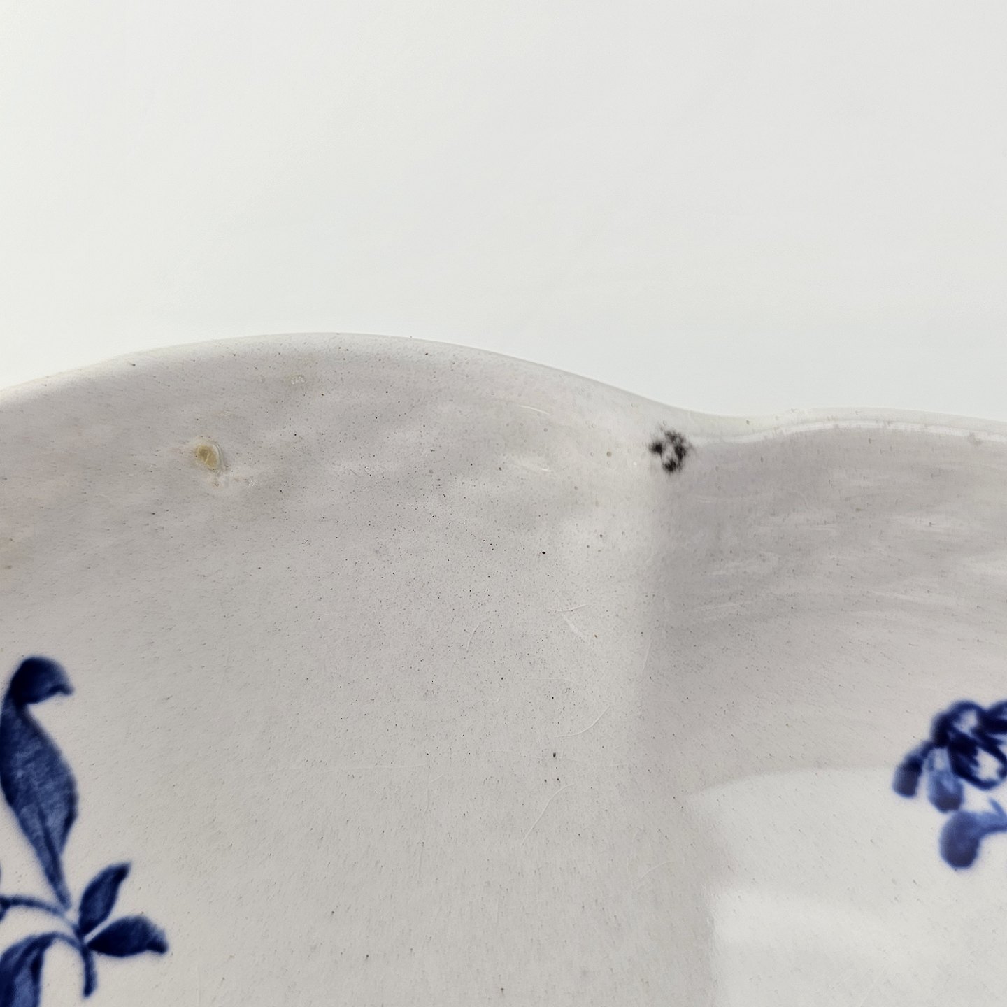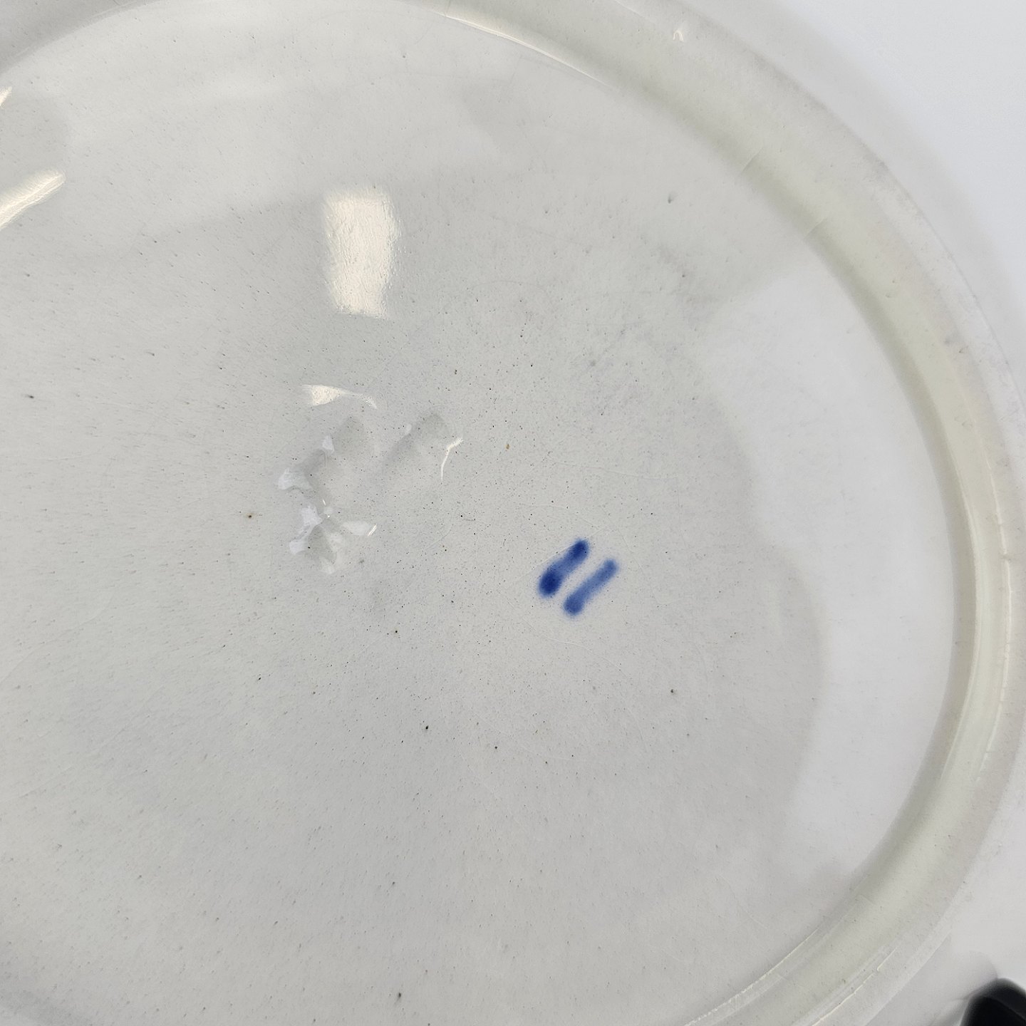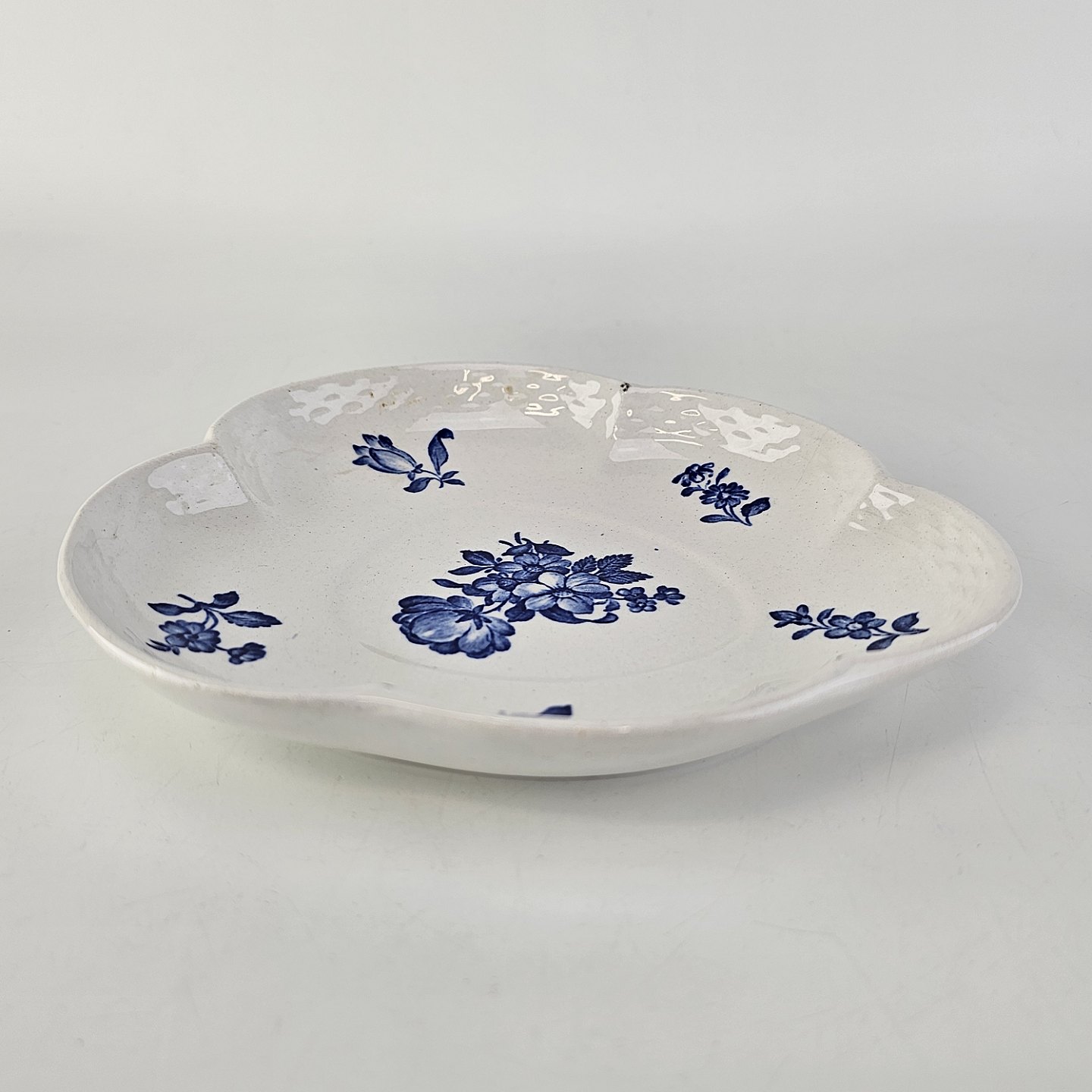 Stel i glat hvid fajance med dekoration af blå blomster og flettet kant