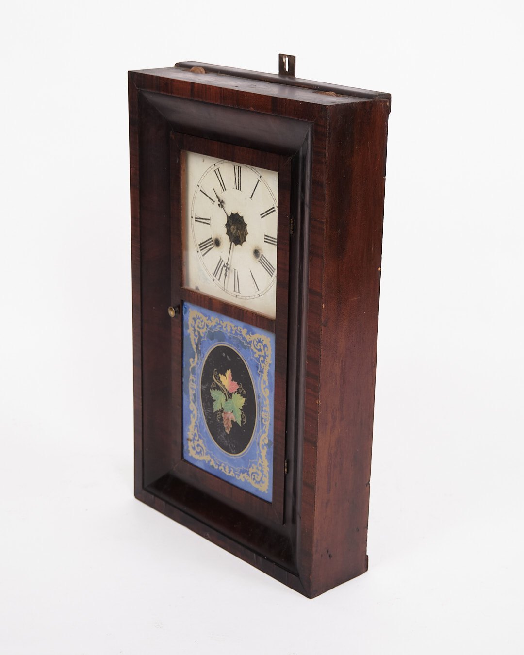 Dekorativt amerikanerur fra 1800-tallet, udført i mørkt træ. Uret har en klassisk urskive med romertal og en bemalet glasrude, der giver et charmerende og tidstypisk udtryk.