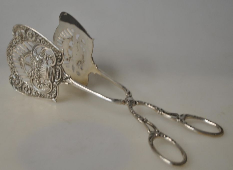 Silver cake scissors, circa 1900. Germany. Decorated with flowers. Hallmark: 800. Length: 19 cm. Weight: 83 cm.