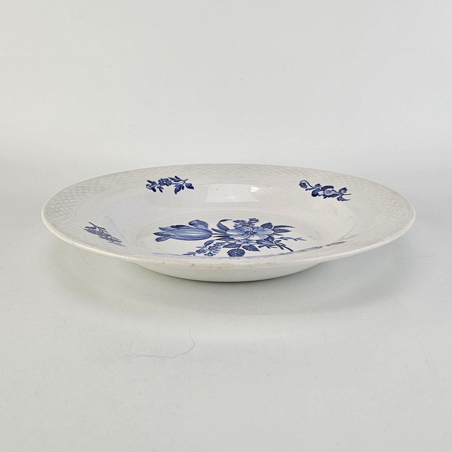 Stel i glat hvid fajance med dekoration af blå blomster og flettet kant
