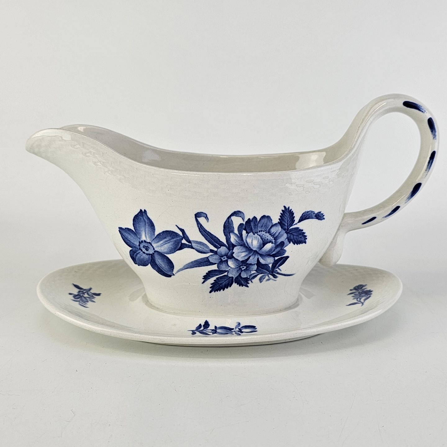 Stel i glat hvid fajance med dekoration af blå blomster og flettet kant