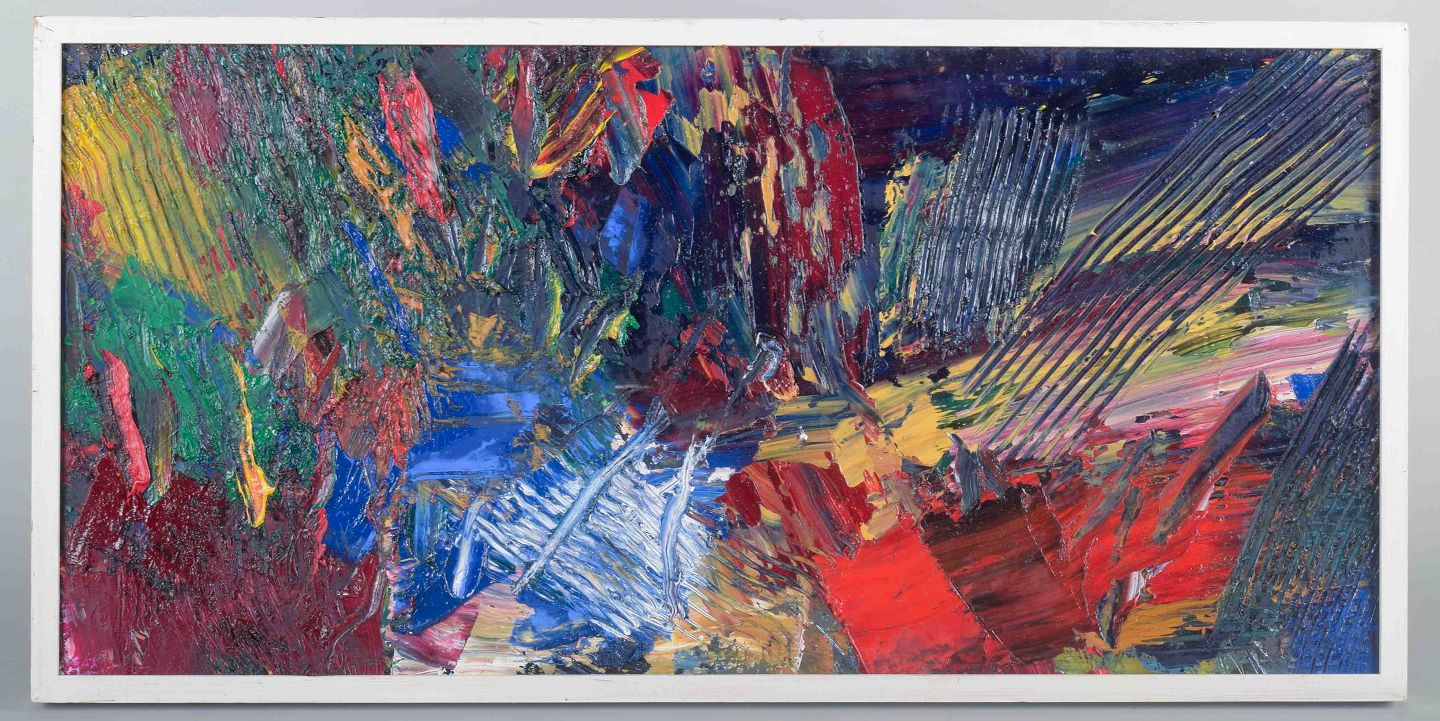 Et ekspressivt, koloristisk maleri med kraftige penselstrøg i røde, blå, grønne og gule nuancer, der tilsammen danner en abstrakt landskabskomposition. Værket udmærker sig ved sin stærke struktur og levende stoflighed.