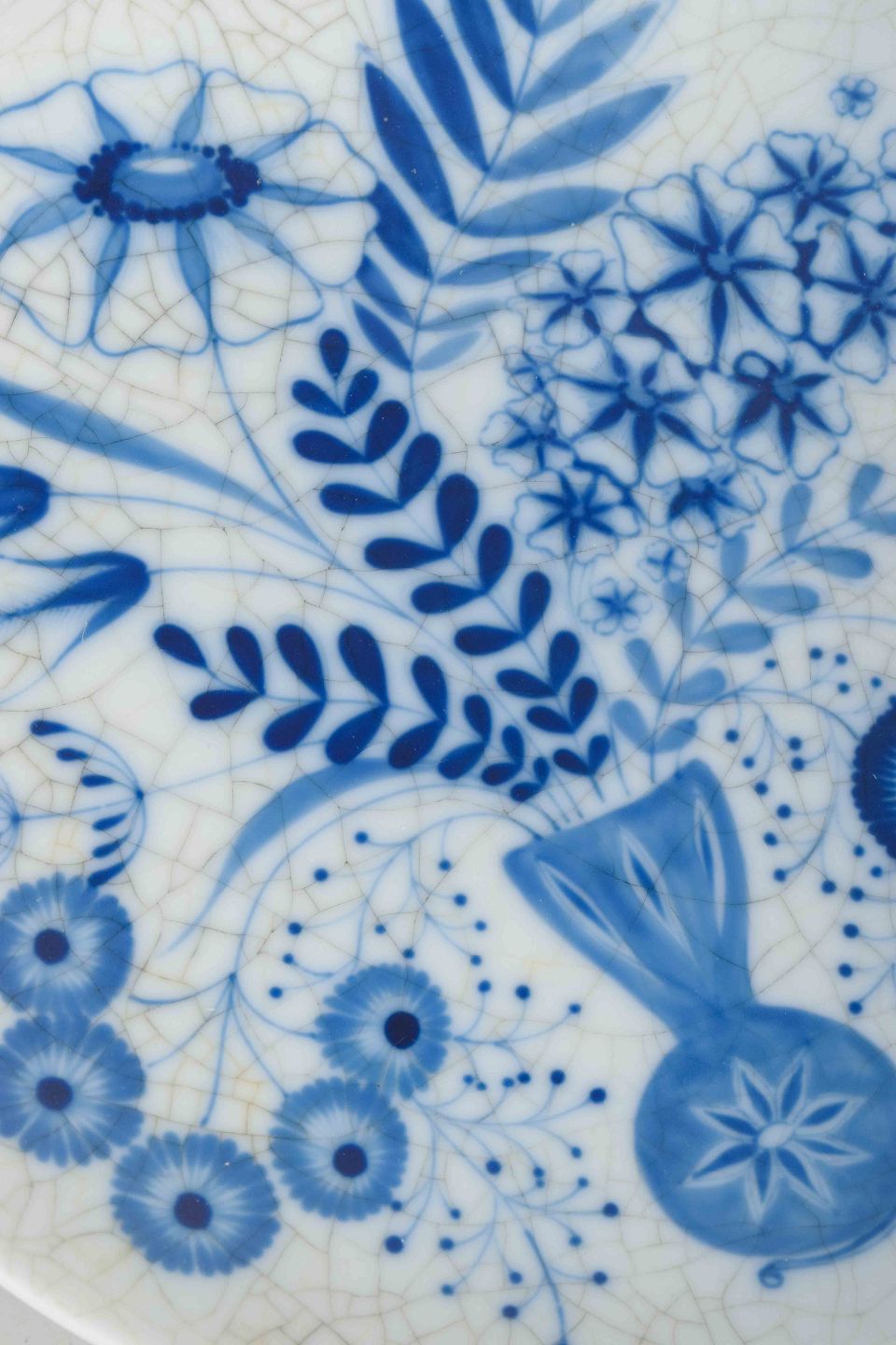 Round plate in porcelain/faience with hand-painted blue decoration in organic floral and leaf motifs. Underglaze with pronounced crackle. Marked “Arabia Unika – Made in Finland” on the reverse.