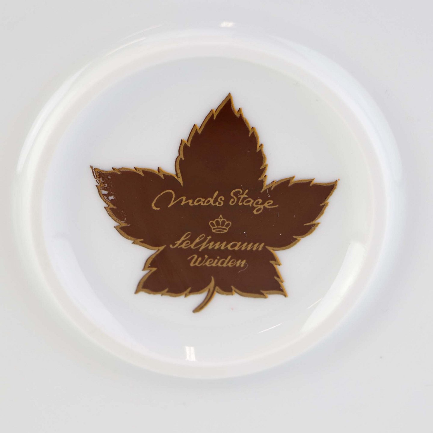 Jagtstellet er i glat hvidt porcelæn med gyldenbrun kantdekoration og motiver af forskellige vilde danske dyr i deres naturlige miljø. Stellet er holdt i dæmpede varme efterårsfarver.
