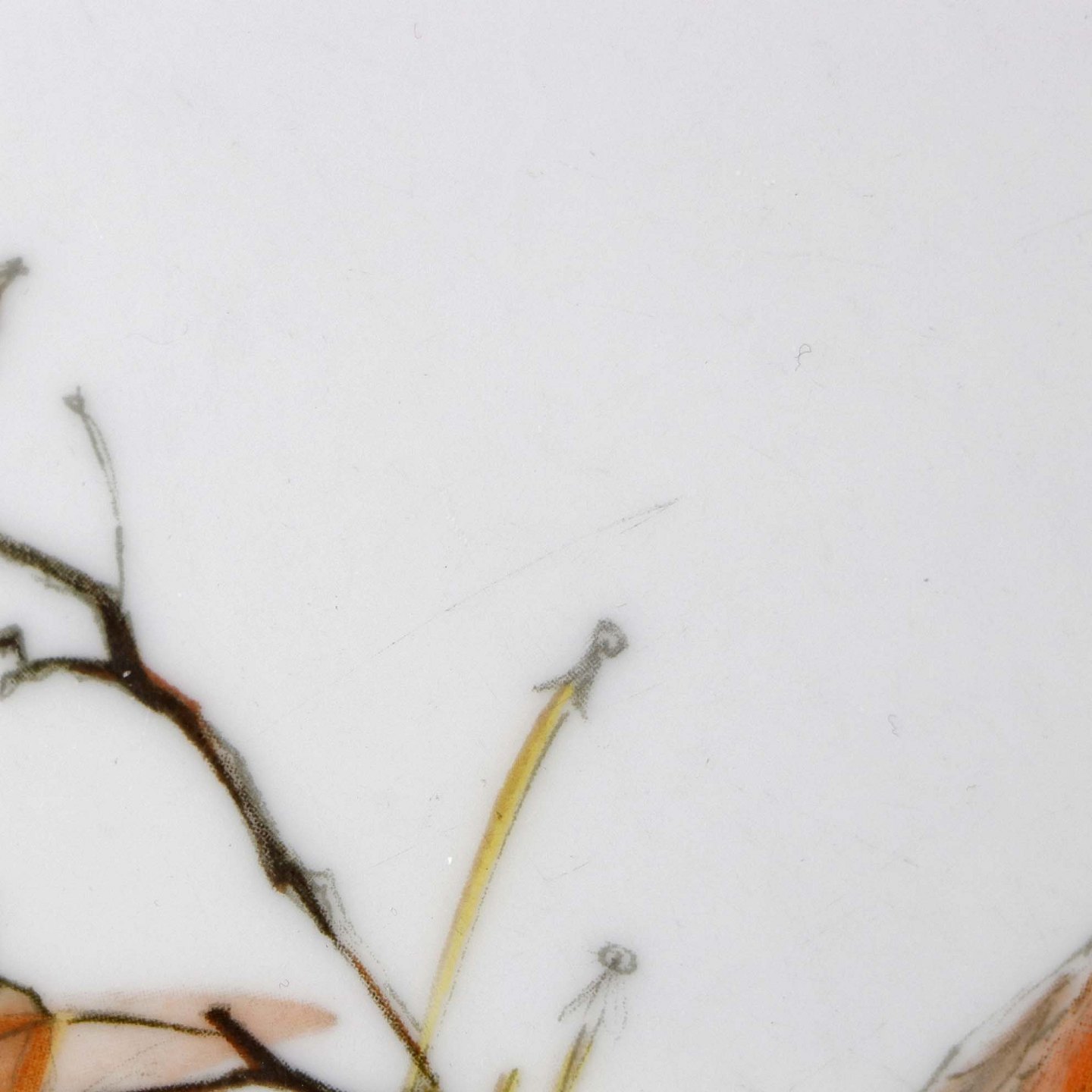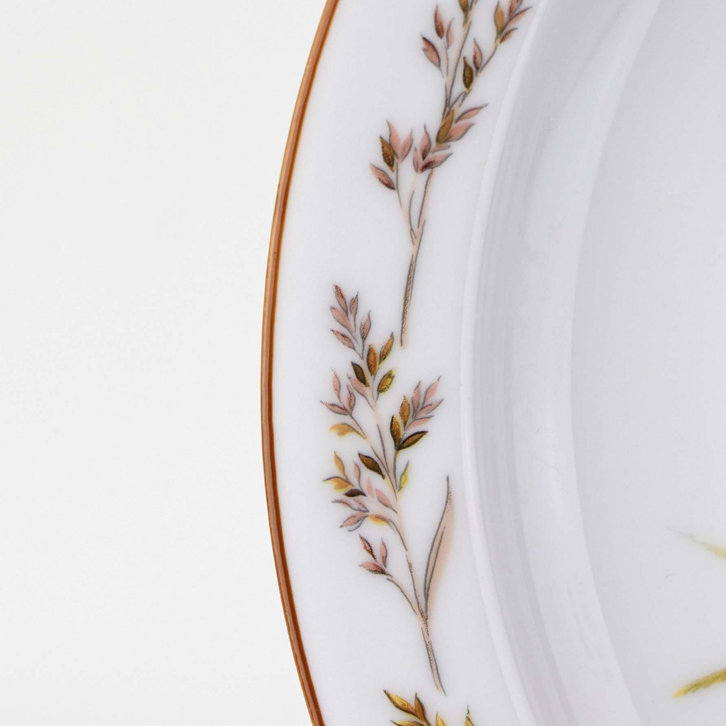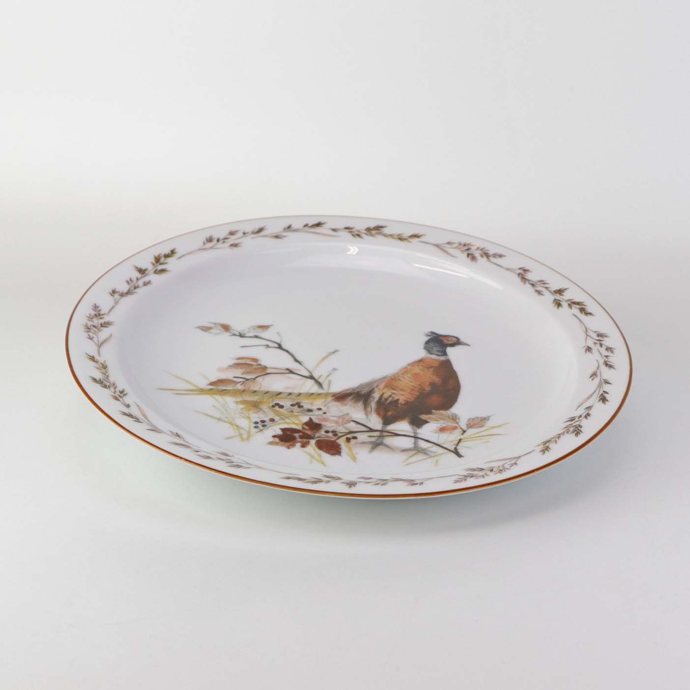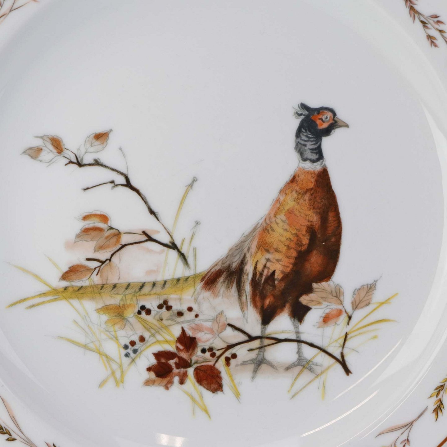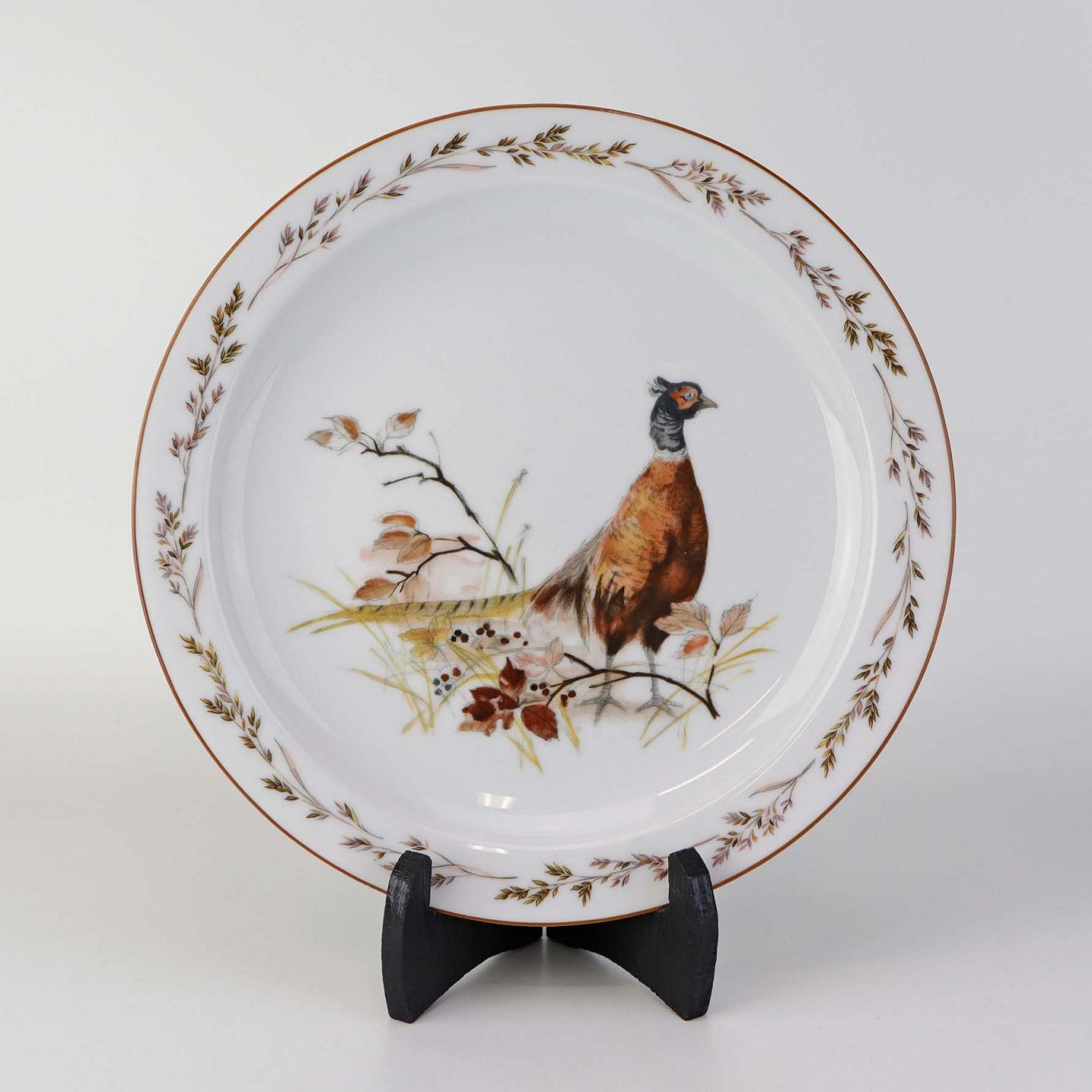 Text available in Danish: Flad middagstallerken i porcelæn med motiv af en fasan fra stellet Jagtstel.