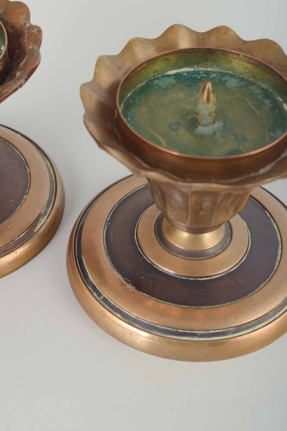 Solid brass candlesticks with circular base and geometric ring decorations, typical of the period.