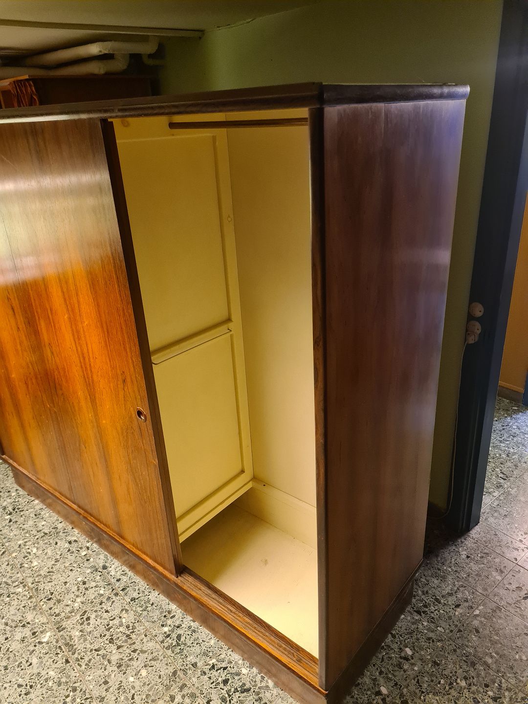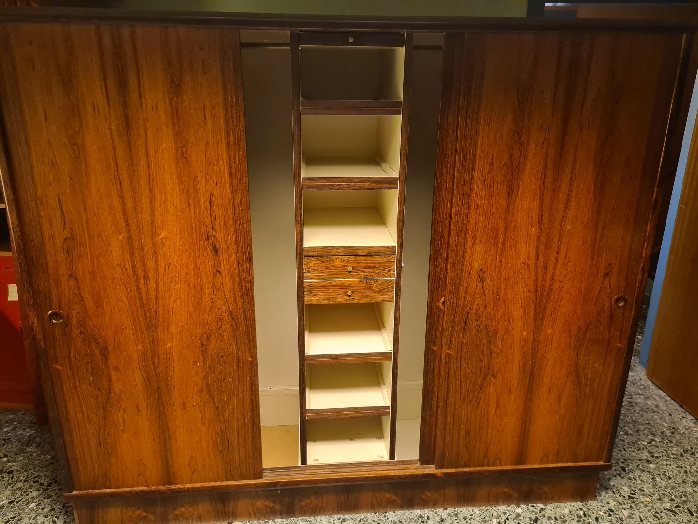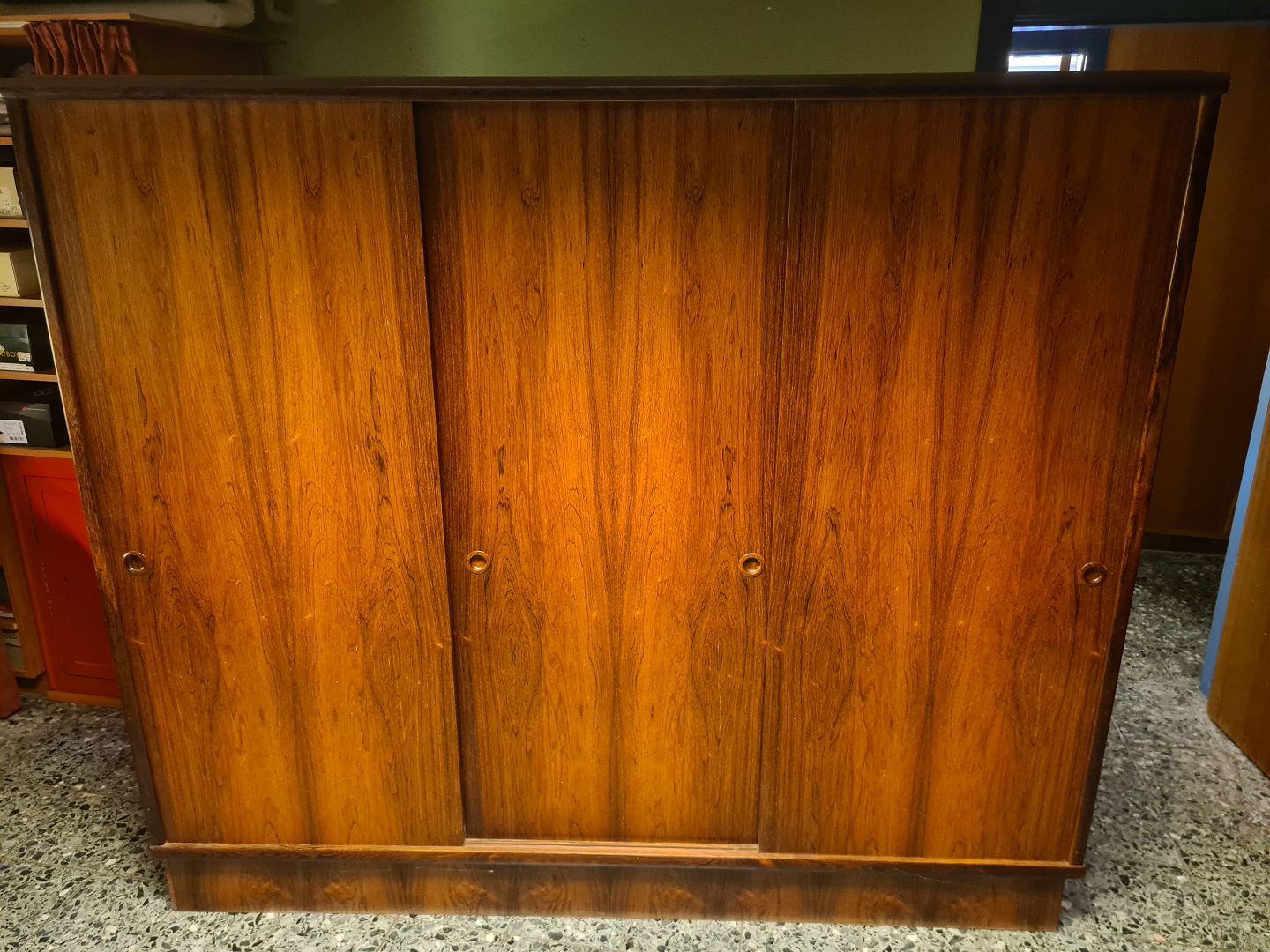 3 dørs skydelåge klædeskab fra 1960'erne i finéret palisander. Fremstår uden overskab, og med uoriginal bund i venstre side (billede) plus et par skruehuller ligeledes i venstre side. (Billede)