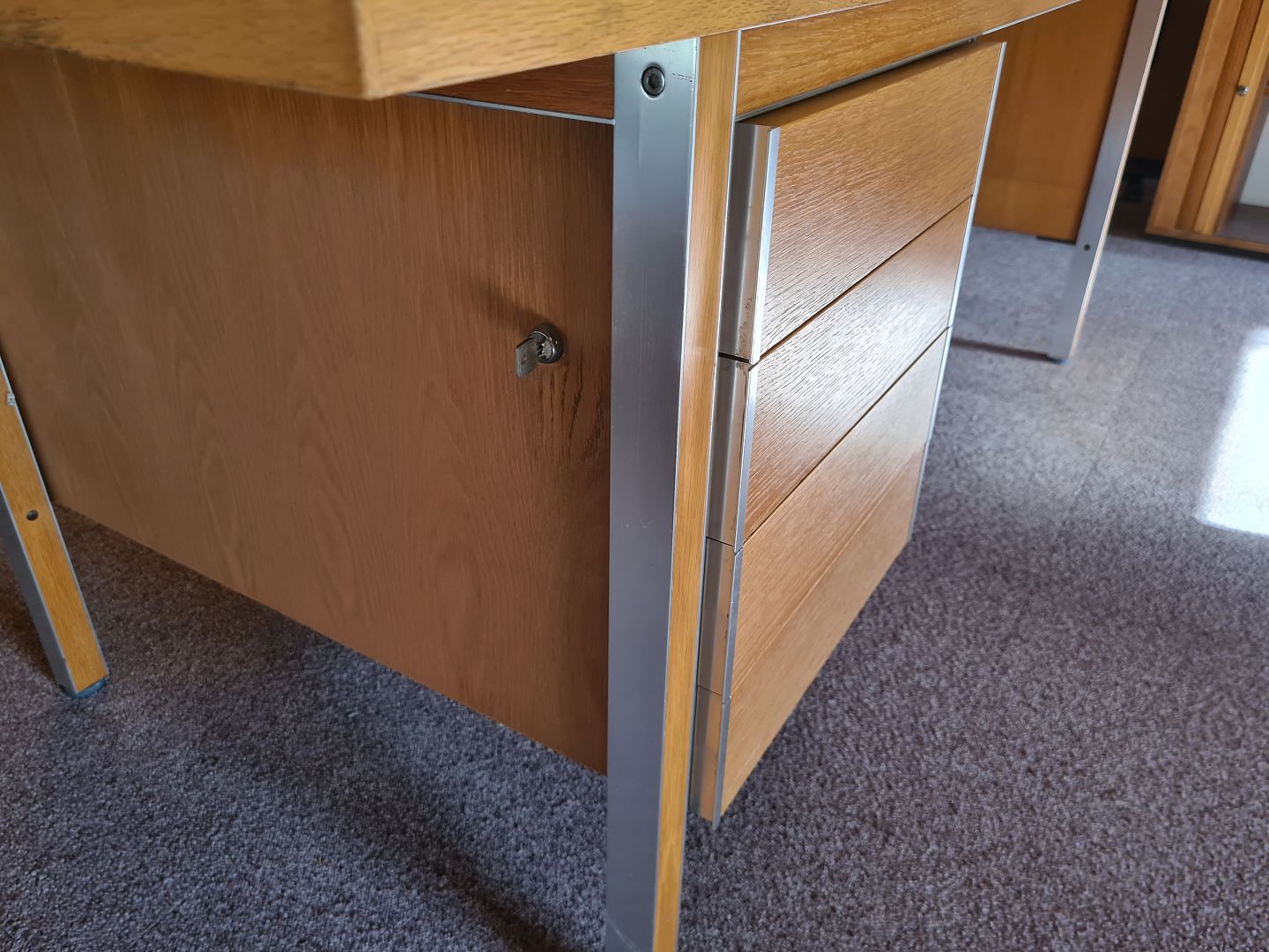 Stort Skrivebord fra 1980'erne i eg og aluminium. Fremstår pænt, velholdt og udmærket funktionsdygtigt. Dog med meget let afblegning på bordpladen efter en skrivemåtte. (Ses på billede)